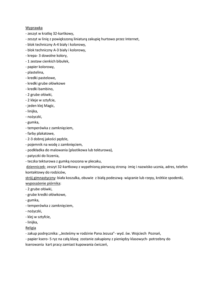 Wyprawka - zeszyt w kratkę 32-kartkowy, - zeszyt w linię z powiększoną liniaturą zakupię hurtowo przez Internet, - blok techniczny A-4 biały i kolorowy, - blok techniczny A-3 biały i kolorowy, - krepa- 3 dowolne kolory, - 1 zestaw cienkich bibułek, - papier kolorowy, - plastelina, - kredki pastelowe, - kredki grube ołówkowe - kredki bambino, - 2 grube ołówki, - 2 kleje w sztyfcie, - jeden klej Magic, - linijka, - nożyczki, - gumka, - temperówka z zamknięciem, - farby plakatowe, - 2-3 dobrej jakości pędzle, - pojemnik na wodę z zamknięciem, - podkładka do malowania (plastikowa lub tekturowa), - patyczki do liczenia, - teczka tekturowa z gumką noszona w plecaku, dzienniczek- zeszyt 32-kartkowy z wypełnioną pierwszą stroną- imię i nazwisko ucznia, adres, telefon kontaktowy do rodziców, strój gimnastyczny: biała koszulka, obuwie z białą podeszwą- wiązanie lub rzepy, krótkie spodenki, wyposażenie piórnika: - 2 grube ołówki, - grube kredki ołówkowe, - gumka, - temperówka z zamknięciem, - nożyczki, - klej w sztyfcie, - linijka, Religia - zakup podręcznika: „Jesteśmy w rodzinie Pana Jezusa”- wyd. św. Wojciech Poznań, - papier ksero- 5 ryz na całą klasę zostanie zakupiony z pieniędzy klasowych- potrzebny do kserowania kart pracy zamiast kupowania ćwiczeń,