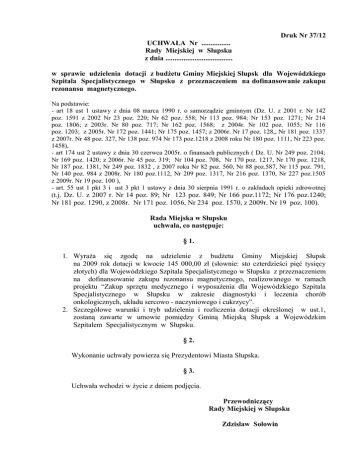 Druk Nr 37/12 UCHWAŁA Nr ................ Rady Miejskiej w Słupsku z dnia ..................................... w sprawie udzielenia dotacji z budżetu Gminy Miejskiej Słupsk dla Wojewódzkiego Szpitala Specjalistycznego w Słupsku z przeznaczeniem na dofinansowanie zakupu rezonansu magnetycznego. Na podstawie: - art 18 ust 1 ustawy z dnia 08 marca 1990 r. o samorządzie gminnym (Dz. U. z 2001 r. Nr 142 poz. 1591 z 2002 Nr 23 poz. 220; Nr 62 poz. 558; Nr 113 poz. 984; Nr 153 poz. 1271; Nr 214 poz. 1806; z 2003r. Nr 80 poz. 717; Nr 162 poz. 1568; z 2004r. Nr 102 poz. 1055; Nr 116 poz. 1203; z 2005r. Nr 172 poz. 1441; Nr 175 poz. 1457; z 2006r. Nr 17 poz. 128,, Nr 181 poz. 1337 z 2007r. Nr 48 poz. 327, Nr 138 poz. 974 Nr 173 poz.1218 z 2008 roku Nr 180 poz. 1111, Nr 223 poz. 1458), - art 174 ust 2 ustawy z dnia 30 czerwca 2005r. o finansach publicznych ( Dz. U. Nr 249 poz. 2104; Nr 169 poz. 1420; z 2006r. Nr 45 poz. 319; Nr 104 poz. 708, Nr 170 poz. 1217, Nr 170 poz. 1218, Nr 187 poz. 1381, Nr 249 poz. 1832 , z 2007 roku Nr 82 poz. 560, Nr 88 poz.587, Nr 115 poz. 791, Nr 140 poz. 984 z 2008r. Nr 180 poz.1112, Nr 209 poz. 1317, Nr 216 poz. 1370, Nr 227 poz.1505 z 2009r. Nr 19 poz. 100 ), - art. 55 ust 1 pkt 3 i ust 3 pkt 1 ustawy z dnia 30 sierpnia 1991 r. o zakładach opieki zdrowotnej (t.j. Dz. U. z 2007 r. Nr 14 poz. 89; Nr 123 poz. 849; Nr 166 poz.1172; Nr 176 poz.1240; Nr 181 poz. 1290, z 2008r. Nr 171 poz. 1056, Nr 234 poz. 1570, z 2009r. Nr 19 poz. 100). Rada Miejska w Słupsku uchwala, co następuje: § 1. 1. Wyraża się zgodę na udzielenie z budżetu Gminy Miejskiej Słupsk na 2009 rok dotacji w kwocie 145 000,00 zł (słownie: sto czterdzieści pięć tysięcy złotych) dla Wojewódzkiego Szpitala Specjalistycznego w Słupsku z przeznaczeniem na dofinansowanie zakupu rezonansu magnetycznego, realizowanego w ramach projektu “Zakup sprzętu medycznego i wyposażenia dla Wojewódzkiego Szpitala Specjalistycznego w Słupsku w zakresie diagnostyki i leczenia chorób onkologicznych, układu sercowo - naczyniowego i cukrzycy”. 2. Szczegółowe warunki i tryb udzielenia i rozliczenia dotacji określonej w ust.1, zostaną zawarte w umowie pomiędzy Gminą Miejską Słupsk a Wojewódzkim Szpitalem Specjalistycznym w Słupsku. § 2. Wykonanie uchwały powierza się Prezydentowi Miasta Słupska. § 3. Uchwała wchodzi w życie z dniem podjęcia. Przewodniczący Rady Miejskiej w Słupsku Zdzisław Sołowin Uzasadnienie 1. Przedstawienie istniejącego stanu w dziedzinie, która ma być normowana. Na podstawie art.55 ust 3 ustawy o zakładach opieki zdrowotnej z dnia 30 sierpnia 1991 roku zakłady opieki zdrowotnej mogą bezpośrednio otrzymać dotacje na remonty i inwestycje w tym zakup aparatury i sprzętu medycznego od organu jednostki samorządu terytorialnego niebędącego organem założycielskim zakładu. Zgodnie z wnioskiem Wojewódzkiego Szpitala Specjalistycznego w Słupsku do Wieloletniego Programu Inwestycyjnego na 2009 - 2012 w budżecie miasta Słupska zostały zabezpieczone środki finansowe w wysokości 145 000,00 złotych z przeznaczeniem na dofinansowanie zakupu sprzętu medycznego, realizowanego w ramach projektu “Zakup sprzętu medycznego i wyposażenia dla Wojewódzkiego Szpitala Specjalistycznego w Słupsku w zakresie diagnostyki i leczenia chorób onkologicznych, układu sercowo - naczyniowego i cukrzycy”. 2. Wyjaśnienie potrzeb i celu podjęcia uchwały. Wojewódzki Szpital Specjalistyczny w Słupsku złożył stosowny wniosek do Wieloletniego Programu Inwestycyjnego z prośbą o dofinansowanie zakupu sprzętu medycznego w latach 2009 - 2010 na łączną kwotę 350 000,00 zł. realizowanego w ramach projektu pn. “Zakup sprzętu medycznego i wyposażenia dla Wojewódzkiego Szpitala Specjalistycznego w Słupsku w zakresie diagnostyki i leczenia chorób onkologicznych, układu sercowo - naczyniowego i cukrzycy”. W 2009 roku na zakup sprzętu, zostanie przekazana kwota w wysokości 145 000,00 zł W celu uruchomienia środków finansowych z budżetu miasta Słupska, koniecznym jest wyrażenie zgody Rady Miejskiej na udzielenie dotacji dla Wojewódzkiego Szpitala Specjalistycznego w Słupsku. 3. Wskazanie różnic między dotychczasowym a projektowanym stanem prawnym. Samorząd Miasta Słupska sukcesywnie wspiera działalność Wojewódzkiego Szpitala Specjalistycznego w Słupsku. Poprzez dofinansowanie zakupów inwestycyjnych Szpitala. W zamian mieszkańcy miasta mają możliwość korzystania ze świadczeń medycznych realizowanych zgodnie z obowiązującymi standardami i wymogami Unii Europejskiej. Łączna wysokość środków finansowych przekazanych Szpitalowi na realizację zakupów inwestycyjnych w latach 2004 - 2008 wyniosła 2 819 350,00 zł 4. Charakterystyka przewidywanych skutków społecznych i gospodarczych. Dofinansowanie zakupu rezonansu magnetycznego dla Wojewódzkiego Szpitala Specjalistycznego w Słupsku pozwoli na realizację świadczeń na terenie miasta Słupska i zmniejszenie kolejek osób oczekujących na wykonanie badania. Rezonans magnetyczny zostanie zakupiony w listopadzie 2009 roku i zostanie zamontowany w pomieszczeniach nowego szpitala. W grudniu br. Szpital planuje przyjąć pierwszych pacjentów na diagnostykę. 5. Skutki finansowe związane z wejściem w życie uchwały. Z budżetu Gminy Miejskiej Słupsk zostaną przekazane środki finansowe w wysokości 145 000,00 złotych z przeznaczeniem na dofinansowanie zakupu rezonansu magnetycznego. Całkowity koszt zakupu urządzenia 4 533 026,00 zł. 6. Żródła finansowania. Budżet Gminy Miejskiej Słupsk na 2009 rok. Budżet Samorządu Województwa Pomorskiego na 2009 rok.