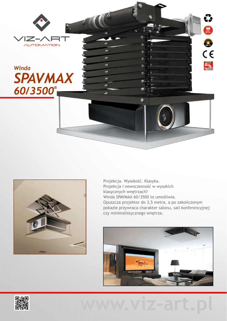 Winda SPAVMAX 60/3500 ® Projekcja. Wysokość. Klasyka. Projekcja i nowoczesność w wysokich klasycznych wnętrzach? Winda SPAVMAX 60/3500 to umożliwia. Opuszcza projektor do 3,5 metra, a po zakończonym pokazie przywraca charakter salonu, sali konferencyjnej czy minimalistycznego wnętrza. www.viz-art.pl Winda SPAVMAX ® 60/3500 Przeznaczenie: •Świątynie, pałace •sale bankietowe, muzea •uniwersytety, aule •centra konferencyjne •Systemy Centralnego Sterowania Troszczymy się o ekologię. Segregujemy pozostałości poprodukcyjne. Szanujemy Twój czas. Produkty wykonane są precyzyjnie, zapewniając szybki montaż. Produkcja wykonywana w Polsce. Nie importujemy produktów z Azji. Bezpieczeństwo użytkowania dla dzieci i osób starszych. Produkty wykonywane przez osoby dorosłe. Nie popieramy pracy dzieci. Zastosowania Winda SPAVMAX 60/3500 zalecana do wnętrz, gdzie po zakończonej projekcji oczekiwany jest oryginalny i niezakłócony styl wnętrza. Ceniona w pałacach, świątyniach i wysokich wnętrzach. Ciesząca się uznaniem konserwatorów zabytków i architektów. Instalacja Windy SPAVMAX 60/3500 to sposób na wprowadzenie nowoczesności do zabytkowych wnętrz. SPAVMAX to 100 % sukces i bezpieczeństwo każdego projektu. Winda SPAVMAX 60/3500 Wysięg 3500 mm Udźwig 60 kg Masa własna 55 kg Gabaryt windy •D 750 mm •W 650 mm Przestrzeń instalacyjna 591 mm + H projektora Regulacja nastawień •3 płaszczyzny •wyłączniki krańcowe góra / dół Sterowanie •włącznik klawiszowy •opcja: IR, RC, TRIGGER Zasilanie 230 V / 50 Hz Pobór mocy 100 W Ciągła praca silnika 4 minuty Napęd •SOMFY •cicha praca 42dB Kolor czarny Montaż •3 punktowy stabilny system W zestawie •adapter do projektora •ramka sufitowa •włącznik klawiszowy •szablon instalacyjny •instrukcja montażu •zestaw montażowy Bezpieczeństwo •zabezpieczenie termiczne, przeciążeniowe •hamulec bezpieczeństwa Gwarancja 5 lat Produkcja VIZ-ART Polska wersja 07/02.05.2014