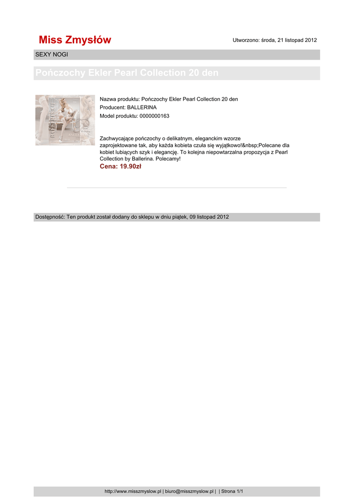 Miss Zmysłów Utworzono: środa, 21 listopad 2012 SEXY NOGI Pończochy Ekler Pearl Collection 20 den Nazwa produktu: Pończochy Ekler Pearl Collection 20 den Producent: BALLERINA Model produktu: 0000000163 Zachwycające pończochy o delikatnym, eleganckim wzorze zaprojektowane tak, aby każda kobieta czuła się wyjątkowo! Polecane dla kobiet lubiących szyk i elegancję. To kolejna niepowtarzalna propozycja z Pearl Collection by Ballerina. Polecamy! Cena: 19.90zł Dostępność: Ten produkt został dodany do sklepu w dniu piątek, 09 listopad 2012 http://www.misszmyslow.pl | [email protected] | | Strona 1/1