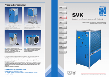 Przegląd produktów Chłodnica przepływowa Urządzenie do schładzania nagrzanej wody chłodzącej Gotowe do podłączenia urządzenia chłodzone powietrzem Wydajność chłodnicza od 15 do 130 kW VWK/1 - urządzenie do schładzania nagrzanej wody chłodzącej o wydajności chłodzenia od 2 do 15 kW, ze zbiornikiem i pompą. Kompaktowa budowa i wysoka dokładność temperatury. TRK – urządzenie zanurzeniowe do schładzania nagrzanych cieczy chłodząco-smarujących o wydajności chłodzenia od 2 do 75 kW. Łatwa konserwacja i czyszczenie. Urządzenie stołowe Chłodnica przepływowa LWK - chłodnica powietrzno-wodna bez agregatu chłodniczego o wydajności chłodzenia 2 lub 2,5 kW, ze zbiornikiem i pompą. Niedrogie rozwiązanie dla zastosowań dla wyższych temperatur wody. CHILLY - urządzenie do schładzania nagrzanej wody chłodzącej o wydajności chłodzenia od 0,2 do 4,5 kW ze zbiornikiem i pompą. Niewielkie i niezawodne. Specjalne W naszym standardowym asortymencie produktów oferujemy rozwiązania do schładzania rozgrzanych cieczy we wszystkich rodzajach zastosowań przemysłowych. Nasze maszyny dostępne są w formie kompaktowej lub splitowej, chłodzone powietrzem lub wodą. Dostępne są zarówno chłodnice przepływowe i rozszerzenia z nadającymi się do czyszczenia płytowymi wymiennikami ciepła, jak i wersje dla specjalnych napięć. Nasz zespół inżynierów i pracowników technicznych w dziale zbytu służy Państwu radą. Czekamy na Państwa zapytania! HYFRA Industriekühlanlagen GmbH Industriepark 54 · D-56593 Krunkel Тел.: 0 26 87 / 8 98-0 · Факс: 0 26 87 / 8 98-25 · e-mail: [email protected] www.hyfra-pedia.de Kompetencja i doświadczenie w zakresie urządzeń do schładzania nagrzanego chłodziwa SVK Urządzenie do schładzania rozgrzanej wody chłodzącej Dane techniczne Wydajność chłodnicza Wyposażenie seryjne: 쎲 Obudowa z ramą ze stali szlachetnej 쎲 Parownik współosiowy 쎲 Komunikat o zakłóceniu zbiorczym 쎲 Bezpotencjałowy komunika o zakłóceniu 쎲 Termostat zbiornik parownika przeciwzamrożeniowy 쎲 Manometr w zasilaniu 쎲 Wszystkie napędy o klasie ochrony min. IP 54 쎲 Wszystkie standardowe urządzenia dopuszczone do temperatury otoczenia maks. 42° C 쎲 Nowoczesna technologia ekonomicznych i cicho pracujących sprężarek spiralnych 쎲 Skraplacz z miedzianymi rurkami wewnętrznie rowkowanymi i aluminiowymi lamelami 쎲 Zawór kulowy odcinający do opróżniania zbiornika 쎲 Regulacja temperatury cyfrowym termostatem z histerezą temperatury +/- 1,0 K 쎲 Ograniczniki wysokiego i niskiego ciśnienia z certyfikatem TÜV w obiegu chłodniczym 쎲 Zawór obejściowy dla ochrony pompy 쎲 Wyłącznik pływakowy zabezpieczający przed suchobiegiem 쎲 Zewnętrzne włączenie w serii z 3-stopniowym włącznikiem 쎲 Cicha praca (gwiazda-trójkąt) 쎲 Pompa CH wraz z uszczelnieniem pierścieniem ślizgowym ze stopu twardego Temperatura Powietrze otaczające Woda Wydajność chłodnicza w kW Zbiornik parownika łatwo dostępny od góry przez zdjęcie pokrywy Specyfikacja Rodzaj sprężarki (ilość) Pobór mocy sprężarki kW Maks. łączna moc pobierana kW Maks. łączny prąd pobierany A Maks. przepływ powietrza m3/h Pojemność zbiornika na wodę l Ciśnienie wejściowe pompy bar Opcje: 쎲 쎲 쎲 쎲 쎲 쎲 쎲 쎲 쎲 쎲 쎲 쎲 쎲 Napięcie sterownicze DC Przełącznik na czas zimowy (0, gwiazda, trójkąt) Temperatura medium maks. +40° C Zawór odcinający przed pompą Oznaczenie końca żył Wtyczka typu Harting Czynnik chłodniczy R134A Zawór zwrotny + zawór magnetyczny (na zewnątrz) Histereza temperatury od +/- 3,0 K Filtr powietrza Automatyczne wyłączenie urządzenia w przypadku alarmu temperatury Pompa CR dla zewnętrznego podwyższenia ciśnienia wraz z uszczelnieniem pierścieniem ślizgowym ze stopu twardego Rury ze stali szlachetnej dla pojemności* m3/h Rodzaj pompy zasilanie/powró cal Świeża woda cal Długość (dł.) mm Szerokość (sz.) mm Wysokość (wys.) mm Ciężar (ok.) kg Napięcie przyłączeniowe 3/PE/400 V/50 Hz. Napięcie sterownicze 24 V AC. Wszystkie parametry wydajności obowiązują dla maszyn w temperaturze otoczenia maks. + 42° C. *Dla wydajności chłodniczej w temperaturze otoczenia 32° C i temperatury medium 15° C oraz temperatury Delta 5 K (na zasilaniu i powrocie wody). Zmiany techniczne zastrzeżone. Kompetencja i doświadczenie w zakresie urządzeń do schładzania nagrzanego chłodziwa