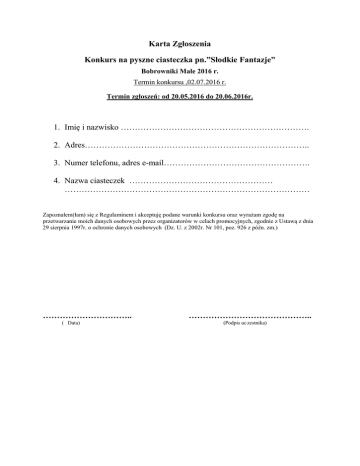 Karta Zgłoszenia Konkurs na pyszne ciasteczka pn.”Słodkie Fantazje” Bobrowniki Małe 2016 r. Termin konkursu ,02.07.2016 r. Termin zgłoszeń: od 20.05.2016 do 20.06.2016r. 1. Imię i nazwisko …………………………………………………………. 2. Adres…………………………………………………………………….. 3. Numer telefonu, adres e-mail……………………………………………. 4. Nazwa ciasteczek …………………………………………… …………………………………………………………………………… Zapoznałem(łam) się z Regulaminem i akceptuję podane warunki konkursu oraz wyrażam zgodę na przetwarzanie moich danych osobowych przez organizatorów w celach promocyjnych, zgodnie z Ustawą z dnia 29 sierpnia 1997r. o ochronie danych osobowych (Dz. U. z 2002r. Nr 101, poz. 926 z późn. zm.) ………………………….. ( Data) …………………………………….. (Podpis uc zestnika)