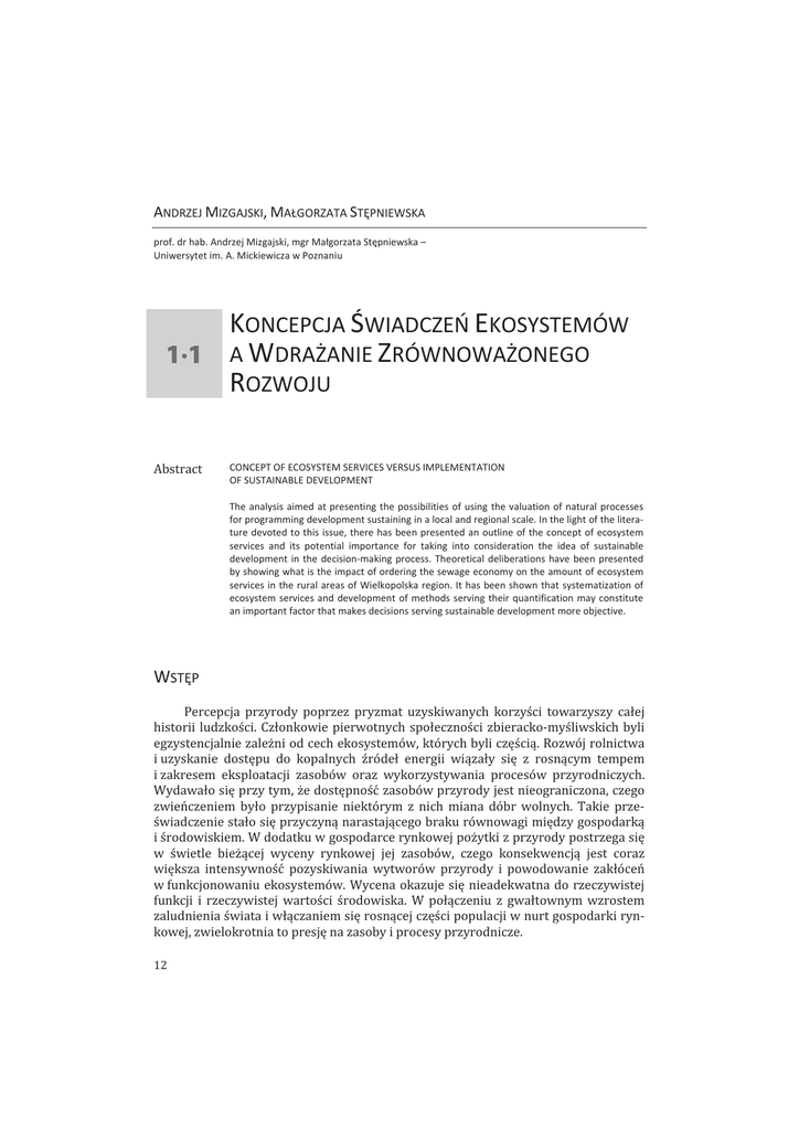 ANDRZEJMIZGAJSKI,MABGORZATAST%PNIEWSKA prof.drhab.AndrzejMizgajski,mgrMaųgorzataStħpniewska– Uniwersytetim.A.MickiewiczawPoznaniu KONCEPCJA_WIADCZEFEKOSYSTEMÓW 1•1 AWDRAANIEZRÓWNOWAONEGO ROZWOJU Abstract CONCEPTOFECOSYSTEM SERVICESVERSUSIMPLEMENTATION OFSUSTAINABLEDEVELOPMENT Theanalysisaimedatpresentingthepossibilitiesofusingthevaluationofnaturalprocesses forprogrammingdevelopmentsustaininginalocalandregionalscale.InthelightoftheliteraͲ turedevotedtothisissue,therehasbeenpresentedanoutlineoftheconceptofecosystem services and its potential importance for taking into consideration the idea of sustainable development in the decisionͲmaking process. Theoretical deliberations have been presented byshowingwhatistheimpactoforderingthesewageeconomyontheamountofecosystem servicesintheruralareasofWielkopolskaregion.Ithasbeenshownthatsystematizationof ecosystemservicesanddevelopmentofmethodsservingtheirquantificationmayconstitute animportantfactorthatmakesdecisionsservingsustainabledevelopmentmoreobjective. WST%P Percepcja przyrody poprzez pryzmat uzyskiwanych korzyäci towarzyszy caÏej historii ludzkoäci. CzÏonkowie pierwotnych spoÏecznoäci zbieracko-myäliwskich byli egzystencjalnie zaleĂni od cech ekosystemów, których byli cz¸äci¦. Rozwój rolnictwa i uzyskanie dost¸pu do kopalnych ĀródeÏ energii wi¦zaÏy si¸ z rosn¦cym tempem i zakresem eksploatacji zasobów oraz wykorzystywania procesów przyrodniczych. WydawaÏo si¸ przy tym, Ăe dost¸pnoä© zasobów przyrody jest nieograniczona, czego zwieÑczeniem byÏo przypisanie niektórym z nich miana dóbr wolnych. Takie przeäwiadczenie staÏo si¸ przyczyn¦ narastaj¦cego braku równowagi mi¸dzy gospodark¦ i ärodowiskiem. W dodatku w gospodarce rynkowej poĂytki z przyrody postrzega si¸ w äwietle bieæcej wyceny rynkowej jej zasobów, czego konsekwencj¦ jest coraz wi¸ksza intensywnoä© pozyskiwania wytworów przyrody i powodowanie zakÏóceÑ w funkcjonowaniu ekosystemów. Wycena okazuje si¸ nieadekwatna do rzeczywistej funkcji i rzeczywistej wartoäci ärodowiska. W poϦczeniu z gwaÏtownym wzrostem zaludnienia äwiata i wϦczaniem si¸ rosn¦cej cz¸äci populacji w nurt gospodarki rynkowej, zwielokrotnia to presj¸ na zasoby i procesy przyrodnicze. 12 Wymienione uwarunkowania ograniczaj¦ skutecznoä© tradycyjnego podejäcia do ochrony przyrody, opartego na wprowadzaniu i egzekwowaniu rygorów prawnych i standardów etycznych. Zachowania wspóÏczesnego czÏowieka wobec przyrody s¦ ksztaÏtowane przez przesÏanki ekonomiczne, dlatego zasadne jest przyj¸cie ekonomicznej perspektywy ogl¦du kwestii ärodowiskowych. W oparciu o takie podejäcie w ostatnich latach rozwijana jest koncepcja metodologiczna, która polega na przedstawieniu metabolizmu ekosystemów w kategoriach materialnych lub niematerialnych poĂytków wynikaj¦cych dla czÏowieka, okreälanych jako äwiadczenia ekosystemów. Pewna cz¸ä© äwiadczeÑ ma znaczenie egzystencjalne, rozstrzygaj¦c o dalszych losach gatunku ludzkiego, przez co nie daje moĂliwoäci ich relatywizowania; innym natomiast moĂna przypisa© okreälone wartoäci ekonomiczne. Uwzgl¸dnienie takiej wymowy procesów przyrodniczych ma bezpoärednie znaczenie dla wprowadzania w Ăycie idei zrównowaĂonego rozwoju, odnoszonej do harmonizowania ekologicznych, ekonomicznych i spoÏecznych aspektów aktywnoäci czÏowieka. _WIADCZENIAEKOSYSTEMÓWWRELACJIDOIDEIZRÓWNOWAONEGO ROZWOJU.UJ%CIETEORETYCZNE Koncepcja äwiadczeÑ ekosystemów stanowi obecnie najbardziej spójne podejäcie o charakterze operacyjnym, które sÏuĂy racjonalizacji korzystania przez czÏowieka z procesów i zasobów przyrodniczych.1 Obejmuje ono caÏoksztaÏt korzyäci osi¦ganych przez czÏowieka z metabolizmu ekosystemów. NaleĂy przy tym opiera© si¸ pokusie bezrefleksyjnego stosowania okreälenia „usÏugi ekosystemów” jako tÏumaczenia angloj¸zycznego terminu ecosystem services. Termin „äwiadczenia” jest bardziej adekwatny. Jest on pojemniejszy, poniewaĂ obejmuje, obok poĂytków niematerialnych, równieĂ dobra materialne powstaÏe w wyniku metabolizmu ekosystemów. Ponadto, w odróĂnieniu od okreälenia „usÏugi”, poj¸cie „äwiadczenia” nie sugeruje równoprawnoäci usÏugodawcy i usÏugobiorcy, o której w relacjach czÏowieka z ekosystemami nie moĂe by© mowy. Poj¸cie „äwiadczenia ekosystemów” wskazuje, Ăe uzyskiwane korzyäci wynikaj¦ z samoistnego funkcjonowania ukÏadów przyrodniczych (jakkolwiek zwykle modyfikowanego antropogenicznie), nie s¦ one natomiast wynikiem dziaÏania ekosystemów na zamówienie czÏowieka. Poznawcza i aplikacyjna atrakcyjnoä© wyraĂania metabolizmu przyrody i jego efektów w kategoriach ekonomicznych jest dostrzegana przez badaczy od kilku dziesi¸cioleci, jednak w ostatnich latach szybko zwi¸ksza si¸ zainteresowanie t¦ problematyk¦. Dla uformowania koncepcji äwiadczeÑ ekosystemów szczególne znaczenie miaÏo opublikowanie artykuÏu na temat ich wartoäci w skali äwiatowej w kontekäcie kapitaÏu przyrodniczego Ziemi.2 Autorzy wyróĂnili siedemnaäcie funkcji ekosystemów, które przypisali do odpowiadaj¦cych im äwiadczeÑ ekosystemów, wϦczaj¦c 1 L. Ryszkowski, Adaptacja dziaÏalnoäci ekonomicznej do procesu metabolizmu ekosystemów podstaw¦zrównowaĂonegorozwoju, w: PraceNaukoweAkademiiEkonomicznejweWrocÏawiu. ZrównowaĂony rozwój w teorii ekonomiii w praktyce, red. A. Graczyk, Wyd. Akademii Ekonomicznej, WrocÏaw 2007, s. 186. 2 R. Constanza et al., The value of the world’s ecosystem services and natural capital, “Nature” 1997, No. 387, p. 253. 13 w ich zakres zarówno poĂytki niematerialne, jak i dobra materialne, b¸d¦ce wynikiem metabolizmu ukÏadów przyrodniczych. Inn¦ klasyfikacj¸ äwiadczeÑ przedstawia praca R.S. de Groot i innych3, w której wyróĂnia si¸ funkcje ekosystemów, do których odnosi si¸ oddzielnie äwiadczenia i dobra uzyskiwane od ekosystemów, a obie kategorie przedstawia 