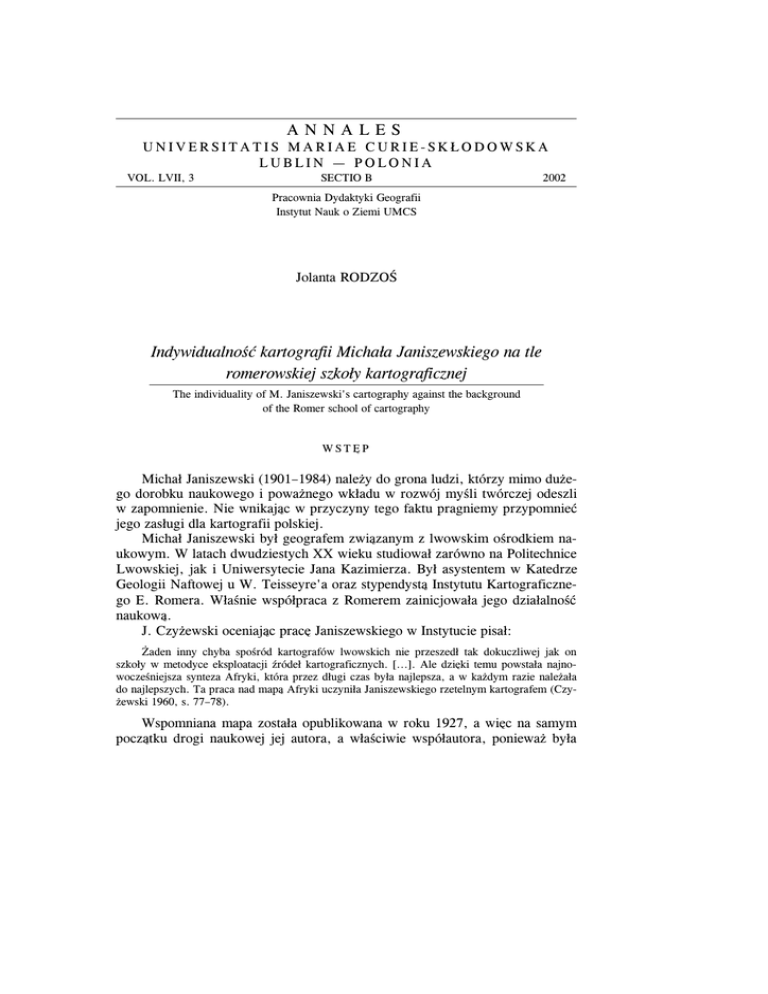 ANNALES UNIVERSITATIS MARIAE CURIE-SK£ODOWSKA LUBLIN POLONIA VOL. LVII, 3 SECTIO B 2002 Pracownia Dydaktyki Geografii Instytut Nauk o Ziemi UMCS Jolanta RODZO Indywidualnoæ kartografii Micha³a Janiszewskiego na tle romerowskiej szko³y kartograficznej The individuality of M. Janiszewski's cartography against the background of the Romer school of cartography WSTÊP Micha³ Janiszewski (19011984) nale¿y do grona ludzi, którzy mimo du¿ego dorobku naukowego i powa¿nego wk³adu w rozwój myli twórczej odeszli w zapomnienie. Nie wnikaj¹c w przyczyny tego faktu pragniemy przypomnieæ jego zas³ugi dla kartografii polskiej. Micha³ Janiszewski by³ geografem zwi¹zanym z lwowskim orodkiem naukowym. W latach dwudziestych XX wieku studiowa³ zarówno na Politechnice Lwowskiej, jak i Uniwersytecie Jana Kazimierza. By³ asystentem w Katedrze Geologii Naftowej u W. Teisseyre'a oraz stypendyst¹ Instytutu Kartograficznego E. Romera. W³anie wspó³praca z Romerem zainicjowa³a jego dzia³alnoæ naukow¹. J. Czy¿ewski oceniaj¹c pracê Janiszewskiego w Instytucie pisa³: ¯aden inny chyba sporód kartografów lwowskich nie przeszed³ tak dokuczliwej jak on szko³y w metodyce eksploatacji róde³ kartograficznych. [...]. Ale dziêki temu powsta³a najnowoczeniejsza synteza Afryki, która przez d³ugi czas by³a najlepsza, a w ka¿dym razie nale¿a³a do najlepszych. Ta praca nad map¹ Afryki uczyni³a Janiszewskiego rzetelnym kartografem (Czy¿ewski 1960, s. 7778). Wspomniana mapa zosta³a opublikowana w roku 1927, a wiêc na samym pocz¹tku drogi naukowej jej autora, a w³aciwie wspó³autora, poniewa¿ by³a 40 Jolanta RODZO ona sygnowana równie¿ nazwiskiem samego Romera. O rok wczeniej, w roku 1926, Janiszewski wyda³ wykonan¹ tak¿e pod okiem Mistrza, mapê przemys³u Polski. Na tym w³aciwie koñczy siê wspó³praca Janiszewskiego z Romerem i w ogóle jego zwi¹zek z Uniwersytetem Jana Kazimierza. W 1931 roku Janiszewski opuci³ Lwów i rozpocz¹³ samodzieln¹ ju¿ dzia³alnoæ w Warszawie. By³a to przede wszystkim dzia³alnoæ dydaktyczna, a jej owocem by³y g³ównie podrêczniki szkolne. Dopiero po kilku latach od pierwszych dowiadczeñ kartograficznych ukaza³y siê nastêpne opracowania z tego zakresu. By³a to fizyczna mapa Polski w wersji podrêcznej i konturowej (wydane odpowiednio w latach 1934 i 1935) oraz szkolny atlas geograficzny Polski (1938). Prawdziwy rozwój dzia³alnoci kartograficznej Janiszewskiego nast¹pi³ dopiero po II wojnie wiatowej. Z tego w³anie okresu pochodzi wiêksza czêæ jego dorobku kartograficznego, na który sk³adaj¹ siê mapy cienne, podrêczne, atlas Polski oraz szereg ilustracji kartograficznych zamieszczonych w podrêcznikach i zeszytach æwiczeñ. Wojna i jej polityczny fina³ po³o¿y³y kres dzia³alnoci Instytutu Kartograficznego im. E. Romera we Lwowie oraz Zjednoczonych Zak³adów Kartograficznych Ksi¹¿nica Atlas. W pewnym stopniu zosta³y one reaktywowane we Wroc³awiu. Znamienny wydaje siê fakt, ¿e w tych warunkach, kiedy na nowo organizowano polsk¹ dzia³alnoæ kartograficzn¹ i na nowo kompletowano nie tylko rodki finansowe i techniczne, ale przede wszystkim zespó³ pracowników, nie dosz³o do wspó³pracy naukowej Janiszewskiego z Romerem, chocia¿, jak wynika z wypowiedzi samego Janiszewskiego (1971), kontakty z Romerem utrzymywa³ a¿ do samej mierci Mistrza i zawsze odnosi³ siê do niego z ogromn¹ lojalnoci¹ i szacunkiem. Janiszewski pozosta³ zwi¹zany z orodkiem warszawskim. Pe³ni³ funkcjê kierownika dzia³u kartograficznego Pañstwowych Zak³adów Wydawnictw Szkolnych (19461953) oraz Zak³adu Kartografii Instytutu Geografii Polskiej Akademii Nauk (19531960). Wraz ze znanym jeszcze z okresu przedwojennego, znakomitym rysownikiem Tadeuszem Garlejem, stanowili niezale¿ny zespó³ autorski. Powstaje wiêc pytanie o cechy kartografii Janiszewskiego. Jaki by³ jej stosunek do kartografii Romerowskiej? Czy istniej¹ podobieñstwa miêdzy nimi? W jakim stopniu wa¿ne dla Janiszewskiego okaza³y siê dowiadczenia zdobyte podczas pracy w Instytucie Kartograficznym E. Romera? ZA£O¯ENIA ROMEROWSKIEJ SZKO£Y KARTOGRAFICZNEJ Zasady kartografii romerowskiej by³y ju¿ w literaturze niejednokrotnie omawiane (Romer 1908, 1928; Czy¿ewski 1960; Janiszewski 1971; Nowak 1982; W¹sowicz 1964). Nie widz¹c potrzeby ich szerszego opisu oraz dyskusji nad ich znaczeniem, przypomnimy tylko w punktach podstawowe za³o¿enia. Indywidualnoæ kartografii Micha³a Janiszewskiego na tle romerowskiej szko³y kartograficznej 41 Pozwoli to na ocenê dorobku kartograficznego Janiszewskiego w stosunku do koncepcji romerowskiej. Oto one: 1. Du¿a generalizacja treci map daj¹ca efekt tzw. pustej mapy. 2. Stosowanie czystej metody poziomicowej i unikanie oznaczeñ wysokoci n.p.m. 3. Przyjêcie poziomicy 300 m jako podstawowej w obrazowaniu stosunków wysokociowych poszczególnych kontynentów. 4. Têczowa skala barw hipsometrycznych. 5. Uprzywilejowanie metody izarytmicznej, tak¿e w prezentacji treci spo³eczno-gospodarczych. 6. Prostota symboliki kartograficznej. 7. Przestrzeganie wielokrotnoci podzia³ek dla map w ramach danego atlasu. 8. Konsekwencja w stosowaniu przyjêtych za³o¿eñ. Romer przedstawiaj¹c motywy swojej pracy kartograficznej na plan pierwszy wysuwa³ w¹tek dydaktyczny (1928). Wiêkszoæ jego map i atlasów, zw³aszcza w pocz¹tkowym okresie dzia³alnoci, zrodzi³a siê bowiem w odpowiedzi na potrzeby kszta³cenia geograficznego na ró¿nych poziomach edukacyjnych. Wynika z tego, ¿e u podstaw koncepcji kartograficznej Romera oprócz wzglêdów naukowych leg³y równie¿ zasady dydaktyczne, jak choæby zasada pogl¹dowoci, obiektywnoci czy porównawczego przedstawiania treci. DOROBEK KARTOGRAFICZNY M. JANISZEWSKIEGO I JEGO CECHY PRZEWODNIE Dorobek kartograficzny M. Janiszewskiego jest obszerny i ró¿norodny pod wzglêdem zakresu treci oraz form ich prezentacji. Sk³adaj¹ siê nañ przede wszystkim opracowania przeznaczon