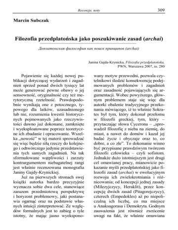 Recenzje, noty 309 Marcin Subczak Filozofia przedplatońska jako poszukiwanie zasad (archai) Доплатонская философия как поиск принципов (archai) Janina Gajda-Krynicka, Filozofia przedplatońska, PWN, Warszawa 2007, ss. 280 Pojawienie się każdej nowej publikacji dotyczącej wydarzeń i zagadnień sprzed ponad dwóch tysięcy lat może generować pewne obawy o jej sensowność, oryginalność czy też merytoryczną rzetelność. Prawdopodobnie wynikają one z potocznego, typowego dla laików, uzasadnionego lub nie, rozumienia kwestii historycznych pojmowanych jako rzeczywistości dawno już dokonane, zamknięte i wyeksploatowane poprzez teoretyczne ich zbadanie i opracowanie. Wszelka „nowość” w tej materii sprowadzać się więc będzie siłą rzeczy do kolejnego i odtwórczego jedynie przedstawienia tych samych zagadnień. Na tak sformułowane wątpliwości i zarzuty kontrargumentem niebagatelnej rangi jest właśnie recenzowana monografia Janiny Gajdy-Krynickiej. Już na pierwszych stronach swej książki autorka bardzo precyzyjnie wyznacza sobie dwa cele, stanowiące zarazem przedmiotową perspektywę i horyzont problemowy, jaki postanawia ogarnąć oraz na podstawie własnych intuicji zinterpretować. Ze względów formalnych jest to zabieg o tyle istotny, że mając jasno wyekspono- wany motyw przewodni, pozwala czytelnikowi śledzić konsekwencję podejmowanych problemów i zagadnień oraz zasadność pojawiających się argumentacji. Wobec powyższego, głównym problemem staje się więc dla autorki obalenie tradycyjnego przekonania mówiącego, iż to właśnie Sokrates był tym, który dokonał przełomu w filozofii greckiej, tym, który – przytaczając słowa Cycerona – „sprowadził filozofię z nieba na ziemię, do miast, a nawet do domów i kazał jej badać życie i obyczaje oraz to, co dobre, a co złe”. To dokonanie winno być przypisane prawdziwym twórcom filozofii człowieka – czyli sofistom. Jednakże dużo istotniejszym jest drugi cel omawianej pracy, mianowicie pokazanie myśli przedplatońskiej jako filozofii zasad (archai) w ewolucyjnym rozwoju ich zwielokrotniania i różnicowania; od koncepcji jednej zasady (Milezyjczycy, Heraklit), przez koncepcję dwóch zasad (Pitagorejczycy), czterech (Empedokles) aż po niepoliczalną ich liczbę, co ma miejsce u Anaksagorasa i Demokryta. Godnym zauważenia jest również zwrócenie uwagi na fakt, że właśnie omawiana 310 Рецензии, заметки ewolucja pojmowania owych zasad (archai) wyznacza paradygmat greckiej myśli filozoficznej aż do momentu pojawienia się filozofii platońskiej. Ona bowiem przynosi nową koncepcję bytu pierwszego pojmowanego jednak inaczej, bo już jako zasada transcendentna, sytuowana w świecie innym niż fenomenalny. Takie usytuowanie wątków pracy i rozłożenie akcentów sprawiło, że część poświęcona koncepcji archai jest znacznie obszerniejsza i chronologicznie pierwsza. Swego rodzaju zwieńczeniem omawianych zagadnień jest podjęcie rozważań dotyczących tzw. kwestii sokratejskiej, która zostaje skonfrontowana z dokonaniami sofistów. Niewątpliwą zaletą omawianej publikacji jest początkowe zwrócenie uwagi na kwestie metodologicznowarsztatowe, które sprowadzają się tutaj do opracowania zagadnienia źródeł filozofii przedplatońskiej i ich interpretacji. Mianowicie problem z zachowanymi tekstami autorów żyjących przed Platonem polega na tym, że do naszych czasów przetrwały jedynie, cytowane przez autorów późniejszych, poszczególne fragmenty, streszczenia czy omówienia. Nierzadko wyrwane z kontekstu, rodzą uzasadnioną obawę, na ile możemy na ich podstawie zrekonstruować zawartą w nich myśl danego autora, czuwając, by nie przypisać mu zbyt wiele lub za mało. Rodzi to również kolejny problem, czy przypadkiem nie wikłamy się w swoiste hermeneutyczne błędne koło, analizując zachowane fragmenty przez pryzmat pojęć, podziałów i systematyzacji wypracowanych przez doksografów. Poruszając się ciągle na gruncie troski o właściwe odczytanie pozostawionych nam dzieł i ich fragmentów, autorka wskazuje na konieczność rozgraniczenia świadectw doksograficznych i biograficznych. „Doksografia” to termin stworzony przez Hermanna Dielsa dla odróżnienia przekazów streszczających poglądy filozofów w syntetycznej formie od tych właśnie, które opisywały ich biografie. Nie bez znaczenia pozostaje również zauważenie odrębności metod badania antycznych przekazów. Autorka wskazuje tutaj na metodę porównawczo-kontekstową oraz metodę genetyczną. O ile pierwsza z wymienionych traktuje myśl grecką w aspekcie systemów, porządkując ją i klasyfikując poprzez pryzmat wypracowanych dopiero przez filozofię późniejszą pojęć i kategorii, o tyle metoda genetyczna bada starożytne świadectwa w kolejności chronologicznej, bez uprzedniego imputowania parauniwersalnych modeli pojęciowych. Godne odnotowania jest to, iż autorka nie poprzestaje jedynie na dostrzeżeniu obu rodzajów metod, lecz postuluje wręcz kontrolę jednej za pomocą drugiej. Te zastrzeżenia natury formalnej i metodologicznej są o tyle cenne, że uwrażliwiają czytelnika na bezkrytyczne akceptowanie i traktowanie poszczególnych przekazów jako jedynie słusznych i bezwarunkowo prawdziwych. Pozwalają dostrzec zjawisko hermeneutyki tekstów antycznych w całym swym bogactwie, ale i złożoności; w świetle niemałych problemów czy wręcz niemożliwości dotarcia do autentycznego sensu ich przesłania. Recenzje, noty W swej analizie myśli przedplatońskiej autorka zwraca się do źródeł kultury greckiej, do pism Homera i Hezjoda, a także do nurtu teologii politycznej i teologii poetów, w kontekście sporu o genezę filozofii greckiej i jej pierwotne, często kwestionowane, rzekome zakorzenienie w świadomości mitycznej. Stawia sobie również za cel znalezienie relacji pomiędzy takimi po
