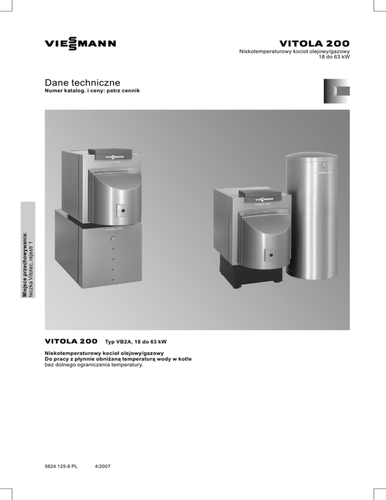 VIESMANN Dane techniczne Miejsce przechowywania: teczka Vitotec, rejestr 1 Numer katalog. i ceny: patrz cennik VITOLA 200 Typ VB2A, 18 do 63 kW Niskotemperaturowy kocioł olejowy/gazowy Do pracy z płynnie obniżaną temperaturą wody w kotle bez dolnego ograniczenia temperatury. 5824 125-8 PL 4/2007 VITOLA 200 Niskotemperaturowy kocioł olejowy/gazowy 18 do 63 kW Informacje o wyrobie Dwuwarstwowa zespolona powierzchnia grzewcza kotła Vitola 200 jest miarą wysokiej jakości i niezawodności. Kocioł Vitola 200 łączy w sobie komfort użytkowania z oszczędnością eksploatacji za niewygórowaną cenę. Jest kamieniem milowym w rozwoju techniki grzewczej. Zalety w skrócie & & & Sprawność znormalizowana: 90% (Hs)/96% (H i) Dwuwarstwowa zespolona powierzchnia grzewcza zapewnia wysoki stopień bezpieczeństwa eksploatacji i dużą trwałość. Spalanie z niską emisją zanieczyszczeń: Wartości graniczne znacznie poniżej wymaganych przez symbol ochrony środowiska „Błękitny Anioł” i szwajcarskie rozporządzenie o ochronie atmosfery. & & & Eksploatacja z zasysaniem powietrza z zewnątrz możliwa do 33 kW. Łatwe czyszczenie powierzchni grzewczej. Niewielkie straty ciepła dzięki wysokowydajnej izolacji cieplnej. A Wysoce skuteczna izolacja cieplna B Dwuwarstwowa zespolona powierzchnia grzewcza z żeliwa i stali zapewnia wysoki stopień bezpieczeństwa eksploatacji i dużą trwałość C Wyjmowana komora spalania ze stali nierdzewnej D Regulator Vitotronic – inteligentny, prosty w montażu, obsłudze i konserwacji 5824 125-8 PL E Palnik olejowy Vitoflame 200 – sprawdzony w stanie rozgrzanym przy użyciu programu komputerowego oraz dostosowany do mocy kotła 2 VIESMANN VITOLA 200 Dane techniczne Dane techniczne Znamionowa moc cieplna Nr identyfikacyjny produktu Wymiary korpusu kotła Długość k Szerokość d Wysokość p Wymiary całkowite Długość całkowita n Szerokość całkowita e Wysokość całkowita b (eksploatacja) – Wysokość a (regulator w poz. obsługowej) – Wysokość f (regulator w poz. konserw.) Wysokość postumentu Wysokość z (ustawionego pod kotłem podgrzewacza pojemnościowego) – pojemność 130 do 200 l – pojemność 350 l Masa korpusu kotła Masa całkowita Kocioł z izolacją cieplną, palnikiem i regulatorem obiegu kotła Objętość wodny w kotle Dop. ciśnienie robocze Przyłącza kotła grzewczego Zasilanie i powrót kotła Przyłącze zabezpieczające (zawór bezpieczeństwa) Spust Parametry spalin* 1 temperatura – przy temperaturze wody w kotle 40°C – przy temperaturze wody w kotle 75°C Masowe natężenie przepływu przy oleju opałowym lekkim i gazie ziemnym Sprawność znormalizowana przy temp. systemu grzewczego 75/60 °C Przyłącze spalin Przyłącze powietrza dolotowego Pojemność gazowa kotła Opory przepływu spalin* 2 5824 125-8 PL Wymagane ciśnienie tłoczenia * 3 kW 18 22 40 50 63 mm mm mm 520 492 669 577 537 691 656 565 708 768 565 708 817 674 819 956 702 853 1070 702 853 mm mm mm mm mm mm 1052 594 795 914 1143 250 1109 639 808 927 1156 250 1188 667 815 934 1163 250 1300 667 815 934 1163 250 1421 776 940 1050 1275 250 1560 804 975 1085 1310 250 1674 804 975 1085 1310 250 mm mm kg kg 654 – 113 148 654 – 135 171 654 786 164 201 654 786 185 223 654 786 260 311 – 786 335 388 – – 367 422 I bar 49 3 61 3 76 3 89 3 140 3 199 3 223 3 G G 1½ 1½ 1½ 1½ 1½ 1½ 1½ 1½ 1½ 1½ 1½ 1½ 1½ 1½ R ¾ ¾ ¾ ¾ ¾ ¾ ¾ 145 165 31 145 165 38 145 165 46 145 165 56 145 165 68 145 165 85 145 165 107 150 — 110 10 0,10 5 0,05 150 — 157 12 0,12 5 0,05 150 — 173 14 0,14 5 0,05 °C °C kg/h % 7 mm 7 mm I Pa mbar Pa mbar 27 33 CE‐0085 AQ 0695 90 (Hs)/96 (H i) 130 80 39 7 0,07 5 0,05 130 80 53 8 0,08 5 0,05 130 80 73 8 0,08 5 0,05 130 80 78 10 0,10 5 0,05 *1 Wartości obliczeniowe do projektowania instalacji spalinowej wg normy EN 13384 w odniesieniu do 13% CO2 w przypadku oleju opałowego lekkiego i 10% CO2 w przypadku gazu ziemnego. Temperatury spalin jako średnie wartości brutto wg normy EN 304 przy temperaturze powietrza do spalania wynoszącej 20°C. *2 Uwzględnić przy wyborze palnika. *3 Uwzględnić przy wymiarowaniu komina. VITOLA 200 VIESMANN 3 Dane techniczne (ciąg dalszy) A AGA E KR Postument Wyciąg spalin Spust i przeponowe naczynie zbiorcze Powrót kotła B Czujnik temperatury wody w kotle Zasilanie kotła Przyłącze powietrza do spalania przy zasysaniu z zewnątrz Przyłącze zabezpieczające (zawór bezpieczeństwa) KTS KV RLU SA Czujnik temperatury wody w kotle Zasilanie kotła Przyłącze powietrza do spalania przy zasysaniu z zewnątrz Przyłącze zabezpieczające (zawór bezpieczeństwa) 5824 125-8 PL Vitocell‐H 100 lub 300 (dane techniczne, patrz oddzielne arkusze danych w rejestrze 17) AGA Wyciąg spalin E Spust i przeponowe naczynie zbiorcze KR Powrót kotła KTS KV RLU SA 4 VIESMANN VITOLA 200 Dane techniczne (ciąg dalszy) Tabela wymiarów Znamionowa moc cieplna a b c d e f g h i k I m n o p r s t Z ustawionym pod kotłem podgrzewaczem pojemnościowym kW mm mm mm mm mm mm mm mm mm mm mm mm mm mm mm mm mm mm litrów u v w x y z mm mm mm mm mm mm 18 914 795 743 492 594 1143 55 92 393 520 73 139 1052 338 669 195 144 439 130 do 200 1449 1397 1093 992 798 654 22 927 808 756 537 639 1156 55 92 393 577 73 139 1109 338 691 210 126 428 130 do 200 1462 1410 1082 992 780 654 27 934 815 763 565 667 1163 55 92 393 656 73 139 1188 338 708 225 110 443 130 350 do 200 1469 1601 1417 1549 1097 1229 992 1124 764 896 654 786 33 934 815 763 565 667 1163 55 92 393 768 73 156 1300 338 708 225 110 443 160 i 350 200 1469 1417 1097 992 764 654 1601 1549 1229 1124 896 786 40 1050 940 874 674 776 1275 70 106 448 817 144 156 1421 370 819 254 112 570 200 350 1594 1528 1224 1024 766 654 1726 1660 1356 1156 898 786 50 1085 975 908 702 804 1310 70 106 448 956 144 156 1560 370 853 268 85 620 350 63 1085 975 908 702 804 1310 70 106 448 1070 144 156 1674 370 853 268 85 620 – 1761 1694 1406 1156 871 786 – – – –