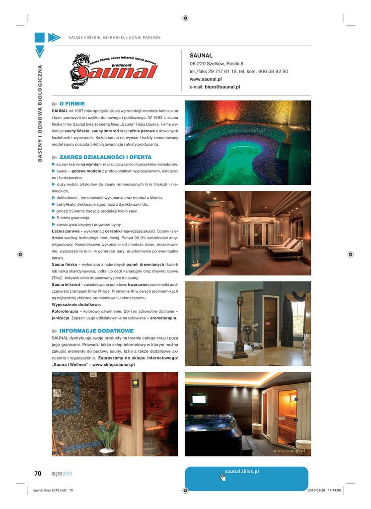 SAUNY FIŃSKIE, INFRARED, ŁAŹNIE PAROWE BASE NY I O D N OWA BI O LO G I C Z N A SAUNAL 06-220 Szelków, Rostki 8 tel./faks 29 717 61 16, tel. kom. 606 58 92 90 www.saunal.pl e-mail: [email protected] O FIRMIE SAUNAL od 1987 roku specjalizuje się w produkcji i montażu kabin saun i łaźni parowych do użytku domowego i publicznego. W 1992 r. sauna fińska firmy Saunal była scenerią filmu „Sauna” Filipa Bajona. Firma wykonuje sauny fińskie, sauny infrared oraz łaźnie parowe o dowolnych kształtach i wymiarach. Każda sauna na wymiar i każdy zamontowany model sauny posiada 5-letnią gwarancję i atesty producenta. ZAKRES DZIAŁALNOŚCI I OFERTA X sauny i łaźnie na wymiar– realizacja wszelkich projektów inwestorów, X sauny – gotowe modele z profesjonalnym wyposażeniem, estetyczne i funkcjonalne, X duży wybór artykułów do sauny renomowanych firm fińskich i niemieckich, X dokładność , terminowość wykonania oraz montaż u klienta, X certyfikaty, deklaracje zgodności z dyrektywami UE, X ponad 25-letnia tradycja produkcji kabin saun, X 5-letnia gwarancja, X serwis gwarancyjny i pogwarancyjny. Łaźnia parowa – wykonana z ceramiki najwyższej jakości. Ściany i siedziska według technologii modułowej. Ponad 99,9% szczelności antywilgociowej. Kompleksowe wykonanie od montażu ścian, mozaikowanie, wyposażenie m.in. w generator pary, uruchomienie po ewentualny serwis. Sauna fińska – wykonana z naturalnych paneli drewnianych [świerk lub osika skandynawska, jodła lub cedr kanadyjski oraz drewno lipowe (Tilia)]. Indywidualnie dopasowany piec do sauny. Sauna infrared – zainstalowane punktowo kwarcowe promienniki podczerwieni z lampami firmy Philips. Promienie IR w owych promiennikach są najbardziej zbliżone promieniowaniu słonecznemu. Wyposażenie dodatkowe: Koloroterapia – kolorowe oświetlenie. Sól i jej zdrowotne działanie – jonizacja. Zapach i jego oddziaływanie na człowieka – aromaterapia. INFORMACJE DODATKOWE SAUNAL dystrybuuje swoje produkty na terenie całego kraju i poza jego granicami. Prowadzi także sklep internetowy w którym można zakupić elementy do budowy sauny, łaźni a także dodatkowe akcesoria i wyposażenie. Zapraszamy do sklepu internetowego: „Sauna i Wellnes” – www.sklep.saunal.pl 70 2013 saunal ibiss 2013.indd 70 saunal.ibiss.pl 2013-03-28 17:44:08
