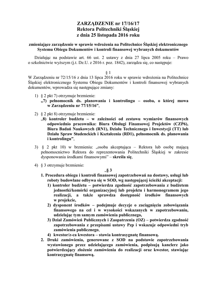 ZARZĄDZENIE nr 17/16/17 Rektora Politechniki Śląskiej z dnia 25 listopada 2016 roku zmieniające zarządzenie w sprawie wdrożenia na Politechnice Śląskiej elektronicznego Systemu Obiegu Dokumentów i kontroli finansowej wybranych dokumentów Działając na podstawie art. 66 ust. 2 ustawy z dnia 27 lipca 2005 roku – Prawo o szkolnictwie wyższym (j.t. Dz.U. z 2016 r. poz. 1842), zarządza się, co następuje: §1 W Zarządzeniu nr 72/15/16 z dnia 13 lipca 2016 roku w sprawie wdrożenia na Politechnice Śląskiej elektronicznego Systemu Obiegu Dokumentów i kontroli finansowej wybranych dokumentów, wprowadza się następujące zmiany: 1) § 2 pkt 7) otrzymuje brzmienie: „7) pełnomocnik ds. planowania i kontrolingu – osoba, o której mowa w Zarządzeniu nr 77/15/16”, 2) § 2 pkt 8) otrzymuje brzmienie: „8) kontroler budżetu – w zależności od zestawu wymiarów finansowych odpowiednio pracownika: Biura Obsługi Finansowej Projektów (CZP6), Biura Badań Naukowych (RN1), Działu Technicznego i Inwestycji (TT) lub Działu Spraw Studenckich i Kształcenia (RD1), pełnomocnik ds. planowania i kontrolingu”, 3) § 2 pkt 10) w brzmieniu: „osoba akceptująca – Rektora lub osobę mającą pełnomocnictwo Rektora do reprezentowania Politechniki Śląskiej w zakresie dysponowania środkami finansowymi” – skreśla się, 4) § 3 otrzymuje brzmienie: „§ 3 1. Procedura obiegu i kontroli finansowej zapotrzebowań na dostawy, usługi lub roboty budowlane odbywa się w SOD, wg następującej ścieżki akceptacji: 1) kontroler budżetu – potwierdza zgodność zapotrzebowania z budżetem jednostki/komórki organizacyjnej lub projektu i harmonogramem jego realizacji, a także sprawdza dostępność środków finansowych w projekcie, 2) dysponent środków – podejmuje decyzje o zaciągnięciu zobowiązania finansowego na cel i w wysokości wskazanych w zapotrzebowaniu, udzielając tym samym zamówienia publicznego, 3) Dział Zamówień Publicznych i Zaopatrzenia (OZ) – potwierdza zgodność zapotrzebowania z przepisami ustawy Pzp i wskazuje odpowiedni tryb zamówienia publicznego, 4) kwestor/z-ca kwestora – stawia kontrasygnatę finansową. 2. Druki zamówienia, generowane z SOD na podstawie zapotrzebowania wystawionego przez udzielającego zamówienia, podpisują kanclerz jako potwierdzający złożenie zamówienia do realizacji oraz kwestor, stawiając kontrasygnatę finansową. 5) dodaje się § 4 w następującym brzmieniu: „§ 4 Procedura obiegu i kontroli finansowej zapotrzebowań na towar z magazynu odbywa się w SOD wg następującej ścieżki akceptacji: 1) kontroler budżetu – potwierdza zgodność zapotrzebowania z budżetem jednostki/komórki organizacyjnej lub projektu i harmonogramem jego realizacji, a także potwierdza dostępność środków finansowych w projekcie, 2) dysponent środków – podejmuje decyzje o zaciągnięciu zobowiązania finansowego na cel i w wysokości wskazanych w zapotrzebowaniu.”, 6) dotychczasowe § 4÷7 otrzymują numeracje 5÷8 7) § 5 otrzymuje brzmienie: „§ 5 1. Procedura obiegu i kontroli finansowej faktury zakupu lub jej korekty odbywa się w SOD wg następującej ścieżki akceptacji: 1) pracownik punktu pocztowego ‒ rejestruje fakturę zakupu lub jej korektę w SOD, a następnie przekazuje oryginał dokumentu bezpośrednio do Działu Finansowego (GF), 2) pracownik jednostki/komórki organizacyjnej – dokonuje kontroli merytorycznej i opisuje fakturę, wypełniając formularz dynamiczny, a także przypisuje fakturę do uprzednio zaakceptowanego zapotrzebowania, 3) Dział Finansowy (GF) – sprawdza poprawność faktury pod względem formalno-rachunkowym, a w przypadku stwierdzenia błędu, wystawia notę korygującą do faktury, 4) kontroler budżetu – potwierdza zgodność zakupu z budżetem jednostki/komórki organizacyjnej lub projektu i harmonogramem jego realizacji, potwierdza dostępność środków finansowych w projekcie, a także weryfikuje zgodność kwoty na fakturze z zapotrzebowaniem i prawidłowość przypisanego zapotrzebowania, 5) Dział Zamówień Publicznych i Zaopatrzenia (OZ) – potwierdza zgodność zakupu z przepisami ustawy Pzp, 6) dysponent środków – potwierdza wykonanie zamówienia ze środków finansowych jednostki/komórki organizacyjnej lub projektu, 7) kwestor lub z-ca kwestora – stawia kontrasygnatę finansową i zatwierdza do zapłaty. 2. W stosunku do faktur zakupu, do których dołącza się rozdzielnik kosztów lub faktury za towary zakupione na magazyn centralny Uczelni, obowiązuje uproszczona ścieżka akceptacji dokumentów. Stosuje się do nich ust. 1 pkt 1), 3) i 7).”, §2 Zarządzenie wchodzi w życie z dniem podpisania, z mocą obowiązującą od dnia 1 grudnia 2016 roku. W załączeniu tekst ujednolicony Zarządzenia nr 72/15/16 Otrzymują: R, RN, RO, RD, RW, RA, AK wszystkie komórki i jednostki organizacyjne Uczelni Tekst ujednolicony opracowany na podstawie: Zarządzenia nr 72/15/16 i Zarządzenia nr 17/16/17 Stan prawny na dzień 25 listopada 2016 roku ZARZĄDZENIE nr 72/15/16 Rektora Politechniki Śląskiej z dnia 13 lipca 2016 roku w sprawie wdrożenia na Politechnice Śląskiej elektronicznego Systemu Obiegu Dokumentów i kontroli finansowej wybranych dokumentów Działając na podstawie art. 66 ust. 2 ustawy z dnia 27 lipca 2005 roku ‒ Prawo o szkolnictwie wyższym (j.t. Dz.U. z 2012 r., poz. 572 z późn. zm.), zarządza się, co następuje: §1 1. Z dniem 26 lipca 2016 roku wprowadza się na Politechnice Śląskiej elektroniczny System Obiegu Dokumentów, zwany dalej SOD, wchodzący w skład Zintegrowanego Systemu Informatycznego, który w I etapie obejmuje następujące dokumenty: 1) zapotrzebowanie na dostawy, usługi lub roboty budowlane oraz zapotrzebowanie na towary z magazynu centralnego Uczelni, 2) fakturę zakupu oraz korektę faktury zakupu, 3) dokument przyjęcia środka trwałego, zwany OT, 4) notę księgową. 2. Powyższe dokumenty p