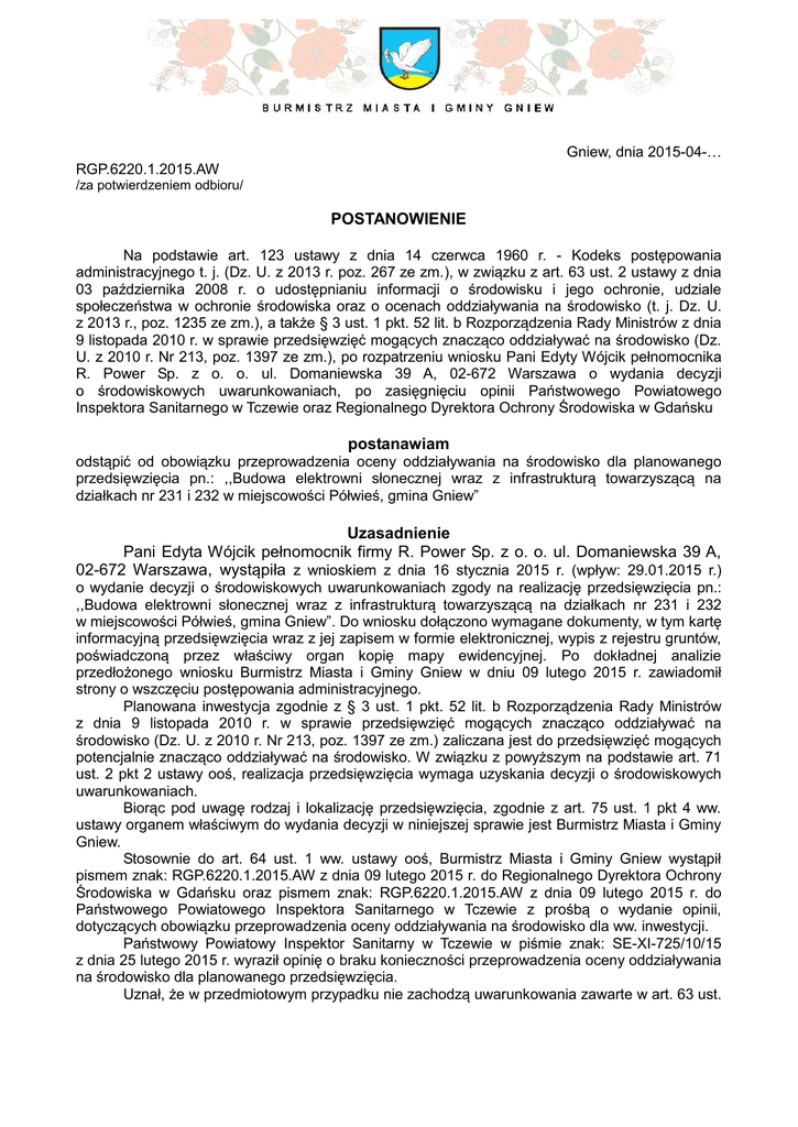 Gniew, dnia 2015-04-… RGP.6220.1.2015.AW /za potwierdzeniem odbioru/ POSTANOWIENIE Na podstawie art. 123 ustawy z dnia 14 czerwca 1960 r. - Kodeks postępowania administracyjnego t. j. (Dz. U. z 2013 r. poz. 267 ze zm.), w związku z art. 63 ust. 2 ustawy z dnia 03 października 2008 r. o udostępnianiu informacji o środowisku i jego ochronie, udziale społeczeństwa w ochronie środowiska oraz o ocenach oddziaływania na środowisko (t. j. Dz. U. z 2013 r., poz. 1235 ze zm.), a także § 3 ust. 1 pkt. 52 lit. b Rozporządzenia Rady Ministrów z dnia 9 listopada 2010 r. w sprawie przedsięwzięć mogących znacząco oddziaływać na środowisko (Dz. U. z 2010 r. Nr 213, poz. 1397 ze zm.), po rozpatrzeniu wniosku Pani Edyty Wójcik pełnomocnika R. Power Sp. z o. o. ul. Domaniewska 39 A, 02-672 Warszawa o wydania decyzji o środowiskowych uwarunkowaniach, po zasięgnięciu opinii Państwowego Powiatowego Inspektora Sanitarnego w Tczewie oraz Regionalnego Dyrektora Ochrony Środowiska w Gdańsku postanawiam odstąpić od obowiązku przeprowadzenia oceny oddziaływania na środowisko dla planowanego przedsięwzięcia pn.: ,,Budowa elektrowni słonecznej wraz z infrastrukturą towarzyszącą na działkach nr 231 i 232 w miejscowości Półwieś, gmina Gniew” Uzasadnienie Pani Edyta Wójcik pełnomocnik firmy R. Power Sp. z o. o. ul. Domaniewska 39 A, 02-672 Warszawa, wystąpiła z wnioskiem z dnia 16 stycznia 2015 r. (wpływ: 29.01.2015 r.) o wydanie decyzji o środowiskowych uwarunkowaniach zgody na realizację przedsięwzięcia pn.: ,,Budowa elektrowni słonecznej wraz z infrastrukturą towarzyszącą na działkach nr 231 i 232 w miejscowości Półwieś, gmina Gniew”. Do wniosku dołączono wymagane dokumenty, w tym kartę informacyjną przedsięwzięcia wraz z jej zapisem w formie elektronicznej, wypis z rejestru gruntów, poświadczoną przez właściwy organ kopię mapy ewidencyjnej. Po dokładnej analizie przedłożonego wniosku Burmistrz Miasta i Gminy Gniew w dniu 09 lutego 2015 r. zawiadomił strony o wszczęciu postępowania administracyjnego. Planowana inwestycja zgodnie z § 3 ust. 1 pkt. 52 lit. b Rozporządzenia Rady Ministrów z dnia 9 listopada 2010 r. w sprawie przedsięwzięć mogących znacząco oddziaływać na środowisko (Dz. U. z 2010 r. Nr 213, poz. 1397 ze zm.) zaliczana jest do przedsięwzięć mogących potencjalnie znacząco oddziaływać na środowisko. W związku z powyższym na podstawie art. 71 ust. 2 pkt 2 ustawy ooś, realizacja przedsięwzięcia wymaga uzyskania decyzji o środowiskowych uwarunkowaniach. Biorąc pod uwagę rodzaj i lokalizację przedsięwzięcia, zgodnie z art. 75 ust. 1 pkt 4 ww. ustawy organem właściwym do wydania decyzji w niniejszej sprawie jest Burmistrz Miasta i Gminy Gniew. Stosownie do art. 64 ust. 1 ww. ustawy ooś, Burmistrz Miasta i Gminy Gniew wystąpił pismem znak: RGP.6220.1.2015.AW z dnia 09 lutego 2015 r. do Regionalnego Dyrektora Ochrony Środowiska w Gdańsku oraz pismem znak: RGP.6220.1.2015.AW z dnia 09 lutego 2015 r. do Państwowego Powiatowego Inspektora Sanitarnego w Tczewie z prośbą o wydanie opinii, dotyczących obowiązku przeprowadzenia oceny oddziaływania na środowisko dla ww. inwestycji. Państwowy Powiatowy Inspektor Sanitarny w Tczewie w piśmie znak: SE-XI-725/10/15 z dnia 25 lutego 2015 r. wyraził opinię o braku konieczności przeprowadzenia oceny oddziaływania na środowisko dla planowanego przedsięwzięcia. Uznał, że w przedmiotowym przypadku nie zachodzą uwarunkowania zawarte w art. 63 ust. 1 ustawy z dnia 03 października 2008 r. o udostępnianiu informacji o środowisku i jego ochronie, udziale społeczeństwa w ochronie środowiska oraz o ocenach oddziaływania na środowisko, a w szczególności nie przewiduje się negatywnego oddziaływania planowanego zamierzenia na przedmiotowym terenie oraz w sąsiedztwie podczas eksploatacji inwestycji. Ponadto zgodnie z charakterystyką planowanego przedsięwzięcia, opisaną w karcie informacyjnej, zdaniem Państwowego Powiatowego Inspektora Sanitarnego, nie wystąpią ponadnormatywne emisje substancji i energii do środowiska. Wartości pola elektromagnetycznego będą osiągały wielkości, które nie będą miały wpływu na stan środowiska oraz na zdrowie i życie ludzi. W wyniku realizacji inwestycji nie zostaną przekroczone dopuszczalne poziomy sumarycznego natężenia dźwięku na terenach podlegających ochronie akustycznej. Regionalny Dyrektor Ochrony Środowiska pismem z dnia 26 lutego 2015 r. (wpływ: 02.03.2015 r.) znak: RDOŚ-Gd-WOO.4240.56.2015.AJ.2 wezwał tut. Organ do uzupełnienia karty informacyjnej przedsięwzięcia m. in. o rozszerzenie punktu dotyczącego rozwiązań chroniących środowisko na etapie realizacji oraz eksploatacji planowanego zamierzenia, a także przeanalizowanie wpływu przedsięwzięcia na możliwość nieosiągnięcia celów środowiskowych zawartych w planie gospodarowania wodami na obszarze dorzecza. Uzupełnienie do wniosku zostało przesłane pismem znak: RGP.6220.1.2015.AW z dnia 12 marca 2014 r. Regionalny Dyrektor Ochrony Środowiska wydał postanowienie znak: RDOŚ-Gd-WOO. 4240.56.2015.AJ.3 z dnia 20 marca 2015 r. (wpływ: 27.03.2015 r.), w którym wyraził opinię dotyczącą braku obowiązku przeprowadzenia oceny oddziaływania inwestycji na środowisko, uwzględniając skalę, rodzaj przedsięwzięcia, a także biorąc pod uwagę możliwe jego oddziaływanie na środowisko. Burmistrz Miasta i Gminy Gniew zgadza się ze stanowiskiem Państwowego Powiatowego Inspektora Sanitarnego oraz Regionalnego Dyrektora Ochrony Środowiska. Tutejszy Organ po dogłębnym przeanalizowaniu sprawy odstąpił od obowiązku przeprowadzenia oceny oddziaływania na środowisko dla planowanego przedsięwzięcia mogącego potencjalnie znacząco oddziaływać na środowisko, uwzględniając uwarunkowania, o których mowa w art. 63 ust. 1 ww. ustawy ooś wziął pod uwagę: 1. Rodzaj i charakterystykę przedsi