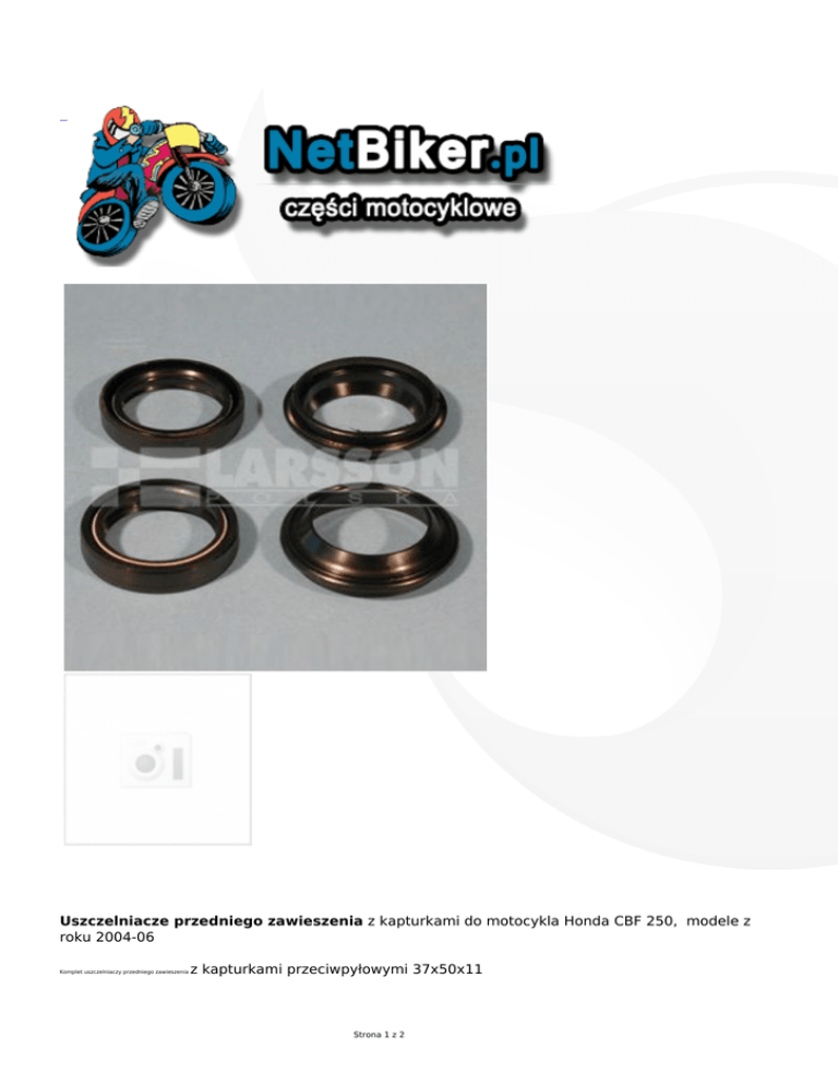 Uszczelniacze przedniego zawieszenia z kapturkami do motocykla Honda CBF 250, modele z roku 2004-06 Komplet uszczelniaczy przedniego zawieszenia z kapturkami przeciwpyłowymi 37x50x11 Strona 1 z 2 1. 2. 3. 4. 5. Producent Średnica wew. [mm] Średnica zew. [mm] Wysokość [mm] Kapturek przeciwpyłowy Tourmax 37 50 11 tak Uszczelniacze z kapturkami przeciwpyłowymi to najlepsze rozwiązanie dla osób ceniących jakość i trwałość przedniego zawieszenia w motocyklu. Wszystkie uszczelniacze sprzedawane są w kompletach składających się z dwóch uszczelniaczy wewnętrznych i dwóch kapturków przeciwpyłowych. Dla osób, które nie widzą uzasadnienia wymiany kapturków przeciwpyłowych polecamy uszczelniacze firmy Athena sprzedawane w kompletach po dwie sztuki. Kraj produkcji: Japonia Strona 2 z 2