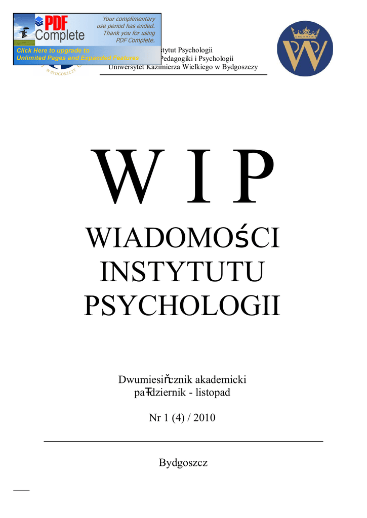 WIP Wiadomości Instytutu Psychologii Instytut Psychologii Wydział Pedagogiki i Psychologii Uniwersytet Kazimierza Wielkiego w Bydgoszczy WIP WIADOMOŚCI INSTYTUTU PSYCHOLOGII Dwumiesięcznik akademicki październik - listopad Nr 1 (4) / 2010 Bydgoszcz WIP Wiadomości Instytutu Psychologii Opiekun naukowy WIP-a: dr Ewa Danek Witamy Was, Drodzy Czytelnicy, Pracownicy i Studenci Instytutu Psychologii! Redaktor Naczelny: dr Alicja Szmaus-Jackowska Oddajemy Wam do rąk pierwszy w tym roku akademickim numer naszej gazety instytutowej WIP, Wiadomości Instytutu Zespół Redakcyjny: Pracownicy Instytutu: mgr Izabela Grzankowska mgr Anna Hibner Doktoranci: mgr Martyna Bińkowska mgr Anna Gluska mgr Paulina Mrozińska Studenci: Karolina Piechurska Aleksandra Przybytkowska Psychologii. Wydanie to pełne jest ważnych informacji związanych z życiem Instytutu Psychologii. Poza sprawozdaniami z inauguracji roku akademickiego (ogólnouczelnianej oraz Studiów Doktoranckich) będzie można przeczytać o sukcesie pani dr hab. Małgorzaty Basińskiej związanym z uzyskaniem tytułu doktora habilitowanego oraz relacje z wizyty naukowców goszczących w ostatnim czasie w Instytucie Psychologii. Szczególną uwagę Czytelników pragniemy zwrócić Skład numeru: mgr Anna Gluska na wywiad z wybitną specjalistką z zakresu psychologii wspomagania rozwoju, twórczynią niezwykle popularnej serii wydawniczej „Wspomaganie rozwoju. Psychostymulacja i SPIS TREŚCI: Wieści z Rady … … … … … 3 psychokorekcja”, Panią Profesor Barbarą Kają. Mój punkt widzenia … … … 4 Ponadto zachęcamy do przeczytania informacji na Wywiad z prof. B. Kają … … 5 temat programu Socrates Erasmus oraz doniesień studentów Wydarzenia … … … … … ..10 uczestniczących w wymianie międzynarodowej. Działalność kół naukowych ..12 Psychologia w praktyce … ...16 Gość w Instytucie … … … ...20 Informacje konferencyjne … 21 Instytut a wymiana międzynarodowa … … … Uwadze Czytelników polecamy również stałą rubrykę „Psychologia w praktyce”, a w niej wywiad z praktykiem, psychologiem penitencjarnym, Panem Przemysławem Gorzelakiem. Poza tym chcemy zaprosić do zapoznania się z sylwetkami studentek Studiów Doktoranckich oraz do przeczytania 22 informacji na temat konferencji doktoranckiej „Rodzina wo- Z życia doktoranta … … … 30 bec wyzwań współczesności”, która w najbliższym czasie Recenzje … … … … … … 42 będzie się odbywała w naszym Instytucie. Okiem studenta … … … … 45 Na koniec chcę przypomnieć w imieniu Zespołu Re- Sukcesy Studentów … … … 46 dakcyjnego o tym, że wciąż pozostajemy otwarci na nowe propozycje. Czekamy na głosy, listy i opinie w sprawie WIPa, dotyczące zarówno treści jak i formy gazety (adres e- Kontakt z Redakcją: [email protected] mailowy: [email protected]). W imieniu Zespołu Redakcyjnego Instytut Psychologii UKW ul. Leopolda Staffa 1 85-861 Bydgoszcz Alicja Szmaus-Jackowska 2 WIP Wiadomości Instytutu Psychologii WIEŚCI Z RADY INSTYTUTU N a posiedzeniu Rady Instytu- Psychologii. tu, które odbyło się w dniu Poruszono również bieżące sprawy 14 września poruszono wie- organizacyjne i kadrowe: le istotnych spraw dotyczą- · cych Instytutu Psychologii. Prof. P. Izdebski przedstawił kandydatury do powołanej w Instytucie Psy- Informacje związane ze sprawami naukowymi zreferowała Prof. H. Liberska chologii Komisji Etycznej; · Prof. P. Izdebski poinformował o zatrudnieniu nowego pracownika w Pra- gotowań do naboru na studia doktoranckie cowni Testów Psychologicznych; 2010/2011, ponadto przedstawione zostały · Prof. R. Ossowski przedstawił propo- programy nauczania na studiach doktoranc- zycję wniosku o akredytację Uczel- kich 2010/2011 (projektowane zajęcia oraz nianej Komisji Akredytacyjnej. zaproszeni wykładowcy), informacja na te- Na kolejnym, nadzwyczajnym posie- mat stopnia zaawansowania przygotowań dzeniu Rady Instytutu Psychologii, które do konferencji doktorantów, która odbędzie odbyło się w dniu 3 listopada 2010 roku się w listopadzie 2010 roku. Prof. H. Liber- omówiono następujące sprawy dotyczące ska przedstawiła również informacje na te- Instytutu Psychologii: mat: · · · stopnia zaawansowania otwartych · Prof. H. Liberska zaprezentowała wyniki parametrycznej oceny jednostek przewodów doktorskich; naukowych przez Ministerstwo Nauki grantów badawczych uzyskanych w i Szkolnictwa Wyższego; roku akademickim 2009/2010; · Prof. J. Trempała poprowadził dysku- konferencji naukowych planowanych sję nad strategią rozwoju naukowego w Instytucie Psychologii w roku aka- Instytutu Psychologii w związku z demickim 2010/2011; parametryczną oceną jednostek na- Informacje związane ze sprawami dy- ukowych przez Ministerstwo Nauki i daktycznymi zreferowała dr E. Danek przedstawiając informacje o nagrodach dla najlepszego studenta i absolwenta Instytutu ... WIEŚCI Z RADY ... przedstawiając wiadomości dotyczące przy- Szkolnictwa Wyższego. Protokołowała: Joanna Ziętarska Opracowała: Alicja Szmaus-Jackowska 3 WIP Wiadomości Instytutu Psychologii … MÓJ PUNKT WIDZENIA ... Na początek roku akademickiego 2010 / 2011 kieruje do nas słowo Dyrektor Instytut Psychologii prof. dr hab. Janusz Trempała CZEKAJĄ NAS ZMIANY M am kilka dobrych wiadomości. Po pierwsze, Pani Małgorzata Basińska pomyślnie przebrnęła przez wszystkie procedury przewodu habilitacyjnego i mamy w Instytucie kolejnego samodzielnego pracownika naukowego. Gratulacje! Po drugie, spośród czterech studentów wyróżnionych przez Dyrektora Instytutu, w tegorocznej edycji konkursu na najlepszego studenta UKW, zwyciężyła Pani Milena Ręgocka, natomiast wyróżnienie Dziekana uzyskały Panie Magdalena Górska i Martyna Kotyśko. Jesteśmy dumni!! Od dawna wiemy, że nasi studenci i doktoranci są najlepsi w Uniwersytecie. Po trzecie, zakończyliśmy częściowy remont skrzydła A Ins
