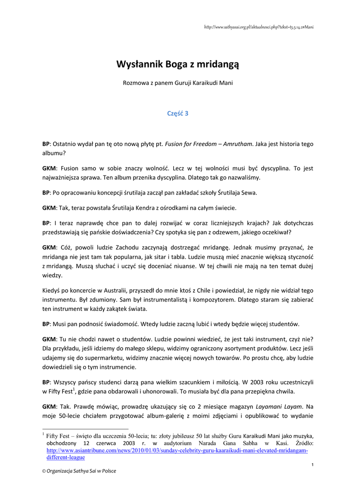 http://www.sathyasai.org.pl/aktualnosci.php?tekst=t5.5.14.2#Mani Wysłannik Boga z mridangą Rozmowa z panem Guruji Karaikudi Mani Część 3 BP: Ostatnio wydał pan tę oto nową płytę pt. Fusion for Freedom – Amrutham. Jaka jest historia tego albumu? GKM: Fusion samo w sobie znaczy wolność. Lecz w tej wolności musi być dyscyplina. To jest najważniejsza sprawa. Ten album przenika dyscyplina. Dlatego tak go nazwaliśmy. BP: Po opracowaniu koncepcji śrutilaja zaczął pan zakładać szkoły Śrutilaja Sewa. GKM: Tak, teraz powstała Śrutilaja Kendra z ośrodkami na całym świecie. BP: I teraz naprawdę chce pan to dalej rozwijać w coraz liczniejszych krajach? Jak dotychczas przedstawiają się pańskie doświadczenia? Czy spotyka się pan z odzewem, jakiego oczekiwał? GKM: Cóż, powoli ludzie Zachodu zaczynają dostrzegać mridangę. Jednak musimy przyznać, że mridanga nie jest tam tak popularna, jak sitar i tabla. Ludzie muszą mieć znacznie większą styczność z mridangą. Muszą słuchać i uczyć się doceniać niuanse. W tej chwili nie mają na ten temat dużej wiedzy. Kiedyś po koncercie w Australii, przyszedł do mnie ktoś z Chile i powiedział, że nigdy nie widział tego instrumentu. Był zdumiony. Sam był instrumentalistą i kompozytorem. Dlatego staram się zabierać ten instrument w każdy zakątek świata. BP: Musi pan podnosić świadomość. Wtedy ludzie zaczną lubić i wtedy będzie więcej studentów. GKM: Tu nie chodzi nawet o studentów. Ludzie powinni wiedzieć, że jest taki instrument, czyż nie? Dla przykładu, jeśli idziemy do małego sklepu, widzimy ograniczony asortyment produktów. Lecz jeśli udajemy się do supermarketu, widzimy znacznie więcej nowych towarów. Po prostu chcę, aby ludzie dowiedzieli się o tym instrumencie. BP: Wszyscy pańscy studenci darzą pana wielkim szacunkiem i miłością. W 2003 roku uczestniczyli w Fifty Fest1, gdzie pana obdarowali i uhonorowali. To musiała być dla pana przepiękna chwila. GKM: Tak. Prawdę mówiąc, prowadzę ukazujący się co 2 miesiące magazyn Layamani Layam. Na moje 50-lecie chciałem przygotować album-galerię z moimi zdjęciami i opublikować to wydanie 1 Fifty Fest – święto dla uczczenia 50-lecia; tu: złoty jubileusz 50 lat służby Guru Karaikudi Mani jako muzyka, obchodzony 12 czerwca 2003 r. w audytorium Narada Gana Sabha w Kasi. Źródło: http://www.asiantribune.com/news/2010/01/03/sunday-celebrity-guru-kaaraikudi-mani-elevated-mridangamdifferent-league 1 © Organizacja Sathya Sai w Polsce http://www.sathyasai.org.pl/aktualnosci.php?tekst=t5.5.14.2#Mani magazynu. Wtedy dowiedziało się o tym kilku moich studentów ostatniego roku. Chcieli coś zrobić i w rezultacie złożyli zamówienie na samochód. Na tydzień przed końcem 50 lat dowiedziałem się o tym i wyraziłem sprzeciw. Lecz studenci powiedzieli tak: „Jest pan tak przywiązany do swojego gurudżi, że nawet kiedy odszedł, nadal odwiedza pan miejsce, w którym żył. Jesteśmy zdumieni pańskim guru-bhakti (oddaniem dla guru). Ponadto samochodem zostaje honorowany zawodnik krykieta, który wykonuje 100 runów (wybić piłki). Pan zrobił dla nas tak wiele, wychował pan tylu muzyków. Jest to nasz skromny wyraz uznania dla pana”. BP: Sądzę, że dla każdego nauczyciela otrzymanie takiej miłości od studentów jest zawsze najcenniejszym dorobkiem. GKM: Zdecydowanie! BP: Chciałbym przejść do dzisiejszego występu. Ma pan zespół ‘Shanmukha Band’. W jaki sposób powstał ten zespół? GKM: Shanmukha to inne imię Pana Murugi. We wszystkim, co robię, zawsze preferuję stosowanie imion bogów lub czegoś, co ma związek z muzyką. Album zatytułowany Shakti został już wydany. Dlatego nie chciałem używać nazwy Shiva lub jakiejś podobnej, aby ludzie nie myśleli, że wiąże się to z tym albumem. Jestem bardzo oddany Panu Murudze. Shanmukha oznacza sześć głów Pana Murugi, wskazując, że posiadał on sześć różnych aspektów. Tak samo i ja wpadłem na pomysł sześciu różnych instrumentów na scenie, na których gra sześć osób, przekazując sześć różnych przesłań. Chciałem wydobyć sześć rozmaitych dźwięków i tak powstał zespół. Założyliśmy go jakieś 3 lata temu. BP: To takie wspaniałe słuchać pańskiego zespołu w Puttaparthi. Wszystkim tutaj ofiarował pan tyle błogości i radości. Mamy nadzieję, że również i pan coś stąd zabierze. GKM: Jestem tutaj tylko dzięki łasce Swamiego! Gdy tylko siadam na koncercie, modlę się do Wszechmogącego. Dzisiaj również modliłem się do Bhagawana słowami: „Nawet jeśli będę grał źle, powinno to brzmieć dobrze dla wszystkich uszu, łącznie z twoimi”. Taka była moja modlitwa i koncert wszystkim się podobał. To wszystko. Nie przypisujemy sobie zasług. BP: Niezależnie od tego, kiedy siada pan na scenie, aby zagrać, jaka jest najważniejsza myśl, która pojawia się w pańskim umyśle? GKM: Muzyka i tylko muzyka! Nie myślę o programie, jak to będzie przebiegało, kim są ludzie wokół, czy przyszły jakieś znane osobistości, itd. Prawdę mówiąc, ludzie nawet przychodzili do mnie i mi o tym mówili. Kiedyś na mój występ w Czennaj przyszedł minister. Nie zwróciłem na niego uwagi. Po koncercie sam mnie zawołał; był przewodniczącym Kongresu. Lecz zwyczajnie go przeprosiłem, mówiąc, że nigdy nikogo nie dostrzegam i że nie powinien mnie źle zrozumieć. Kiedy wychodzę na scenę, w pełni koncentruję swój umysł na dźwięku, na tym, co chcę zagrać, itd. BP: Ta koncentracja zmienia się w medytację! 2 © Organizacja Sathya Sai w Polsce http://www.sathyasai.org.pl/aktualnosci.php?tekst=t5.5.14.2#Mani GKM: Z całą pewnością! BP: Bardzo panu dziękuję. Mamy tylko nadzieję, że przyjedzie pan ponownie do Prasanthi Nilajam. GKM: Oczywiście! Problem był tylko z wyjazdem! Teraz gdy już wyruszyłem, będę przyjeżdżał regularnie. Dzisiejszy występ to niezapomniane wyda
