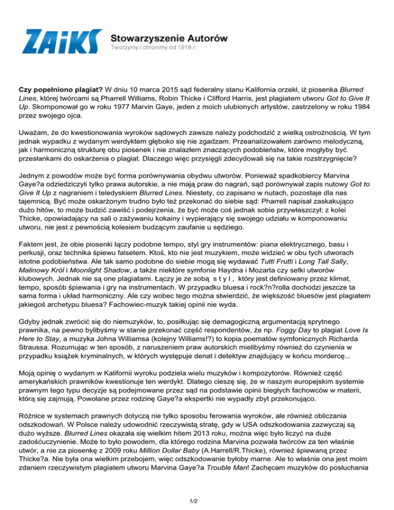 Czy popełniono plagiat? W dniu 10 marca 2015 sąd federalny stanu Kalifornia orzekł, iż piosenka Blurred Lines, której twórcami są Pharrell Williams, Robin Thicke i Clifford Harris, jest plagiatem utworu Got to Give It Up. Skomponował go w roku 1977 Marvin Gaye, jeden z moich ulubionych artystów, zastrzelony w roku 1984 przez swojego ojca. Uważam, że do kwestionowania wyroków sądowych zawsze należy podchodzić z wielką ostrożnością. W tym jednak wypadku z wydanym werdyktem głęboko się nie zgadzam. Przeanalizowałem zarówno melodyczną, jak i harmoniczną strukturę obu piosenek i nie znalazłem znaczących podobieństw, które mogłyby być przesłankami do oskarżenia o plagiat. Dlaczego więc przysięgli zdecydowali się na takie rozstrzygnięcie? Jednym z powodów może być forma porównywania obydwu utworów. Ponieważ spadkobiercy Marvina Gaye?a odziedziczyli tylko prawa autorskie, a nie mają praw do nagrań, sąd porównywał zapis nutowy Got to Give It Up z nagraniem i teledyskiem Blurred Lines. Niestety, co zapisano w nutach, pozostaje dla nas tajemnicą. Być może oskarżonym trudno było też przekonać do siebie sąd: Pharrell napisał zaskakująco dużo hitów, to może budzić zawiść i podejrzenia, że być może coś jednak sobie przywłaszczył; z kolei Thicke, opowiadający na sali o zażywaniu kokainy i wypierający się swojego udziału w komponowaniu utworu, nie jest z pewnością kolesiem budzącym zaufanie u sędziego. Faktem jest, że obie piosenki łączy podobne tempo, styl gry instrumentów: piana elektrycznego, basu i perkusji, oraz technika śpiewu falsetem. Ktoś, kto nie jest muzykiem, może widzieć w obu tych utworach istotne podobieństwa. Ale tak samo podobne do siebie mogą się wydawać Tutti Frutti i Long Tall Sally, Malinowy Król i Moonlight Shadow, a także niektóre symfonie Haydna i Mozarta czy setki utworów klubowych. Jednak nie są one plagiatami. Łączy je ze sobą s t y l , który jest definiowany przez klimat, tempo, sposób śpiewania i gry na instrumentach. W przypadku bluesa i rock?n?rolla dochodzi jeszcze ta sama forma i układ harmoniczny. Ale czy wobec tego można stwierdzić, że większość bluesów jest plagiatem jakiegoś archetypu bluesa? Fachowiec-muzyk takiej opinii nie wyda. Gdyby jednak zwrócić się do niemuzyków, to, posiłkując się demagogiczną argumentacją sprytnego prawnika, na pewno bylibyśmy w stanie przekonać część respondentów, że np. Foggy Day to plagiat Love Is Here to Stay, a muzyka Johna Williamsa (kolejny Williams!?) to kopia poematów symfonicznych Richarda Straussa. Rozumując w ten sposób, z naruszeniem praw autorskich mielibyśmy również do czynienia w przypadku książek kryminalnych, w których występuje denat i detektyw znajdujący w końcu mordercę... Moją opinię o wydanym w Kalifornii wyroku podziela wielu muzyków i kompozytorów. Również część amerykańskich prawników kwestionuje ten werdykt. Dlatego cieszę się, że w naszym europejskim systemie prawnym tego typu decyzje są podejmowane przez sąd na podstawie opinii biegłych fachowców w materii, którą się zajmują. Powołane przez rodzinę Gaye?a ekspertki nie wypadły zbyt przekonująco. Różnice w systemach prawnych dotyczą nie tylko sposobu ferowania wyroków, ale również obliczania odszkodowań. W Polsce należy udowodnić rzeczywistą stratę, gdy w USA odszkodowania zazwyczaj są dużo wyższe. Blurred Lines okazała się wielkim hitem 2013 roku, można więc było liczyć na duże zadośćuczynienie. Może to było powodem, dla którego rodzina Marvina pozwała twórców za ten właśnie utwór, a nie za piosenkę z 2009 roku Million Dollar Baby (A.Harrell/R.Thicke), również śpiewaną przez Thicke?a. Nie była ona wielkim przebojem, więc odszkodowanie byłoby marne. Ale to właśnie ona jest moim zdaniem rzeczywistym plagiatem utworu Marvina Gaye?a Trouble Man! Zachęcam muzyków do posłuchania 1/2 obu piosenek i zrobienia porównań. Pozostaje pytanie, czy ten wyrok będzie miał jakikolwiek wpływ na muzykę i jej rozwój. Spodziewam się, że wkrótce ruszy lawina podobnych pozwów. W USA obowiązuje prawo precedensu, a więc dla kolejnych twórców i ich spadkobierców rysuje się spora szansa na uzyskanie pokaźnych odszkodowań na podstawie luźnych podobieństw utworów. Czy zatem rozwój muzyki zostanie zastopowany, bo wszyscy będą się bali tworzyć nowe utwory w znanych stylach? Czy też każdy nowy utwór będzie musiał być tworzony w nowym, niepowtarzalnym stylu? Drugi scenariusz budzi u mnie jako kompozytora obawy, czy aby podołam tym wyzwaniom. Ale jako słuchacz cieszyłbym się z takiego rozwiązania. Adwokat Pharrella i Thicke?a zapowiedział apelację. Jest więc szansa, że może jednak wszystko zostanie po staremu. tekst autorstwa Marka Hojdy - z-ca przewodniczącego Zarządu Stowarztszenia Autorów ZAiKS. Wszelkie prawa zastrzeżone 2017 ZAiKS / data wygenerowania strony 04.03.2017 04:48:29 PDF ze strony: http://www.zaiks.org.pl/930,111,czy_popelniono_plagiat 2/2