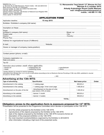 13. Warszawskie Targi Sztuki/ 13th Warsaw Art Fair REMPEX Sp. z o. o. ul. Barcicka 38, 01-839 Warszawa, Poland mobile. +48/ (22) 826 64 82 Bank account: PKO BP X O/ Warszawa Account number: 07 1020 1013 0000 0102 0205 0789 PKO BP; SWIFT: BPKOPLPW Warsaw District Court XIII, 13th Division of National Court Register KRS Register number: 0000020892 Share capital: 61 000,00 PLN Warsaw 9-11 october 2015 Arkady Kubickiego Royal Castle Warsaw mail: [email protected] mobile.: +48 669 111 109 APPLICATION FORM 15 may 2015 Application deadline: Exhibitor / Exhibitor’s company (full name): ......................................................................................................................................................................................................... Inscription on frieze:............................................................................................................................................ Payer: .............................................................................................................................................................................................. Exhibitor’s company (full name):................................................................................Street, no: .................................................... Postal code:................................................................................................................City:.............................................................. District:........................................................................................................................Country:....................................................... Phone /Fax:...................................................................................................................................................................................... Address for organizational issues (if different):............................................................................................................................... …..................................................................................................................................................................................................... E-mail:............................................................................ Website:.................................................................................................. Owner or manager of company (name,position): ......................................................................................................................................................................................................... ................... Contact person (phone, e-mail):: ......................................................................................................................................................................................................... Company registration no:................................................................................................................................................................ Date and place:............................................................................................................................................................................... Tax ID: ............................................................................................................................................................................................ Information about exhibitor: (mark where applicable) □ former art □ contemporary art □ trader □ publishing house □ manufacturer □ others.............................................................................. I hereby declare my consent to receive marketing information from Rempex Sp. z o.o. on a/m e-mail adress (according to Act on Electronic Service Providing of 18th July 2002, published in Journal of Laws no 144 item 1204). □ YES □ NO Advertising at the 13th WTS: Net lease price Type of advertising Specification Advertisement in the catalog - 1 catalog page Advertisement in the catalog - 1 catalog page / Inner cover page 1 000,00 zł Advertisement on the plan of the fair - Advertisement on the plan of a fair, size 4x4cm (15% of area) 1 200,00 zł Advertising on the website - banner /1 month 800,00 zł Advertising on the website - banner / 2 weeks 500,00 zł 800,00 zł TOTAL: Obligatory annex to the application form is exposure proposal for 13 th WTS: *Presentation will be presented to the Programme Committee which decides on participation at the 13th WTS 1 all of the artists proposed by the Exhibitor at the 13th WTS reproductions of the objects proposed by the Exhibitor at the 13th WTS style of the objects proposed by the Exhibitor at the 13th WTS /concerns former art description of the proposed exhibition on the 13th WTS the most important events/exhibitions organized by the Exhibitor in 2014/2015 other information indicating a high level of the presented works Order We order exhibition space as follows: [Please mark "X" at the appropriate row in the table in accordance with the proposed exposure] PUBLISHING, COMPANY, EDUCATION, OTHER Kind of space Available Net lease price* 1,5x3 m - 4,5m2 2 1 700,00 zł 1,5x6 m - 9m2 1 3 500,00 zł 1,5x1,5 m – 2m2 6 (niche by the windows)*** 1 300,00 zł Order Comments CONTEMPORARY ART 1,5x4 m - 6m2 2 2 500,00 zł 1,5x5 m - 7,5m2 10 3 000,00 zł 1,5x6 m - 9m2 12 3 500,00 zł 3x5 m - 15m2 4 4 500,00 zł 25m2 - Nisza 4 5 000,00 zł 10x3 m - 30m2 1 9 000,00 zł FORMER ART 1,5x3 m - 4,5 m2 2 1 700,00 zł 1,5x4 m - 6m2 6 2 500,00 zł 1,5x5 m - 7,5m2 2 3 000,00 zł 1,5x6 m - 9m2 2 3 500,00 zł 4x3 m - 12m2 1 4 100,00 zł 5x3 m - 15m2 1 4 500,00 zł 6x3 m - 18m2 1 5 000,00 zł 25m2 - Nisza 2 5 000,00 zł TOTAL: *The prices do not include VAT. ** Information about avilable spaces on the web site www.warszwskietargisztuki.pl Basic Stand equipment: ***