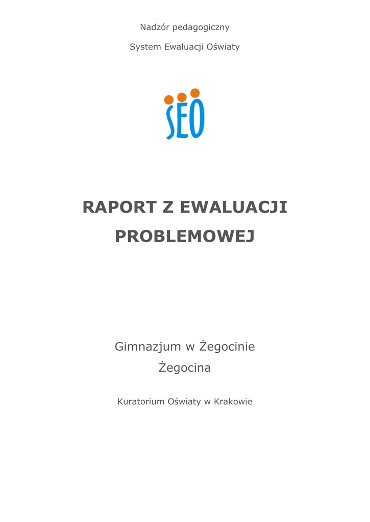 Nadzór pedagogiczny System Ewaluacji Oświaty RAPORT Z EWALUACJI PROBLEMOWEJ Gimnazjum w Żegocinie Żegocina Kuratorium Oświaty w Krakowie Wstęp Prezentowany raport jest rezultatem ewaluacji zewnętrznej przeprowadzonej w szkole przez wizytatorów do spraw ewaluacji. Raport z ewaluacji problemowej dotyczy jednego lub kilku z przedstawionych poniżej wymagań państwa. Ewaluacja zewnętrzna polega na zbieraniu i analizowaniu informacji na temat funkcjonowania szkoły w obszarach wyznaczonych przez wymagania państwa: 1. Szkoła lub placówka realizuje koncepcję pracy ukierunkowaną na rozwój uczniów. 2. Procesy edukacyjne są zorganizowane w sposób sprzyjający uczeniu się. 3. Uczniowie nabywają wiadomości i umiejętności określone w podstawie programowej. 4. Uczniowie są aktywni. 5. Respektowane są normy społeczne. 6. Szkoła lub placówka wspomaga rozwój uczniów, z uwzględnieniem ich indywidualnej sytuacji. 7. Nauczyciele współpracują w planowaniu i realizowaniu procesów edukacyjnych. 8. Promowana jest wartość edukacji. 9. Rodzice są partnerami szkoły lub placówki. 10. Wykorzystywane są zasoby szkoły lub placówki oraz środowiska lokalnego na rzecz wzajemnego rozwoju. 11. Szkoła lub placówka, organizując procesy edukacyjne, uwzględnia wnioski z analizy wyników sprawdzianu, egzaminu gimnazjalnego, egzaminu maturalnego, egzaminu potwierdzającego kwalifikacje zawodowe i egzaminu potwierdzającego kwalifikacje w zawodzie oraz innych badań zewnętrznych i wewnętrznych. 12. Zarządzanie szkołą lub placówką służy jej rozwojowi. Ewaluacja ma także na celu ustalenie poziomu spełniania przez szkołę wymagań zawartych w rozporządzeniu Ministra Edukacji Narodowej z dnia 7.10.2009r. wraz ze zmianami z dnia 10.05.2013r. Szkoła może spełniać te wymagania na pięciu poziomach: ● Poziom E - oznaczający niski stopień wypełniania wymagania przez szkołę. ● Poziom D - oznaczający podstawowy stopień wypełniania wymagania przez szkołę. ● Poziom C - oznaczający średni stopień wypełniania wymagania przez szkołę. ● Poziom B - oznaczający wysoki stopień wypełniania wymagania przez szkołę. ● Poziom A - oznaczający bardzo wysoki stopień wypełniania wymagania przez szkołę. Gimnazjum w Żegocinie 2/26 Opis metodologii Badanie zostało zrealizowane w dniach 01-12-2014 - 12-12-2014 przez zespół wizytatorów ds. ewaluacji, w skład którego weszli: Franciszek Wantuch, Krystyna Srebro. Badaniem objęto 79 uczniów (ankieta i wywiad grupowy), 56 rodziców (ankieta i wywiad grupowy) i 21 nauczycieli (ankieta i wywiad grupowy). Przeprowadzono wywiad indywidualny z dyrektorem placówki, grupowy z przedstawicielami partnerów szkoły, a także obserwacje lekcji i analizę dokumentacji. Na podstawie zebranych danych został sporządzony raport, który obejmuje podstawowe obszary działania szkoły. Wyjaśnienie skrótów dla narzędzi: OZ - Arkusz obserwacji zajęć AD - Kwestionariusz ankiety dla dyrektora/dyrektorki szkoły AN - Kwestionariusz ankiety dla nauczycieli AR - Kwestionariusz ankiety dla rodziców AMD - Kwestionariusz ankiety dla uczniów "Mój dzień" AMS - Kwestionariusz ankiety dla uczniów "Moja szkoła" ADZ - Kwestionariusz badania "Analiza danych zastanych" WN - Scenariusz wywiadu grupowego z nauczycielami WR - Scenariusz wywiadu grupowego z rodzicami WU - Scenariusz wywiadu grupowego z uczniami WD - Scenariusz wywiadu z dyrektorem/dyrektorką szkoły WNPO - Scenariusz wywiadu z nauczycielem po obserwacji WP - Scenariusz wywiadu z partnerami WNO - Scenariusz wywiadu z zespołem nauczycieli uczących w jednym oddziale Gimnazjum w Żegocinie 3/26 Obraz szkoły Gimnazjum wchodzi w skład Zespołu Szkół im Św. Jadwigi Królowej w Żegocinie, dla którego organem prowadzącym jest Gmina Żegocina. Systematycznie rozbudowywana i modernizowana baza lokalowa i zaplecze sportowe pozwalają planować i realizować proces edukacyjny. W szkole prowadzona jest diagnoza osiągnięć uczniów z poprzedniego etapu edukacyjnego, której wyniki są wykorzystywane w pracy. Nauczyciele monitorują osiągnięcia uczniów na różne sposoby, a wnioski z analizy osiągnięć najczęściej wykorzystują do indywidualizacji nauczania. Szkoła rozpoznaje potrzeby rozwojowe i możliwości psychofizyczne wszystkich uczniów, a także podejmuje działania adekwatne do ich rozpoznania, które odpowiadają potrzebom uczniów i są zgodne z oczekiwaniami rodziców. Szkoła podejmuje działania antydyskryminacyjne adekwatne do specyfiki placówki. W szkole prowadzone są badania wewnętrzne, których wyniki uwzględniane są, m. in. do planowania zajęć dodatkowych i ukierunkowania uczniów w zakresie wyboru dalszego kształcenia. Gimnazjum w Żegocinie 4/26 Informacja o placówce Nazwa placówki Patron Gimnazjum w Żegocinie Typ placówki Gimnazjum Miejscowość Żegocina Ulica Numer 50 Kod pocztowy 32-731 Urząd pocztowy Żegocina Telefon 0146132120 Fax 0146132120 Www zswzegocinie.republika.pl Regon 85262273300000 Publiczność publiczna Kategoria uczniów Dzieci lub młodzież Charakter brak specyfiki Uczniowie, wychow., słuchacze 98 Oddziały 6 Nauczyciele pełnozatrudnieni 3.00 Nauczyciele niepełnozat. (stos.pracy) 20.00 Nauczyciele niepełnozat._(w etatach) 12.08 Średnia liczba uczących się w oddziale 16.33 Liczba uczniów przypadających na jednego pełnozatrudnionego nauczyciela 32.67 Województwo MAŁOPOLSKIE Powiat bocheński Gmina Żegocina Typ gminy gmina wiejska Gimnazjum w Żegocinie 5/26 Poziom spełniania wymagań państwa Uczniowie nabywają wiadomości i umiejętności określone w podstawie programowej B W szkole lub placówce realizuje się podstawę programową uwzględniając osiągnięcia uczniów z poprzedniego etapu edukacyjnego (D) Podstawa programowa jest realizowana z wykorzystaniem zalecanych warunków i sposobów jej realizacji (D) W szkole lub placówce monitoruje się i analizuje osiągnięcia każdego ucznia,