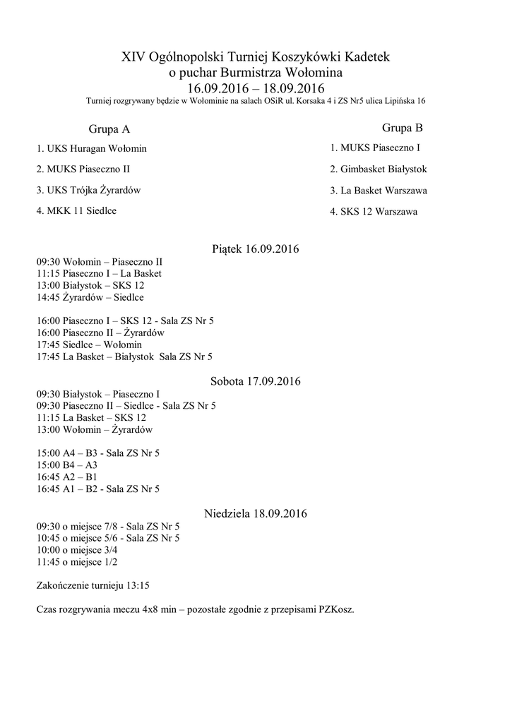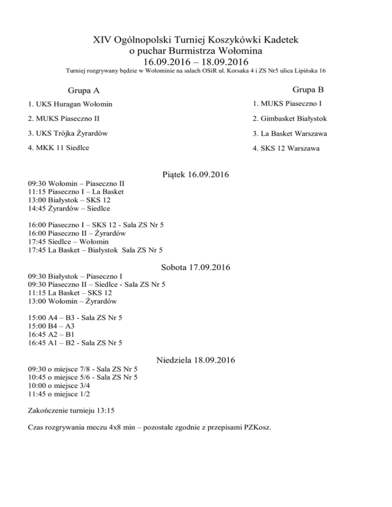 XIV Ogólnopolski Turniej Koszykówki Kadetek o puchar Burmistrza Wołomina 16.09.2016 – 18.09.2016 Turniej rozgrywany będzie w Wołominie na salach OSiR ul. Korsaka 4 i ZS Nr5 ulica Lipińska 16 Grupa B Grupa A 1. UKS Huragan Wołomin 1. MUKS Piaseczno I 2. MUKS Piaseczno II 2. Gimbasket Białystok 3. UKS Trójka Żyrardów 3. La Basket Warszawa 4. MKK 11 Siedlce 4. SKS 12 Warszawa Piątek 16.09.2016 09:30 Wołomin – Piaseczno II 11:15 Piaseczno I – La Basket 13:00 Białystok – SKS 12 14:45 Żyrardów – Siedlce 16:00 Piaseczno I – SKS 12 - Sala ZS Nr 5 16:00 Piaseczno II – Żyrardów 17:45 Siedlce – Wołomin 17:45 La Basket – Białystok Sala ZS Nr 5 Sobota 17.09.2016 09:30 Białystok – Piaseczno I 09:30 Piaseczno II – Siedlce - Sala ZS Nr 5 11:15 La Basket – SKS 12 13:00 Wołomin – Żyrardów 15:00 A4 – B3 - Sala ZS Nr 5 15:00 B4 – A3 16:45 A2 – B1 16:45 A1 – B2 - Sala ZS Nr 5 Niedziela 18.09.2016 09:30 o miejsce 7/8 - Sala ZS Nr 5 10:45 o miejsce 5/6 - Sala ZS Nr 5 10:00 o miejsce 3/4 11:45 o miejsce 1/2 Zakończenie turnieju 13:15 Czas rozgrywania meczu 4x8 min – pozostałe zgodnie z przepisami PZKosz.