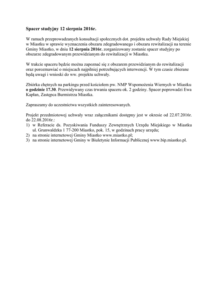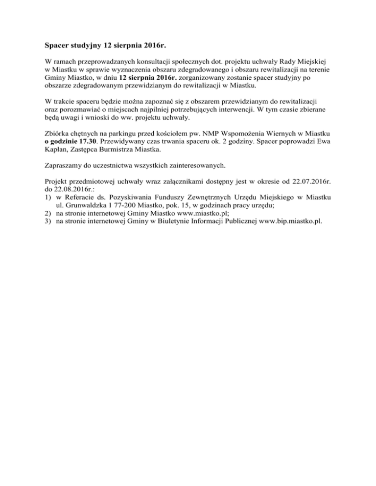 Spacer studyjny 12 sierpnia 2016r. W ramach przeprowadzanych konsultacji społecznych dot. projektu uchwały Rady Miejskiej w Miastku w sprawie wyznaczenia obszaru zdegradowanego i obszaru rewitalizacji na terenie Gminy Miastko, w dniu 12 sierpnia 2016r. zorganizowany zostanie spacer studyjny po obszarze zdegradowanym przewidzianym do rewitalizacji w Miastku. W trakcie spaceru będzie można zapoznać się z obszarem przewidzianym do rewitalizacji oraz porozmawiać o miejscach najpilniej potrzebujących interwencji. W tym czasie zbierane będą uwagi i wnioski do ww. projektu uchwały. Zbiórka chętnych na parkingu przed kościołem pw. NMP Wspomożenia Wiernych w Miastku o godzinie 17.30. Przewidywany czas trwania spaceru ok. 2 godziny. Spacer poprowadzi Ewa Kapłan, Zastępca Burmistrza Miastka. Zapraszamy do uczestnictwa wszystkich zainteresowanych. Projekt przedmiotowej uchwały wraz załącznikami dostępny jest w okresie od 22.07.2016r. do 22.08.2016r.: 1) w Referacie ds. Pozyskiwania Funduszy Zewnętrznych Urzędu Miejskiego w Miastku ul. Grunwaldzka 1 77-200 Miastko, pok. 15, w godzinach pracy urzędu; 2) na stronie internetowej Gminy Miastko www.miastko.pl; 3) na stronie internetowej Gminy w Biuletynie Informacji Publicznej www.bip.miastko.pl.
