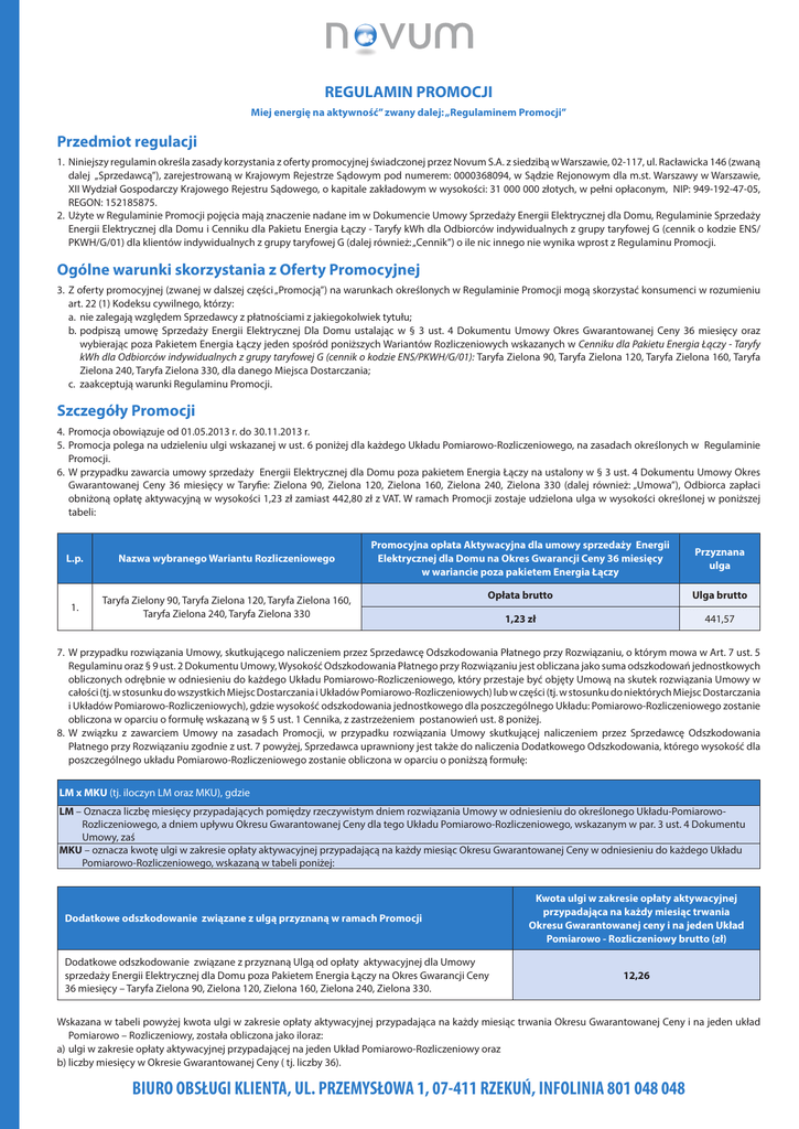 REGULAMIN PROMOCJI Miej energię na aktywność” zwany dalej: „Regulaminem Promocji” Przedmiot regulacji 1. Niniejszy regulamin określa zasady korzystania z oferty promocyjnej świadczonej przez Novum S.A. z siedzibą w Warszawie, 02-117, ul. Racławicka 146 (zwaną dalej „Sprzedawcą”), zarejestrowaną w Krajowym Rejestrze Sądowym pod numerem: 0000368094, w Sądzie Rejonowym dla m.st. Warszawy w Warszawie, XII Wydział Gospodarczy Krajowego Rejestru Sądowego, o kapitale zakładowym w wysokości: 31 000 000 złotych, w pełni opłaconym, NIP: 949-192-47-05, REGON: 152185875. 2. Użyte w Regulaminie Promocji pojęcia mają znaczenie nadane im w Dokumencie Umowy Sprzedaży Energii Elektrycznej dla Domu, Regulaminie Sprzedaży Energii Elektrycznej dla Domu i Cenniku dla Pakietu Energia Łączy - Taryfy kWh dla Odbiorców indywidualnych z grupy taryfowej G (cennik o kodzie ENS/ PKWH/G/01) dla klientów indywidualnych z grupy taryfowej G (dalej również: „Cennik”) o ile nic innego nie wynika wprost z Regulaminu Promocji. Ogólne warunki skorzystania z Oferty Promocyjnej 3.Z oferty promocyjnej (zwanej w dalszej części „Promocją”) na warunkach określonych w Regulaminie Promocji mogą skorzystać konsumenci w rozumieniu art. 22 (1) Kodeksu cywilnego, którzy: a. nie zalegają względem Sprzedawcy z płatnościami z jakiegokolwiek tytułu; b.podpiszą umowę Sprzedaży Energii Elektrycznej Dla Domu ustalając w § 3 ust. 4 Dokumentu Umowy Okres Gwarantowanej Ceny 36 miesięcy oraz wybierając poza Pakietem Energia Łączy jeden spośród poniższych Wariantów Rozliczeniowych wskazanych w Cenniku dla Pakietu Energia Łączy - Taryfy kWh dla Odbiorców indywidualnych z grupy taryfowej G (cennik o kodzie ENS/PKWH/G/01): Taryfa Zielona 90, Taryfa Zielona 120, Taryfa Zielona 160, Taryfa Zielona 240, Taryfa Zielona 330, dla danego Miejsca Dostarczania; c. zaakceptują warunki Regulaminu Promocji. Szczegóły Promocji 4. Promocja obowiązuje od 01.05.2013 r. do 30.11.2013 r. 5.Promocja polega na udzieleniu ulgi wskazanej w ust. 6 poniżej dla każdego Układu Pomiarowo-Rozliczeniowego, na zasadach określonych w Regulaminie Promocji. 6.W przypadku zawarcia umowy sprzedaży Energii Elektrycznej dla Domu poza pakietem Energia Łączy na ustalony w § 3 ust. 4 Dokumentu Umowy Okres Gwarantowanej Ceny 36 miesięcy w Taryfie: Zielona 90, Zielona 120, Zielona 160, Zielona 240, Zielona 330 (dalej również: „Umowa”), Odbiorca zapłaci obniżoną opłatę aktywacyjną w wysokości 1,23 zł zamiast 442,80 zł z VAT. W ramach Promocji zostaje udzielona ulga w wysokości określonej w poniższej tabeli: L.p. Nazwa wybranego Wariantu Rozliczeniowego 1. Taryfa Zielony 90, Taryfa Zielona 120, Taryfa Zielona 160, Taryfa Zielona 240, Taryfa Zielona 330 Promocyjna opłata Aktywacyjna dla umowy sprzedaży Energii Elektrycznej dla Domu na Okres Gwarancji Ceny 36 miesięcy w wariancie poza pakietem Energia Łączy Przyznana ulga Opłata brutto Ulga brutto 1,23 zł 441,57 7. W przypadku rozwiązania Umowy, skutkującego naliczeniem przez Sprzedawcę Odszkodowania Płatnego przy Rozwiązaniu, o którym mowa w Art. 7 ust. 5 Regulaminu oraz § 9 ust. 2 Dokumentu Umowy, Wysokość Odszkodowania Płatnego przy Rozwiązaniu jest obliczana jako suma odszkodowań jednostkowych obliczonych odrębnie w odniesieniu do każdego Układu Pomiarowo-Rozliczeniowego, który przestaje być objęty Umową na skutek rozwiązania Umowy w całości (tj. w stosunku do wszystkich Miejsc Dostarczania i Układów Pomiarowo-Rozliczeniowych) lub w części (tj. w stosunku do niektórych Miejsc Dostarczania i Układów Pomiarowo-Rozliczeniowych), gdzie wysokość odszkodowania jednostkowego dla poszczególnego Układu: Pomiarowo-Rozliczeniowego zostanie obliczona w oparciu o formułę wskazaną w § 5 ust. 1 Cennika, z zastrzeżeniem postanowień ust. 8 poniżej. 8.W związku z zawarciem Umowy na zasadach Promocji, w przypadku rozwiązania Umowy skutkującej naliczeniem przez Sprzedawcę Odszkodowania Płatnego przy Rozwiązaniu zgodnie z ust. 7 powyżej, Sprzedawca uprawniony jest także do naliczenia Dodatkowego Odszkodowania, którego wysokość dla poszczególnego układu Pomiarowo-Rozliczeniowego zostanie obliczona w oparciu o poniższą formułę: LM x MKU (tj. iloczyn LM oraz MKU), gdzie LM – Oznacza liczbę miesięcy przypadających pomiędzy rzeczywistym dniem rozwiązania Umowy w odniesieniu do określonego Układu-PomiarowoRozliczeniowego, a dniem upływu Okresu Gwarantowanej Ceny dla tego Układu Pomiarowo-Rozliczeniowego, wskazanym w par. 3 ust. 4 Dokumentu Umowy, zaś MKU – oznacza kwotę ulgi w zakresie opłaty aktywacyjnej przypadającą na każdy miesiąc Okresu Gwarantowanej Ceny w odniesieniu do każdego Układu Pomiarowo-Rozliczeniowego, wskazaną w tabeli poniżej: Dodatkowe odszkodowanie związane z ulgą przyznaną w ramach Promocji Dodatkowe odszkodowanie związane z przyznaną Ulgą od opłaty aktywacyjnej dla Umowy sprzedaży Energii Elektrycznej dla Domu poza Pakietem Energia Łączy na Okres Gwarancji Ceny 36 miesięcy – Taryfa Zielona 90, Zielona 120, Zielona 160, Zielona 240, Zielona 330. Kwota ulgi w zakresie opłaty aktywacyjnej przypadająca na każdy miesiąc trwania Okresu Gwarantowanej ceny i na jeden Układ Pomiarowo - Rozliczeniowy brutto (zł) 12,26 Wskazana w tabeli powyżej kwota ulgi w zakresie opłaty aktywacyjnej przypadająca na każdy miesiąc trwania Okresu Gwarantowanej Ceny i na jeden układ Pomiarowo – Rozliczeniowy, została obliczona jako iloraz: a)ulgi w zakresie opłaty aktywacyjnej przypadającej na jeden Układ Pomiarowo-Rozliczeniowy oraz b)liczby miesięcy w Okresie Gwarantowanej Ceny ( tj. liczby 36). BIURO OBSŁUGI KLIENTA, UL. PRZEMYSŁOWA 1, 07-411 RZEKUŃ, INFOLINIA 801 048 048 Pozostałe warunki Oferty 9. Niniejsza Promocja nie łączy się z innymi promocjami, chyba że regulamin innych promocji tak stanowi. 10. W sprawach nieuregulowanych Regulamine