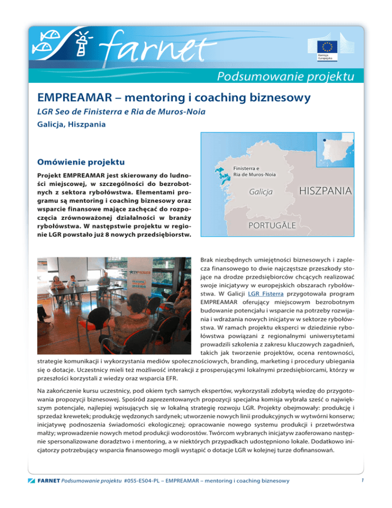 Podsumowanie projektu EMPREAMAR – mentoring i coaching biznesowy LGR Seo de Finisterra e Ria de Muros-Noia Galicja, Hiszpania Omówienie projektu Projekt EMPREAMAR jest skierowany do ludności miejscowej, w szczególności do bezrobotnych z sektora rybołówstwa. Elementami programu są mentoring i coaching biznesowy oraz wsparcie finansowe mające zachęcać do rozpoczęcia zrównoważonej działalności w branży rybołówstwa. W następstwie projektu w regionie LGR powstało już 8 nowych przedsiębiorstw. Finisterra e Ria de Muros-Noia Galicja HISZPANIA PORTUGĀLE Brak niezbędnych umiejętności biznesowych i zaplecza finansowego to dwie najczęstsze przeszkody stojące na drodze przedsiębiorców chcących realizować swoje inicjatywy w europejskich obszarach rybołówstwa. W Galicji LGR Fisterra przygotowała program EMPREAMAR oferujący miejscowym bezrobotnym budowanie potencjału i wsparcie na potrzeby rozwijania i wdrażania nowych inicjatyw w sektorze rybołówstwa. W ramach projektu eksperci w dziedzinie rybołówstwa powiązani z regionalnymi uniwersytetami prowadzili szkolenia z zakresu kluczowych zagadnień, takich jak tworzenie projektów, ocena rentowności, strategie komunikacji i wykorzystania mediów społecznościowych, branding, marketing i procedury ubiegania się o dotacje. Uczestnicy mieli też możliwość interakcji z prosperującymi lokalnymi przedsiębiorcami, którzy w przeszłości korzystali z wiedzy oraz wsparcia EFR. Na zakończenie kursu uczestnicy, pod okiem tych samych ekspertów, wykorzystali zdobytą wiedzę do przygotowania propozycji biznesowej. Spośród zaprezentowanych propozycji specjalna komisja wybrała sześć o największym potencjale, najlepiej wpisujących się w lokalną strategię rozwoju LGR. Projekty obejmowały: produkcję i sprzedaż krewetek; produkcję wędzonych sardynek; utworzenie nowych linii produkcyjnych w wytwórni konserw; inicjatywę podnoszenia świadomości ekologicznej; opracowanie nowego systemu produkcji i przetwórstwa małży; wprowadzenie nowych metod produkcji wodorostów. Twórcom wybranych inicjatyw zaoferowano następnie spersonalizowane doradztwo i mentoring, a w niektórych przypadkach udostępniono lokale. Dodatkowo inicjatorzy potrzebujący wsparcia finansowego mogli wystąpić o dotacje LGR w kolejnej turze dofinansowań. FARNET Podsumowanie projektu #055-ES04-PL – EMPREAMAR – mentoring i coaching biznesowy 1 Najważniejsze wnioski >> Znaczenie dla programów FARNET: budowanie potencjału, podnoszenie wartości lokalnych produktów rybnych i zasobów morskich, alternatywne praktyki handlowe, nowe miejsca pracy, dywersyfikacja sektora rybołówstwa. >> Rezultaty: od czasu rozpoczęcia programu EMPREAMAR 30 miejscowych bezrobotnych skorzystało ze szkoleń i coachingu, aby rozpocząć działalność w sektorze rybołówstwa. Wdrożono już osiem inicjatyw biznesowych, w związku z którymi spodziewanych jest co najmniej 10 nowych miejsc pracy. >> Możliwość przenoszenia doświadczeń w inne warunki: budowanie potencjału i rozwijanie przedsiębiorczości to priorytety dla wielu europejskich LGR. Projekty rozwijania umiejętności przedsiębiorczych oraz wsparcia dla opracowywania i wdrażania inicjatyw biznesowych mogą być remedium na problemy wielu obszarów rybołówstwa. Dodatkowo opisany projekt jest przykładem, jak LGR mogą odgrywać ważną rolę w mobilizowaniu doświadczonych beneficjentów do wspierania przyszłych przedsiębiorców. >> Uwagi końcowe: wspieranie przedsiębiorczości zazwyczaj odbywa się tylko na drodze pojedynczych działań, np. budowania potencjału lub bezpośredniego wspierania beneficjentów. EMPREAMAR demonstruje, jak LGR mogą poszerzać strategiczne podejście do przedsiębiorczości oraz wykorzystywać synergie między różnymi działaniami, takimi jak szkolenia, mentoring i coaching, jak również dotacje oraz usługi inkubatorów. Całkowity koszt i wkład EFR Całkowity koszt projektu: 51 800 € >> EFR oś 4: 38 850 € >> Współfinansowanie regionalne: 12 950 € Informacje o projekcie Tytuł: EMPREAMAR – mentoring i coaching biznesowy Czas trwania: 16 miesięcy (luty 2014 r. – czerwiec 2015 r.) Szkolenie: 4 miesiące; mentoring i coaching: 12 miesięcy Data studium przypadku: sierpień 2014 r. Promotor projektu Finisterra – Ría Muros – Noia FLAG Manuela Oviedo [email protected] +34 638 033 467 Arkusz informacyjny LGR Finisterra – Ría Muros – Noia Strona www projektu Wydawca: Komisja Europejska, Dyrekcja Generalna ds. Gospodarki Morskiej i Rybołówstwa, Dyrektor Generalny. Zastrzeżenie: Dyrekcja Generalna ds. Gospodarki Morskiej i Rybołówstwa odpowiada za całościowe wydanie niniejszego dokumentu, jednak nie odpowiada za jego treść ani nie gwarantuje poprawności danych. FARNET Podsumowanie projektu #055-ES04-PL – EMPREAMAR – mentoring i coaching biznesowy 2