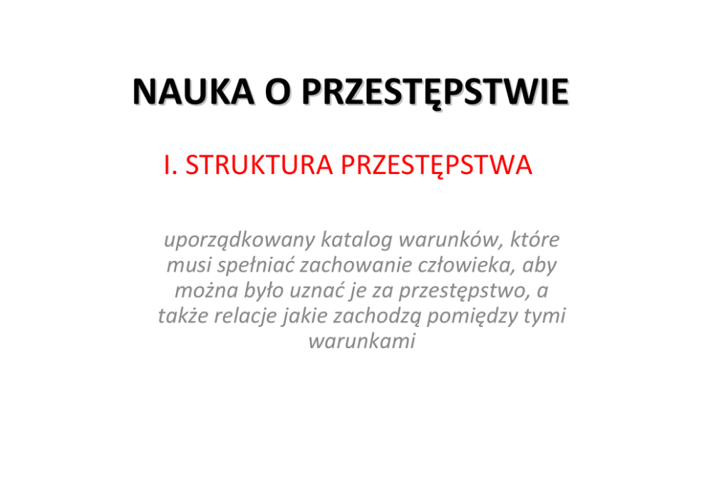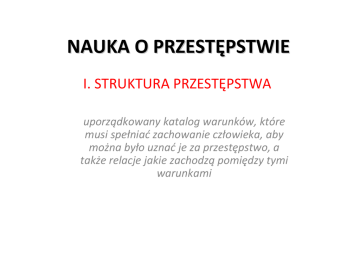 NAUKA O PRZESTĘPSTWIE I. STRUKTURA PRZESTĘPSTWA uporządkowany katalog warunków, które musi spełniać zachowanie człowieka, aby można było uznać je za przestępstwo, a także relacje jakie zachodzą pomiędzy tymi warunkami Koncepcja Belinga ‐ Warstwowe postrzeganie struktury przestępstwa ‐ Ścisłe rozgraniczenie pomiędzy poszczególnymi elementami struktury przestępstwa *czyn (rozumiany naturalistyczno‐kauzalnie) *czyn musi być zgodny z ustawową określonością czynu *czyn musi być bezprawny (sprzeczny z porządkiem prawnym, nie popełniony w warunkach wyłączających bezprawność czynu) *czyn musi być zawiniony (wina rozumiana jako stosunek psychiczny sprawcy do czynu) Koncepcja opracowana przez doktrynę radziecką *podmiot przestępstwa *strona przedmiotowa przestępstwa *przedmiot przestępstwa *strona podmiotowa przestępstwa Zasługi Profesora W. Woltera dla niezaakceptowania w polskiej doktrynie koncepcji radzieckiej Aby dany zachowania człowieka mógł zostać uznany za przestępstwo musi on: 1. zostać zakwalifikowany jako czyn 2. musi być to czyn bezprawny 3. musi być to czyn karalny 4. musi być to czyn karygodny 5. musi być to czyn zawiniony Ad. 1 teorie czynu Zaniechanie – czyn, czy brak czynu? „przyczynowość zaniechania” czy ex nihilo nihil fit ? Czyn jako zachowanie człowieka Problem odpowiedzialności karnej osób prawnych i innych jednostek organizacyjnych nie posiadających osobowości prawnej USTAWA z dnia 28 października 2002 r. o odpowiedzialności podmiotów zbiorowych za czyny zabronione pod groźbą kary. (Dz. U. z dnia 27 listopada 2002 r.) Art. 1. Ustawa określa zasady odpowiedzialności podmiotów zbiorowych za czyny zabronione pod groźbą kary jako przestępstwa lub przestępstwa skarbowe oraz zasady postępowania w przedmiocie takiej odpowiedzialności. Art. 2. 1. (1) Podmiotem zbiorowym w rozumieniu ustawy jest osoba prawna oraz jednostka organizacyjna niemająca osobowości prawnej, której odrębne przepisy przyznają zdolność prawną, z wyłączeniem Skarbu Państwa, jednostek samorządu terytorialnego i ich związków. 2. Podmiotem zbiorowym w rozumieniu ustawy jest również spółka handlowa z udziałem Skarbu Państwa, jednostki samorządu terytorialnego lub związku takich jednostek, spółka kapitałowa w organizacji, podmiot w stanie likwidacji oraz przedsiębiorca niebędący osobą fizyczną, a także zagraniczna jednostka organizacyjna. Art. 3. Podmiot zbiorowy podlega odpowiedzialności za czyn zabroniony, którym jest zachowanie osoby fizycznej: 1) działającej w imieniu lub w interesie podmiotu zbiorowego w ramach uprawnienia lub obowiązku do jego reprezentowania, podejmowania w jego imieniu decyzji lub wykonywania kontroli wewnętrznej albo przy przekroczeniu tego uprawnienia lub niedopełnieniu tego obowiązku, 2) dopuszczonej do działania w wyniku przekroczenia uprawnień lub niedopełnienia obowiązków przez osobę, o której mowa w pkt 1, 3) działającej w imieniu lub w interesie podmiotu zbiorowego, za zgodą lub wiedzą osoby, o której mowa w pkt 1 (2) (uchylony) 4) ‐ jeżeli zachowanie to przyniosło lub mogło przynieść podmiotowi zbiorowemu korzyść, chociażby niemajątkową. Ad. 2 czyn bezprawny: a) sprzeczny z normą sankcjonowaną: ‐narusza albo naraża dobro prawne na niebezpieczeństwo i ‐ narusza wykształconą przez wiedzę i doświadczenie regułę postępowania z dobrem prawnym b) nie jest popełniony w okolicznościach wyłączających bezprawność Ad. 3 czyn karalny a) zachowanie poddane prawnokarnemu wartościowaniu musi być zgodne z ustawowym wzorcem zachowania karalnego b) nie zachodzą okoliczności wyłączające karalność Ad. 4 czyn karygodny Art. 1 § 2 k.k. Nie stanowi przestępstwa czyn zabroniony, którego społeczna szkodliwość jest znikoma. Art. 115 § 2 k.k. Przy ocenie stopnia społecznej szkodliwości czynu sąd bierze pod uwagę rodzaj i charakter naruszonego dobra, rozmiary wyrządzonej lub grożącej szkody, sposób i okoliczności popełnienia czynu, wagę naruszonych przez sprawcę obowiązków, jak również postać zamiaru, motywację sprawcy, rodzaj naruszonych reguł ostrożności i stopień ich naruszenia. Ad. 5 czyn zawiniony art. 1 § 3 k.k. Nie popełnia przestępstwa sprawca czynu zabronionego, jeżeli nie można mu przypisać winy w czasie czynu. Przykłady: Art. 157 k.k. § 1. Kto powoduje naruszenie czynności narządu ciała lub rozstrój zdrowia, inny niż określony w art. 156 § 1, podlega karze pozbawienia wolności od 3 miesięcy do lat 5. § 2. Kto powoduje naruszenie czynności narządu ciała lub rozstrój zdrowia trwający nie dłużej niż 7 dni, podlega grzywnie, karze ograniczenia wolności albo pozbawienia wolności do lat 2. Art. 177 k.k. § 1. Kto, naruszając, chociażby nieumyślnie, zasady bezpieczeństwa w ruchu lądowym, wodnym lub powietrznym, powoduje nieumyślnie wypadek, w którym inna osoba odniosła obrażenia ciała określone w art. 157 § 1, podlega karze pozbawienia wolności do lat 3. § 2. Jeżeli następstwem wypadku jest śmierć innej osoby albo ciężki uszczerbek na jej zdrowiu, sprawca podlega karze pozbawienia wolności od 6 miesięcy do lat 8. Przykłady: Art. 278 k.k. § 1. Kto zabiera w celu przywłaszczenia cudzą rzecz ruchomą, podlega karze pozbawienia wolności od 3 miesięcy do lat 5. Art. 288 k.k. § 1. Kto cudzą rzecz niszczy, uszkadza lub czyni niezdatną do użytku, podlega karze pozbawienia wolności od 3 miesięcy do lat 5. Wyrok SN z dnia 25 października 1950 r., K 1119/50, OSN(K) 1951/1/12 1. Jeżeli analiza konkretnego materiału dowodowego uzasadnia ustalenie, iż autor wypowiedzi na legalnym, publicznym zgromadzeniu masowym miał zamiar przez nadużycie wolności słowa pod pozorem wypowiedzi swoich przekonań przemycić fałszywe wiadomości lub informacje, nawoływać do przestępstw lub je pochwalać, lżyć ustrój demokracji ludowej albo naród i państwo itd