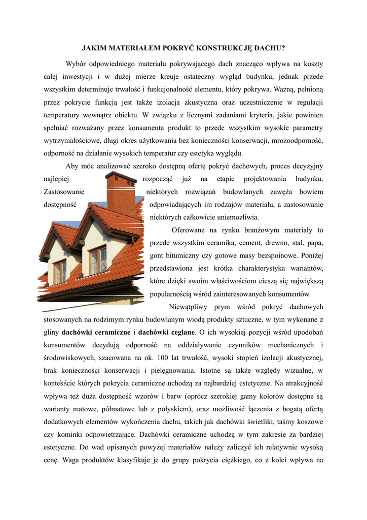 JAKIM MATERIAŁEM POKRYĆ KONSTRUKCJĘ DACHU? Wybór odpowiedniego materiału pokrywającego dach znacząco wpływa na koszty całej inwestycji i w dużej mierze kreuje ostateczny wygląd budynku, jednak przede wszystkim determinuje trwałość i funkcjonalność elementu, który pokrywa. Ważną, pełnioną przez pokrycie funkcją jest także izolacja akustyczna oraz uczestniczenie w regulacji temperatury wewnątrz obiektu. W związku z licznymi zadaniami kryteria, jakie powinien spełniać rozważany przez konsumenta produkt to przede wszystkim wysokie parametry wytrzymałościowe, długi okres użytkowania bez konieczności konserwacji, mrozoodporność, odporność na działanie wysokich temperatur czy estetyka wyglądu. Aby móc analizować szeroko dostępną ofertę pokryć dachowych, proces decyzyjny najlepiej Zastosowanie dostępność rozpocząć już na etapie projektowania niektórych rozwiązań budowlanych zawęża budynku. bowiem odpowiadających im rodzajów materiału, a zastosowanie niektórych całkowicie uniemożliwia. Oferowane na rynku branżowym materiały to przede wszystkim ceramika, cement, drewno, stal, papa, gont bitumiczny czy gotowe masy bezspoinowe. Poniżej przedstawiona jest krótka charakterystyka wariantów, które dzięki swoim właściwościom cieszą się największą popularnością wśród zainteresowanych konsumentów. Niewątpliwy prym wśród pokryć dachowych stosowanych na rodzimym rynku budowlanym wiodą produkty sztuczne, w tym wykonane z gliny dachówki ceramiczne i dachówki ceglane. O ich wysokiej pozycji wśród upodobań konsumentów decydują odporność na oddziaływanie czynników mechanicznych i środowiskowych, szacowana na ok. 100 lat trwałość, wysoki stopień izolacji akustycznej, brak konieczności konserwacji i pielęgnowania. Istotne są także względy wizualne, w kontekście których pokrycia ceramiczne uchodzą za najbardziej estetyczne. Na atrakcyjność wpływa też duża dostępność wzorów i barw (oprócz szerokiej gamy kolorów dostępne są warianty matowe, półmatowe lub z połyskiem), oraz możliwość łączenia z bogatą ofertą dodatkowych elementów wykończenia dachu, takich jak dachówki świetliki, taśmy koszowe czy kominki odpowietrzające. Dachówki ceramiczne uchodzą w tym zakresie za bardziej estetyczne. Do wad opisanych powyżej materiałów należy zaliczyć ich relatywnie wysoką cenę. Waga produktów klasyfikuje je do grupy pokrycia ciężkiego, co z kolei wpływa na ograniczenie lub uniemożliwienie realizacji niektórych wizji architektonicznych- np. poprzez limitację swobody w wyborze kształtu konstrukcji. Przynależność do określonego zespołu produktów wpływa też na zwiększenie zużycia potrzebnych materiałów. Aby skutecznie spełniały swoje zadania, dachówki ceramiczne i cementowe nie powinny być stosowane dla dachów o kącie nachylenia mniejszym niż 30 stopni- w innym przypadku może grozi im nadmierne nasiąkanie i porastanie mchem. Do popularnie stosowanych rozwiązań dachówek z grupy pokrycia lekkiego zaliczane są wykonane z włókniny szklanej lub celulozowej i pokryte obustronnie masą asfaltową i posypką mineralną dachówki bitumiczne. Cechują się wysoką odpornością na wpływ czynników atmosferycznych, w tym oddziaływanie wody i wysokich temperatur, oraz niską podatnością na działanie mechaniczne. Specyfika produktu pozwala na jego adaptację w połączeniu z niemal każdym rodzajem konstrukcji, nachylenia i stopnia skomplikowania dachu. Łatwość transportu i montażu wpływa na pozytywny bilans ekonomiczny czasu i poniesionych kosztów. Pomimo dostępności licznych wariantów kształtów i kolorystyki, pod względem wizualnym ustępują miejsca opisanym powyżej alternatywnym rozwiązaniom. Trwałość szacuje się na ok. 40 lat. Tanim, efektownym, ale niezbyt trwałym rozwiązaniem mogą być także blachy stalowe, trapezowe czy dachówki betonowe. Wybór właściwego materiału nie jest sprawą łatwą. Komponentami ostatecznej decyzji winny być więc kwestie estetyczne, techniczne i budżetowe, a wybór odpowiedniego produktu powinien być uzupełniony o rzetelne i fachowe jego zastosowanie podczas procesu montażu.