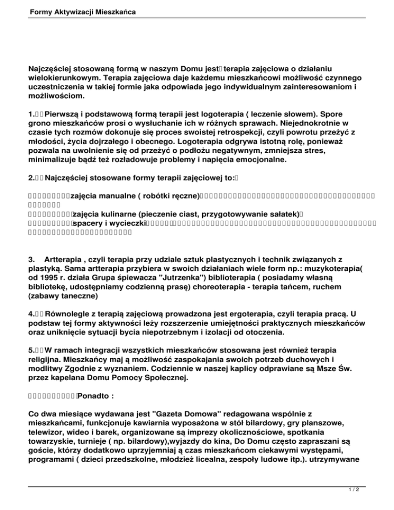 Formy Aktywizacji Mieszkańca Najczęściej stosowaną formą w naszym Domu jest terapia zajęciowa o działaniu wielokierunkowym. Terapia zajęciowa daje każdemu mieszkańcowi możliwość czynnego uczestniczenia w takiej formie jaka odpowiada jego indywidualnym zainteresowaniom i możliwościom. 1. Pierwszą i podstawową formą terapii jest logoterapia ( leczenie słowem). Spore grono mieszkańców prosi o wysłuchanie ich w różnych sprawach. Niejednokrotnie w czasie tych rozmów dokonuje się proces swoistej retrospekcji, czyli powrotu przeżyć z młodości, życia dojrzałego i obecnego. Logoterapia odgrywa istotną rolę, ponieważ pozwala na uwolnienie się od przeżyć o podłożu negatywnym, zmniejsza stres, minimalizuje bądź też rozładowuje problemy i napięcia emocjonalne. 2. Najczęściej stosowane formy terapii zajęciowej to: zajęcia manualne ( robótki ręczne) zajęcia kulinarne (pieczenie ciast, przygotowywanie sałatek) spacery i wycieczki 3. Artterapia , czyli terapia przy udziale sztuk plastycznych i technik związanych z plastyką. Sama artterapia przybiera w swoich działaniach wiele form np.: muzykoterapia( od 1995 r. działa Grupa śpiewacza "Jutrzenka") biblioterapia ( posiadamy własną bibliotekę, udostępniamy codzienną prasę) choreoterapia - terapia tańcem, ruchem (zabawy taneczne) 4. Równolegle z terapią zajęciową prowadzona jest ergoterapia, czyli terapia pracą. U podstaw tej formy aktywności leży rozszerzenie umiejętności praktycznych mieszkańców oraz uniknięcie sytuacji bycia niepotrzebnym i izolacji od otoczenia. 5. W ramach integracji wszystkich mieszkańców stosowana jest również terapia religijna. Mieszkańcy maj ą możliwość zaspokajania swoich potrzeb duchowych i modlitwy Zgodnie z wyznaniem. Codziennie w naszej kaplicy odprawiane są Msze Św. przez kapelana Domu Pomocy Społecznej. Ponadto : Co dwa miesiące wydawana jest "Gazeta Domowa" redagowana wspólnie z mieszkańcami, funkcjonuje kawiarnia wyposażona w stół bilardowy, gry planszowe, telewizor, wideo i barek, organizowane są imprezy okolicznościowe, spotkania towarzyskie, turnieje ( np. bilardowy),wyjazdy do kina, Do Domu często zapraszani są goście, którzy dodatkowo uprzyjemniaj ą czas mieszkańcom ciekawymi występami, programami ( dzieci przedszkolne, młodzież licealna, zespoły ludowe itp.). utrzymywane 1/2 Formy Aktywizacji Mieszkańca są również inne kontakty z innym pokrewnymi merytorycznie placówkami. ZAPEWNIAMY CIEPŁĄ I RODZINNĄ ATMOSFERĘ 2/2