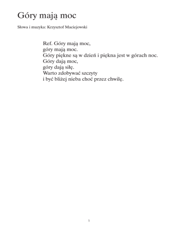 Góry mają moc Słowa i muzyka: Krzysztof Maciejowski Ref. Góry mają moc, góry mają moc. Góry piękne są w dzień i piękna jest w górach noc. Góry dają moc, góry dają siłę. Warto zdobywać szczyty i być bliżej nieba choć przez chwilę. 1