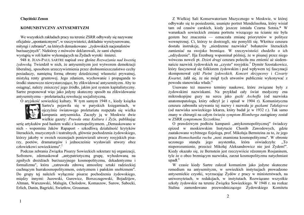 Ch ci ski Zenon KOMUNISTYCZNY ANTYSEMITYZM We wszystkich zak adach pracy na terenie ZSRR odbywa y si nazywane oficjalnie „spontanicznymi", w rzeczywisto ci, dok adnie wyre yserowane, mityngi i zebrania*, na których demaskowano „ ydowskich nacjonalistów bur uazyjnych”. Niektórzy z mówców deklarowali, e sami ch tnie wyst pi w roli katów wykonuj cych na ydach wyroki mierci. 948 R. JEAN-PAUL SARTRE napisa swe g ne Rozwa ania nad kwesti ydowsk . Twierdzi w nich, e antysemityzm jest wytworem demokracji liberalnej, sposobem urzeczywistnienia przez drobnomieszcza stwo cechy posiadaczy, nami tn form obrony dziedzicznej w asno ci prywatnej, mistyk renty gruntowej. Jego zdaniem, wychowanie i propaganda to rodki stanowczo niewystarczaj ce, by zlikwidowa antysemityzm. Aby to osi gn , nale y zniszczy jego ród o, jakim jest system kapitalistyczny. Sartre proponowa wi c jako jedyny skuteczny sposób na zlikwidowanie antysemityzmu – proletariack rewolucj socjalistyczn . O aryjsko sowieckiej kultury. W tym samym 1948 r., kiedy ksi ka Sartre'a pojawi a si w paryskich ksi garniach, w ojczy nie wiatowego proletariatu rozp ta a si wielka kampania antysemicka. Zacz y j w Moskwie dwie wielkie gazety: Prawda oraz Kultura i n, publikuj c seri artyku ów pod has em walki z kosmopolityzmem. „Demaskowano w nich - wspomina Jaków Rapaport - szkodliw dzia alno krytyków literackich, muzycznych i teatralnych, g ównie pochodzenia ydowskiego, którzy jakoby w swoich recenzjach poniewierali utwory rosyjskich pisarzy, poetów, dramaturgów i jednocze nie wys awiali utwory obce cz owiekowi sowieckiemu".2 Podczas zebrania Zwi zku Pisarzy Sowieckich sekretarz tej organizacji, Sofronow, zdemaskowa „antypatriotyczn grup , wyhodowan na zgni ych dro ach bur uazyjnego kosmopolityzmu, dekadentyzmu i formalizmu", która „zatruwa a zdrow atmosfer sztuki radzieckiej cuchn cym hurrakosmopolityzmem, estetyzmem i pa skim snobizmem". Do grupy tej nale eli wy cznie pisarze pochodzenia ydowskiego, mi dzy innymi: Juzowski, Gurewicz, Borszczagowski, Bojad ijew, Altman, Warszawski, Malugin, Cholodow, Komaszow, Surow, Subocki, Erlich, Danin, Bagricki, Swiet ow, Grossman. Z Wielkiej Sali Konserwatorium Muzycznego w Moskwie, w której odbywa o si to posiedzenie, usuni to portret Mendelssohna, który wisia tam od czasów carskich, kiedy jeszcze istnia a Czarna Sotnia.* W warunkach sowieckich zmiana portretu wisz cego na cianie nie by a gestem bez znaczenia — oznacza a zmian priorytetów w polityce wewn trznej. Ci, którzy to dostrzegli, nie pomylili si . Wkrótce cenzura dosta a instrukcje, by „nierdzenne nazwiska" bohaterów literackich zamienia na swojsko brzmi ce. W rzeczywisto ci chodzi o o ich „od ydzenie". Ilja Erenburg wspomina pó niej, e w pisanej przez niego wówczas noweli pt. Dzie drugi cenzura poleci a mu zmieni a siedemna cie nazwisk ydowskich na „czysto" rosyjskie.5 Dymitr Szostakowicz, który fascynowa si folklorem ydowskim i pod wp ywem tej fascynacji skomponowa cykl Pie ni ydowskich, Koncert skrzypcowy i Czwarty Kwartet, ali si , e nie móg tych utworów publicznie wykonywa z powodu stanowiska w adz.6 Usuwano te masowo terminy naukowe, które zwi zane by y z ydowskimi nazwiskami. Na przyk ad ca y wiat medyczny zna mikroskopijne guzy na sercu jako guzki Aschoffa (od nazwiska anatomopatologa, który odkry je i opisa w 1904 r). Komunistyczna cenzura zabroni a u ywania tej nazwy i nazwa a je guzkami Ta ajewa (od nazwiska sowieckiego lekarza, który bada je w 1932 r.). Tak samo znany w chirurgii na ca ym wiecie symptom Blomberga zast piony zosta w ZSRR symptomem Szczotkina.7 O prawdziwym pod u kampanii „antykosmopolitycznej" wiadczy epizod w moskiewskim Instytucie Chorób Zawodowych, gdzie zaatakowano wybitnego fizjologa, prof. Miko aja Bernsteina za to, e jego praca Biomechanika ruchu „nosi znamiona kosmopolityzmu". W obronie uczonego stan a jego asystentka, która o wiadczy a: „To nieporozumienie, przecie Miko aj Aleksandrowicz nie jest ydem!". Kiedy okaza o si , e Bernstein jest rzeczywi cie rdzennym Rosjaninem, tyle e o obco brzmi cym nazwisku, zarzut kosmopolityzmu natychmiast upad .8 W czasie kiedy Sartre zaleca komunizm jako jedyne skuteczne remedium na antysemityzm, w sowieckich instytucjach prowadzono antysemickie czystki, wyrzucaj c ydów z pracy w ministerstwach, na uniwersytetach, w redakcjach, w instytutach. Rozwi zano wszystkie szko y ydowskie na terenie Zwi zku Sowieckiego. W 1948 r. na rozkaz Stalina zamordowano przewodnicz cego ydowskiego Komitetu 2 1 Antyfaszystowskiego, jednego z najwybitniejszych aktorów w ZSRR, Solomona Michoelsa, wkrótce aresztowano niemal wszystkich cz onków tego komitetu, których rozstrzelano 12 sierpnia 1952 r. Jak twierdzi Jakow Rapaport, „by o to unicestwienie kultury ydowskiej w ZSRR, zlikwidowanie najwybitniejszych jej przedstawicieli".'' Kampania antysemicka rozszerzy a si na inne kraje komunistyczne, zw aszcza na Czechos owacj .10 Dwudziestego listopada w Pradze skazano na mier za udzia w „spisku trockistowsko-titoistowskosyjonistycznym" sekretarza generalnego Czechos owackiej Partii Komunistycznej Rudolfa Slansky'ego oraz trzynastu wysokich dzia aczy partyjnych, z których jedenastu by o ydami. Wielu innych skazano na do ywocie. Jeden z nich, wiceminister spraw zagranicznych, Artur London, uwolniony podczas Praskiej Wiosny w 1968 r., wspomina po latach, jak zachowywa si podczas przes ucha ledczy: „Chwyci mnie za gard o i g osem trz cym si z nienawi ci krzycza : «Ty i twoja brudna rasa, zniszczymy j . Nie wszystko, co zrobi Hitler, by o s uszne. Ale zniszczy ydów i to by o dobre. Zbyt wielu z nich uda o si unikn komory gazowej, ale my doko czymy to, co on zacz »." Ofiarami czystek antysemickich pad o wielu dzia aczy partyjnych w innych krajach komunistycznych, na przyk ad Laszlo Rajk na W grzech czy Anna Pauker w Rumunii. Strach pad równie na przywódców komunistycznych ydowskiego pochodzenia w Polsce. Jak wspomina Alicja Wetz, lewicowo 