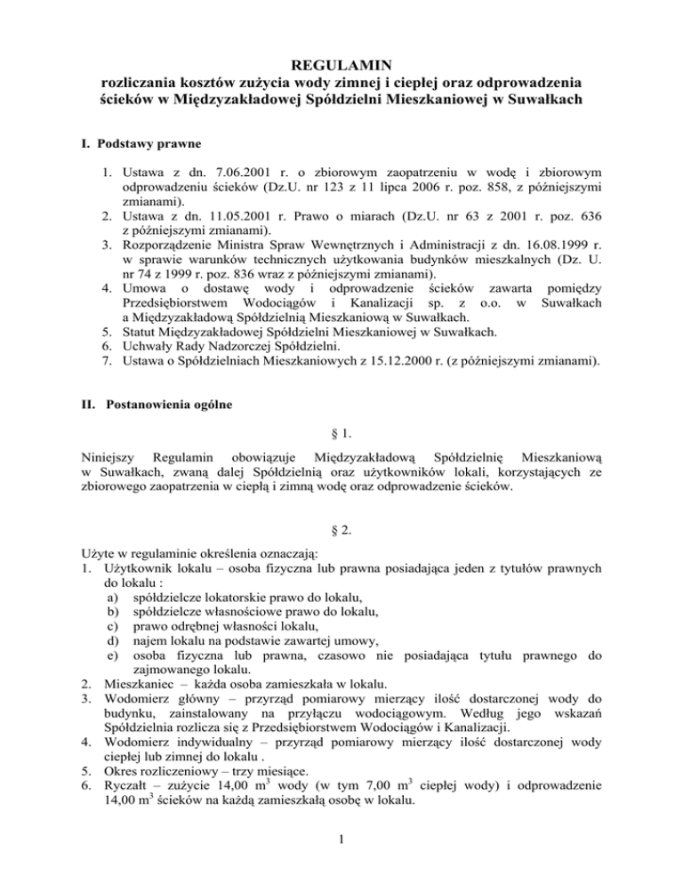 REGULAMIN rozliczania kosztów zuŜycia wody zimnej i ciepłej oraz odprowadzenia ścieków w Międzyzakładowej Spółdzielni Mieszkaniowej w Suwałkach I. Podstawy prawne 1. Ustawa z dn. 7.06.2001 r. o zbiorowym zaopatrzeniu w wodę i zbiorowym odprowadzeniu ścieków (Dz.U. nr 123 z 11 lipca 2006 r. poz. 858, z późniejszymi zmianami). 2. Ustawa z dn. 11.05.2001 r. Prawo o miarach (Dz.U. nr 63 z 2001 r. poz. 636 z późniejszymi zmianami). 3. Rozporządzenie Ministra Spraw Wewnętrznych i Administracji z dn. 16.08.1999 r. w sprawie warunków technicznych uŜytkowania budynków mieszkalnych (Dz. U. nr 74 z 1999 r. poz. 836 wraz z późniejszymi zmianami). 4. Umowa o dostawę wody i odprowadzenie ścieków zawarta pomiędzy Przedsiębiorstwem Wodociągów i Kanalizacji sp. z o.o. w Suwałkach a Międzyzakładową Spółdzielnią Mieszkaniową w Suwałkach. 5. Statut Międzyzakładowej Spółdzielni Mieszkaniowej w Suwałkach. 6. Uchwały Rady Nadzorczej Spółdzielni. 7. Ustawa o Spółdzielniach Mieszkaniowych z 15.12.2000 r. (z późniejszymi zmianami). II. Postanowienia ogólne § 1. Niniejszy Regulamin obowiązuje Międzyzakładową Spółdzielnię Mieszkaniową w Suwałkach, zwaną dalej Spółdzielnią oraz uŜytkowników lokali, korzystających ze zbiorowego zaopatrzenia w ciepłą i zimną wodę oraz odprowadzenie ścieków. § 2. UŜyte w regulaminie określenia oznaczają: 1. UŜytkownik lokalu – osoba fizyczna lub prawna posiadająca jeden z tytułów prawnych do lokalu : a) spółdzielcze lokatorskie prawo do lokalu, b) spółdzielcze własnościowe prawo do lokalu, c) prawo odrębnej własności lokalu, d) najem lokalu na podstawie zawartej umowy, e) osoba fizyczna lub prawna, czasowo nie posiadająca tytułu prawnego do zajmowanego lokalu. 2. Mieszkaniec – kaŜda osoba zamieszkała w lokalu. 3. Wodomierz główny – przyrząd pomiarowy mierzący ilość dostarczonej wody do budynku, zainstalowany na przyłączu wodociągowym. Według jego wskazań Spółdzielnia rozlicza się z Przedsiębiorstwem Wodociągów i Kanalizacji. 4. Wodomierz indywidualny – przyrząd pomiarowy mierzący ilość dostarczonej wody ciepłej lub zimnej do lokalu . 5. Okres rozliczeniowy – trzy miesiące. 6. Ryczałt – zuŜycie 14,00 m3 wody (w tym 7,00 m3 ciepłej wody) i odprowadzenie 14,00 m3 ścieków na kaŜdą zamieszkałą osobę w lokalu. 1 7. ZuŜycie wody – suma zuŜytych ilości m³ wody zimnej i odprowadzenia ścieków oraz wody ciepłej. 8. Zaliczka miesięczna – naleŜność na poczet zuŜycia zimnej wody, odprowadzenia ścieków i podgrzania wody. 9. Opłata miesięczna stała – opłata od jednego lokalu, wyposaŜonego w wodomierze, wnoszona miesięcznie, przeznaczona na wymianę i legalizację wodomierzy, odczyty oraz pokrycie rozbieŜności bilansu wody. 10. Rozliczenie zuŜycia wody – dokument przedstawiający wyliczenie naleŜności za zuŜycie wody i odprowadzenie ścieków za dany okres rozliczeniowy. 11. RozbieŜności bilansu wody w nieruchomości – róŜnica wody pomiędzy wskazaniem wodomierza głównego a sumą wskazań wodomierzy indywidualnych odbiorców w danej nieruchomości. 12. Nieruchomość – budynek lub grupa budynków rozliczana z jednego wodomierza. 13. Odczytujący – osoba zatrudniona przez Spółdzielnię dokonująca odczytów wskazań wodomierzy, upowaŜniona do kontroli urządzeń i ich zabezpieczeń, sprawdzenia prawidłowego działania wodomierzy poprzez chwilowe uruchomienie poboru wody. § 3. Wodomierze ciepłej i zimnej wody do pomiaru zuŜycia wody w lokalu są własnością uŜytkownika lokalu – nie dotyczy to uŜytkownika będącego najemcą lokalu. § 4. Ceny wody i odprowadzenia ścieków: 1. Cena za 1 m3 zimnej wody i 1 m3 odprowadzenia ścieków ustalana jest przez właściwy organ zgodnie z Ustawą o zbiorowym zaopatrzeniu w wodę i zbiorowym odprowadzeniu ścieków. 2. Cena za 1 m3 podgrzania wody ustalana jest przez Radę Nadzorczą Spółdzielni. 3. Opłatę miesięczną stałą ustala Rada Nadzorcza. III. Zasady rozliczeń zuŜycia wody i odprowadzenia ścieków. § 5. 1. Rozliczenie kosztów zuŜycia i podgrzania wody jest dokonywane oddzielnie dla kaŜdej nieruchomości. Ilość odprowadzanych ścieków jest równa ilości zuŜytej wody w danym okresie. 2. Dostawca wody raz w miesiącu obciąŜa kaŜdą nieruchomość za zuŜycie wody i odprowadzenie ścieków na podstawie odczytów wodomierzy głównych w budynku. § 6. Rozliczanie zuŜycia wody i odprowadzenia ścieków w mieszkaniach z zainstalowanymi licznikami wody. 1. Podstawą płatności za zuŜycie wody zimnej, ciepłej i ścieków są wskazania indywidualnych wodomierzy. 2 2. Za zuŜycie wody zimnej, ciepłej i odprowadzenie ścieków ustalana jest miesięczna zaliczka, która rozliczana będzie w okresach trzech miesięcy. 3. Miesięczna zaliczka ustalana jest na podstawie wielkości zuŜycia wody zimnej i ciepłej z sześciu miesięcy w danym lokalu. Zmiana wysokości zaliczki następuje raz w roku wraz ze zmianą stawek opłat eksploatacyjnych. 4. W przypadku braku zuŜycia za podstawę ustalenia miesięcznej zaliczki przyjmuje się szacunkowo: zuŜycie wody – 8 m³ wody, podgrzanie – 4 m³ wody. 5. UŜytkownik na poczet naleŜności za zuŜycie zimnej wody, odprowadzenie ścieków i podgrzanie wody wnosi zaliczki miesięczne łącznie z innymi opłatami eksploatacyjnymi. 6. W przypadku wystąpienia niedopłaty po rozliczeniu trzech miesięcy – kwotę niedopłaty naleŜy uiścić wraz z najbliŜszą opłatą eksploatacyjną. 7. W przypadku wystąpienia nadpłaty po rozliczeniu trzech miesięcy – kwotę nadpłaty naleŜy uwzględnić przy najbliŜszej opłacie eksploatacyjnej. 8. W przypadku zbycia lokalu w trakcie okresu rozliczeniowego, wszelkie skutki rozliczenia przejmuje następca. 9. W przypadku przekazania lokalu na rzecz Spółdzielni dokonuje się odczytu i rozliczenia zuŜycia wody i odprowadzenia ścieków oraz podgrzania wody w daci