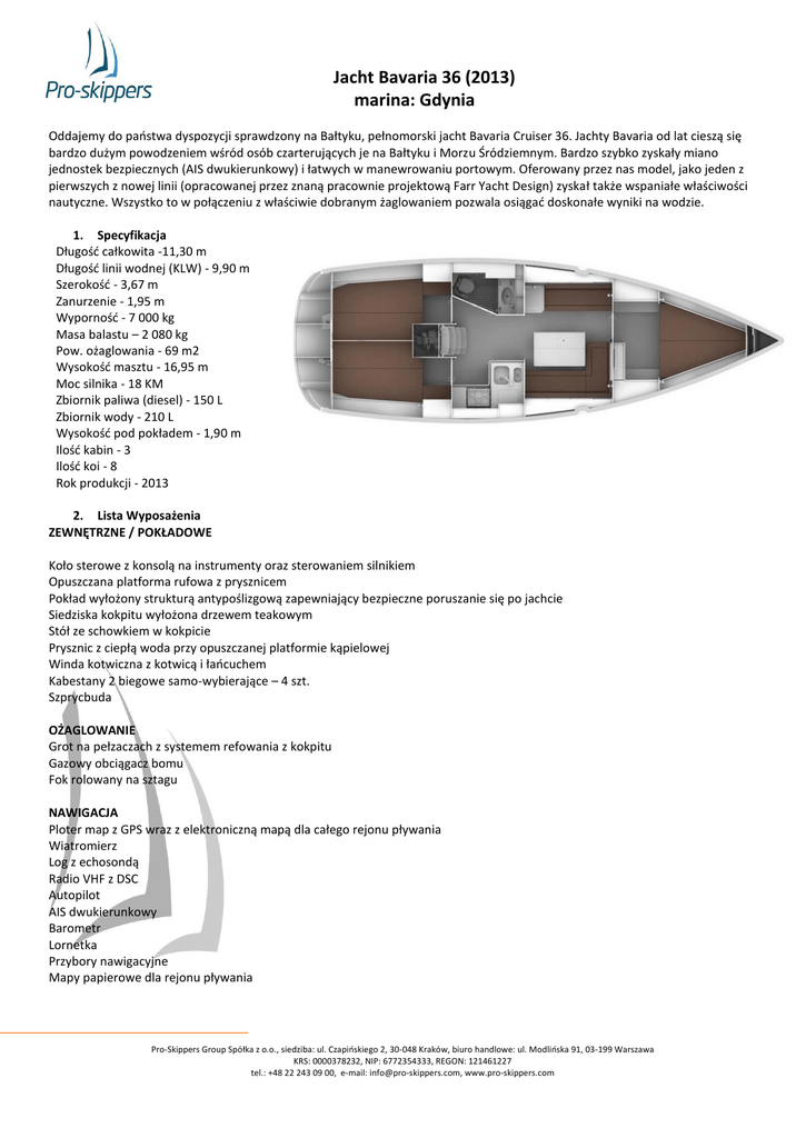 Jacht Bavaria 36 (2013) marina: Gdynia Oddajemy do państwa dyspozycji sprawdzony na Bałtyku, pełnomorski jacht Bavaria Cruiser 36. Jachty Bavaria od lat cieszą się bardzo dużym powodzeniem wśród osób czarterujących je na Bałtyku i Morzu Śródziemnym. Bardzo szybko zyskały miano jednostek bezpiecznych (AIS dwukierunkowy) i łatwych w manewrowaniu portowym. Oferowany przez nas model, jako jeden z pierwszych z nowej linii (opracowanej przez znaną pracownie projektową Farr Yacht Design) zyskał także wspaniałe właściwości nautyczne. Wszystko to w połączeniu z właściwie dobranym żaglowaniem pozwala osiągać doskonałe wyniki na wodzie. 1. Specyfikacja Długość całkowita -11,30 m Długość linii wodnej (KLW) - 9,90 m Szerokość - 3,67 m Zanurzenie - 1,95 m Wyporność - 7 000 kg Masa balastu – 2 080 kg Pow. ożaglowania - 69 m2 Wysokość masztu - 16,95 m Moc silnika - 18 KM Zbiornik paliwa (diesel) - 150 L Zbiornik wody - 210 L Wysokość pod pokładem - 1,90 m Ilość kabin - 3 Ilość koi - 8 Rok produkcji - 2013 2. Lista Wyposażenia ZEWNĘTRZNE / POKŁADOWE Koło sterowe z konsolą na instrumenty oraz sterowaniem silnikiem Opuszczana platforma rufowa z prysznicem Pokład wyłożony strukturą antypoślizgową zapewniający bezpieczne poruszanie się po jachcie Siedziska kokpitu wyłożona drzewem teakowym Stół ze schowkiem w kokpicie Prysznic z ciepłą woda przy opuszczanej platformie kąpielowej Winda kotwiczna z kotwicą i łańcuchem Kabestany 2 biegowe samo-wybierające – 4 szt. Szprycbuda OŻAGLOWANIE Grot na pełzaczach z systemem refowania z kokpitu Gazowy obciągacz bomu Fok rolowany na sztagu NAWIGACJA Ploter map z GPS wraz z elektroniczną mapą dla całego rejonu pływania Wiatromierz Log z echosondą Radio VHF z DSC Autopilot AIS dwukierunkowy Barometr Lornetka Przybory nawigacyjne Mapy papierowe dla rejonu pływania Pro-Skippers Group Spółka z o.o., siedziba: ul. Czapińskiego 2, 30-048 Kraków, biuro handlowe: ul. Modlińska 91, 03-199 Warszawa KRS: 0000378232, NIP: 6772354333, REGON: 121461227 tel.: +48 22 243 09 00, e-mail: [email protected], www.pro-skippers.com Navtex BEZPIECZEŃSTWO Pneumatyczna tratwa ratunkowa 8 osobowa Kapoki pneumatyczne z oświetleniem Koło ratunkowe z pławą świetlną – 2 szt. Zestaw pirotechniki do wzywania pomocy Reflektor radarowy Radiopława naprowadzająca EPIRB WNĘTRZE Wszystkie luki o okna wyposażone w moskitiery oraz rolety Stolik nawigacyjny z szafką na laptopa Odtwarzacz FM/CD/MP3 z głośnikami w mesie Kuchenka gazowa 2 palnikowa Piekarnik gazowy Pojemna lodówka Zlew z ciepłą wodą WC „morskie” ze zbiornikiem Prysznic z ciepłą wodą Umywalka z ciepłą wodą Ogrzewanie nadmuchowe 4KW zasilane paliwem diesla Ręczna i automatyczna pompa zęzowa Zbiornik wody 210L 3. Zdjęcia jachtu Pro-Skippers Group Spółka z o.o., siedziba: ul. Czapińskiego 2, 30-048 Kraków, biuro handlowe: ul. Modlińska 91, 03-199 Warszawa KRS: 0000378232, NIP: 6772354333, REGON: 121461227 tel.: +48 22 243 09 00, e-mail: [email protected], www.pro-skippers.com Pro-Skippers Group Spółka z o.o., siedziba: ul. Czapińskiego 2, 30-048 Kraków, biuro handlowe: ul. Modlińska 91, 03-199 Warszawa KRS: 0000378232, NIP: 6772354333, REGON: 121461227 tel.: +48 22 243 09 00, e-mail: [email protected], www.pro-skippers.com Pro-Skippers Group Spółka z o.o., siedziba: ul. Czapińskiego 2, 30-048 Kraków, biuro handlowe: ul. Modlińska 91, 03-199 Warszawa KRS: 0000378232, NIP: 6772354333, REGON: 121461227 tel.: +48 22 243 09 00, e-mail: [email protected], www.pro-skippers.com