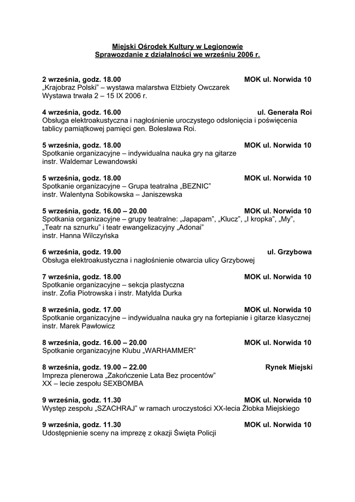 Miejski Ośrodek Kultury w Legionowie Sprawozdanie z działalności we wrześniu 2006 r. 2 września, godz. 18.00 „Krajobraz Polski” – wystawa malarstwa Elżbiety Owczarek Wystawa trwała 2 – 15 IX 2006 r. MOK ul. Norwida 10 4 września, godz. 16.00 ul. Generała Roi Obsługa elektroakustyczna i nagłośnienie uroczystego odsłonięcia i poświęcenia tablicy pamiątkowej pamięci gen. Bolesława Roi. 5 września, godz. 18.00 Spotkanie organizacyjne – indywidualna nauka gry na gitarze instr. Waldemar Lewandowski MOK ul. Norwida 10 5 września, godz. 18.00 Spotkanie organizacyjne – Grupa teatralna „BEZNIC” instr. Walentyna Sobikowska – Janiszewska MOK ul. Norwida 10 5 września, godz. 16.00 – 20.00 MOK ul. Norwida 10 Spotkania organizacyjne – grupy teatralne: „Japapam”, „Klucz”, „I kropka”, „My”, „Teatr na sznurku” i teatr ewangelizacyjny „Adonai” instr. Hanna Wilczyńska 6 września, godz. 19.00 Obsługa elektroakustyczna i nagłośnienie otwarcia ulicy Grzybowej 7 września, godz. 18.00 Spotkanie organizacyjne – sekcja plastyczna instr. Zofia Piotrowska i instr. Matylda Durka ul. Grzybowa MOK ul. Norwida 10 8 września, godz. 17.00 MOK ul. Norwida 10 Spotkanie organizacyjne – indywidualna nauka gry na fortepianie i gitarze klasycznej instr. Marek Pawłowicz 8 września, godz. 16.00 – 20.00 Spotkanie organizacyjne Klubu „WARHAMMER” 8 września, godz. 19.00 – 22.00 Impreza plenerowa „Zakończenie Lata Bez procentów” XX – lecie zespołu SEXBOMBA MOK ul. Norwida 10 Rynek Miejski 9 września, godz. 11.30 MOK ul. Norwida 10 Występ zespołu „SZACHRAJ” w ramach uroczystości XX-lecia Żłobka Miejskiego 9 września, godz. 11.30 Udostępnienie sceny na imprezę z okazji Święta Policji MOK ul. Norwida 10 11 września, godz.18.00 MOK ul. Targowa 65 Spotkanie organizacyjne – indywidualna nauka gry na fortepianie i gitarze klasycznej instr. Marek Pawłowicz 11 września, godz. 16.00 Spotkanie organizacyjne – sekcja plastyczna instr. Barbara Retmaniak MOK ul. Targowa 65 11 września, godz. 18.00 Spotkanie organizacyjne – Teatrzyk „W kratkę” instr. Anna Durka-Kupisiak MOK ul. Targowa 65 12 września, godz. 16.00 Spotkanie organizacyjne – taniec towarzyski Anna Klawender MOK ul. Targowa 65 15 września, godz.17.00 MOK ul. Targowa 65 Spotkanie organizacyjne – indywidualna nauka gry na fortepianie i gitarze klasycznej instr. Marek Pawłowicz 16 września, godz.19.00 Udostępnienie nagłośnienia dla Zbiorów Historycznych Miasta Legionowa 16 września, godz.19.00 Koncert zespołu Dela Core” MOK ul. Norwida 10 18 września, godz.17.00 MOK ul. Norwida10 Spotkanie organizacyjne – indywidualna nauka gry na fortepianie i gitarze klasycznej instr. Marek Pawłowicz 20 września, godz.10.00 Nagrania muzyczne dzieci ze Szkoły Podstawowej nr 7 MOK ul. Norwida 10 22 września, godz.10.30 - 13.00 MOK ul. Norwida 10 Nagłośnienie i obsługa elektroakustyczna Święta Szkoły Podstawowej nr 7 - próba 22 września, godz.18.00 Rynek Miejski Impreza uliczna „Europejski dzień bez samochodu” 22 września, godz.19.00 Inauguracja Klubu Filmowego „Nieme Kino” MOK ul. Norwida 10 23 września, godz.18.00 MOK ul. Norwida 10 Otwarcie wystawy plastycznej Miry Wąchały – grafika, malarstwo, tkanina artystyczna, oprawa muzyczna zespół „ECHO”. 23 września Udostępnienie nagłośnienia dla Miejskiego Ośrodka Sportu i Rekreacji w Legionowie 23 września, godz. 9.00 - 14.00 MOK ul. Norwida 10 Nagłośnienie i obsługa elektroakustyczna Święta Szkoły Podstawowej nr 7 w Legionowie 24 września, godz. 14.00 - 19.00 Parafia p.w. Matki Boskiej Fatimskiej Występ zespołu „Echo”, nagłośnienie i oprawa elektroakustyczna. 27 września, godz.16.00 Spotkanie organizacyjne, nabór do chóru – Janusz Chłus MOK ul. Norwida10 27 września, godz.19.00 ul. Generała Roi Nagłośnienie i obsługa elektroakustyczna spotkania Prezydenta Miasta Legionowo z mieszkańcami. 28 września, godz.16.00 Spotkanie organizacyjne, nabór do chóru – Janusz Chłus MOK ul. Norwida10 28 września, godz.14.00 Osiedle „Kozłówka” Otwarcie placu zabaw na Osiedlu „Kozłówka” - występ zespołu „ECHO”, nagłośnienie i obsługa elektroakustyczna MOK 28 września, godz.17.00 Spotkanie inauguracyjne Klubu Seniora – wspólny grill instr. Walentyna Sobikowska-Janiszewska MOK ul. Targowa 65 29 września, godz.14.00 MOK ul. Norwida 10 Koncert Filharmonii Narodowej w ramach cyklu spotkań z muzyką pt. „Muzyka ludowa”, wystąpiła Kapela „Pies szczeka”. 29 września, godz.18.15 MOK ul. Targowa 65 Otwarcie wystawy plastycznej Patrycji Wojtkowskiej (Pracownia plastyczna MOK) Oprawa muzyczna Ewa Lipchen i Monika Polaczek-Przestrzelska. 30 września, godz.19.00 MOK ul. Norwida 10 Otwarcie wystawy pt. „Ilustracje do Biblii i inne litografie” - Marc Chagall Oprawa muzyczna Małgorzata Irena Duda-Kozera i Zenon Durka