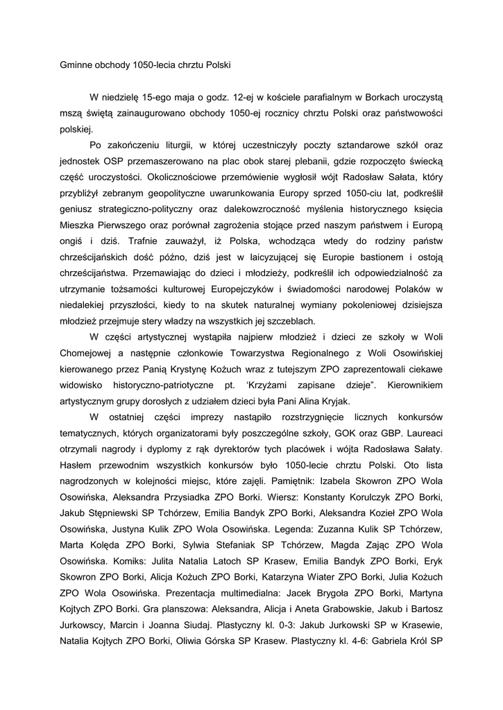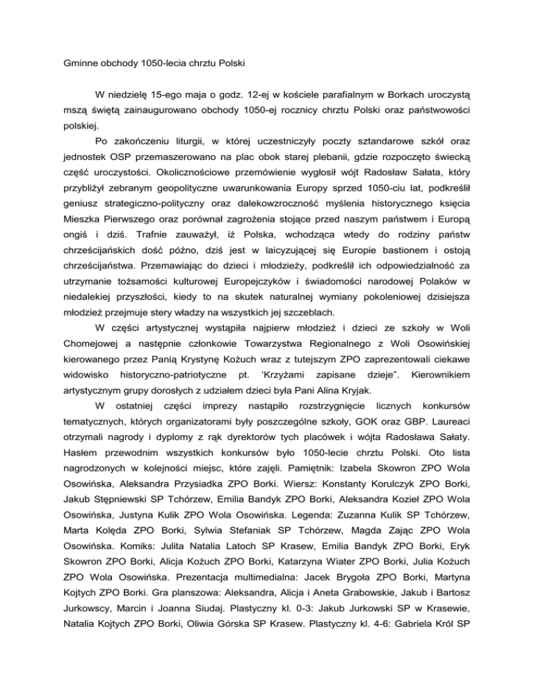 Gminne obchody 1050-lecia chrztu Polski W niedzielę 15-ego maja o godz. 12-ej w kościele parafialnym w Borkach uroczystą mszą świętą zainaugurowano obchody 1050-ej rocznicy chrztu Polski oraz państwowości polskiej. Po zakończeniu liturgii, w której uczestniczyły poczty sztandarowe szkół oraz jednostek OSP przemaszerowano na plac obok starej plebanii, gdzie rozpoczęto świecką część uroczystości. Okolicznościowe przemówienie wygłosił wójt Radosław Sałata, który przybliżył zebranym geopolityczne uwarunkowania Europy sprzed 1050-ciu lat, podkreślił geniusz strategiczno-polityczny oraz dalekowzroczność myślenia historycznego księcia Mieszka Pierwszego oraz porównał zagrożenia stojące przed naszym państwem i Europą ongiś i dziś. Trafnie zauważył, iż Polska, wchodząca wtedy do rodziny państw chrześcijańskich dość późno, dziś jest w laicyzującej się Europie bastionem i ostoją chrześcijaństwa. Przemawiając do dzieci i młodzieży, podkreślił ich odpowiedzialność za utrzymanie tożsamości kulturowej Europejczyków i świadomości narodowej Polaków w niedalekiej przyszłości, kiedy to na skutek naturalnej wymiany pokoleniowej dzisiejsza młodzież przejmuje stery władzy na wszystkich jej szczeblach. W części artystycznej wystąpiła najpierw młodzież i dzieci ze szkoły w Woli Chomejowej a następnie członkowie Towarzystwa Regionalnego z Woli Osowińskiej kierowanego przez Panią Krystynę Kożuch wraz z tutejszym ZPO zaprezentowali ciekawe widowisko historyczno-patriotyczne pt. ‘Krzyżami zapisane dzieje”. Kierownikiem artystycznym grupy dorosłych z udziałem dzieci była Pani Alina Kryjak. W ostatniej części imprezy nastąpiło rozstrzygnięcie licznych konkursów tematycznych, których organizatorami były poszczególne szkoły, GOK oraz GBP. Laureaci otrzymali nagrody i dyplomy z rąk dyrektorów tych placówek i wójta Radosława Sałaty. Hasłem przewodnim wszystkich konkursów było 1050-lecie chrztu Polski. Oto lista nagrodzonych w kolejności miejsc, które zajęli. Pamiętnik: Izabela Skowron ZPO Wola Osowińska, Aleksandra Przysiadka ZPO Borki. Wiersz: Konstanty Korulczyk ZPO Borki, Jakub Stępniewski SP Tchórzew, Emilia Bandyk ZPO Borki, Aleksandra Kozieł ZPO Wola Osowińska, Justyna Kulik ZPO Wola Osowińska. Legenda: Zuzanna Kulik SP Tchórzew, Marta Kolęda ZPO Borki, Sylwia Stefaniak SP Tchórzew, Magda Zając ZPO Wola Osowińska. Komiks: Julita Natalia Latoch SP Krasew, Emilia Bandyk ZPO Borki, Eryk Skowron ZPO Borki, Alicja Kożuch ZPO Borki, Katarzyna Wiater ZPO Borki, Julia Kożuch ZPO Wola Osowińska. Prezentacja multimedialna: Jacek Brygoła ZPO Borki, Martyna Kojtych ZPO Borki. Gra planszowa: Aleksandra, Alicja i Aneta Grabowskie, Jakub i Bartosz Jurkowscy, Marcin i Joanna Siudaj. Plastyczny kl. 0-3: Jakub Jurkowski SP w Krasewie, Natalia Kojtych ZPO Borki, Oliwia Górska SP Krasew. Plastyczny kl. 4-6: Gabriela Król SP Tchórzew, Aleksandra Grabowska SP Wola Chomejowa, Sylwia Stefaniak SP Tchórzew. Plastyczny kl. 1-3 gimnazjum: Patrycja Bieniek ZPO Borki, Monika Trojak ZPO Borki, Wiktoria Filip ZPO Borki. Historyczny: Maciej Skowron ZPO Borki, Sylwia Stefaniak SP Tchórzew, Emilia Bandyk ZPO Borki, Ewelina Sposób SP Krasew. Drużynowy turniej historyczny: Dominika Krasuska, Jan Kożuch, Dominika Gurtat, Alina Kaznadziej, Zuzanna Zając ZPO Wola Osowińska, Martyna Wierzchowska, Paweł Palinowski, Karol Mucharzewski, Kamil Fijałek, Julia Ostrzyżek SP Wola Chomejowa, Aleksandra Szajna, Jakub Jeleń, Marta Sokół, Paweł Dziduch, Bartosz Kolęda ZPO Borki. Gratulujemy zwycięzcom, jak również wszystkim uczestnikom tych licznych konkurencji. Mimo niepomyślnych prognoz, pogoda dopisała a serwowane pod namiotem grochówka i bigos cieszyły się dużym powodzeniem. Tą droga wójt Radosław Sałata współorganizatorom tej pięknej uroczystości. składa gorące podziękowania wszystkim