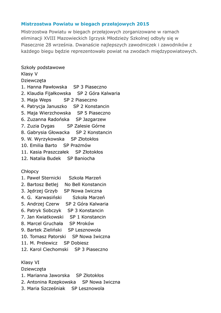 Mistrzostwa Powiatu w biegach przełajowych 2015 Mistrzostwa Powiatu w biegach przełajowych zorganizowane w ramach eliminacji XVIII Mazowieckich Igrzysk Młodzieży Szkolnej odbyły się w Piasecznie 28 września. Dwanaście najlepszych zawodniczek i zawodników z każdego biegu będzie reprezentowało powiat na zwodach międzypowiatowych. Szkoły podstawowe Klasy V Dziewczęta 1. Hanna Pawłowska SP 3 Piaseczno 2. Klaudia Fijałkowska SP 2 Góra Kalwaria 3. Maja Weps SP 2 Piaseczno 4. Patrycja Januszko SP 2 Konstancin 5. Maja Wierzchowska SP 5 Piaseczno 6. Zuzanna Radońska SP Jazgarzew 7. Zuzia Dygas SP Zalesie Górne 8. Gabrysia Głowacka SP 2 Konstancin 9. W. Wyrzykowska SP Złotokłos 10. Emilia Barto SP Prażmów 11. Kasia Praszczałek SP Złotokłos 12. Natalia Budek SP Baniocha Chłopcy 1. Paweł Sternicki Szkoła Marzeń 2. Bartosz Betlej No Bell Konstancin 3. Jędrzej Grzyb SP Nowa Iwiczna 4. G. Karwasiński Szkoła Marzeń 5. Andrzej Czerw SP 2 Góra Kalwaria 6. Patryk Sobczyk SP 3 Konstancin 7. Jan Kwiatkowski SP 1 Konstancin 8. Marcel Gruchała SP Mroków 9. Bartek Zieliński SP Lesznowola 10. Tomasz Patorski SP Nowa Iwiczna 11. M. Prelewicz SP Dobiesz 12. Karol Ciechomski SP 3 Piaseczno Klasy VI Dziewczęta 1. Marianna Jaworska SP Złotokłos 2. Antonina Rzepkowska SP Nowa Iwiczna 3. Maria Szcześniak SP Lesznowola 4. Kamila Jankowska SP Czaplinek 5. Weronika Niziołek SP 3 Piaseczno 6. Gabriela Zawada Szkoła Marzeń 7. Natalia Bednarczyk SP Mroków 8. Natalia Szczygielska SP 2 Konstancin 9. Paulina Szczepanik SP 5 Piaseczno 10. Karolina Kozon SP Tarczyn 11. Helena Goś SP Zalesie Górne 12. Zuzanna Kuś SP 3 Piaseczno Chłopcy 1. Wojciech Senderski SP Zalesie Górne 2. Adrian Fabijański SP Zalesie Górne 3. Mateusz Urbański SP Mysiadło 4. Jakub Soboń SP 5 Piaseczno 5. Adrian Pec SP 5 Konstancin 6. Bartosz Augustyniak SP Mysiadło 7. Adam Chryścina SP 5 Piaseczno 8. Filip Arak SP Zalesie Górne 9. M. Maleszewski SP Zalesie Górne 10. Konrad Wosztyl SP Baniocha 11. Kamil Wolf SP 5 Piaseczno 12. Kacper Kobyliński SP Góra Kalwaria Gimnazja - klasy I Dziewczęta 1. Sobczyk Kamila G1 Piaseczno 2. Patrycja Falkowska Gim. Złotokłos 3. Wiktoria Gołębiewska Gim. Cendrowice 4. Maria Matusik Gim. Góra Kalwaria 5. Zofia Żegnałek G 1 Konstancin 6. Kaja Słupska G 1 Piaseczno 7. Karolina Rak Gim. Magdalenka 8. Klaudia Kanabus G 1 Konstancin 9. Weronika Pichola G 1 Piaseczno 10. Joanna Płocińska G 1 Piaseczno 11. Katarzyna Rosłon Gim. Cendrowice 12. Ola Przychodzeń G 4 Piaseczno Chłopcy 1. Mikołaj Grzegrzółka Gim. Złotokłos 2. Łukasz Grzegrzółka Gim. Złotokłos 3. Dylan Centra G 2 Piaseczno 4. Miłosz Makowski Gim. Cendrowice 5. Filip Pańczak Gim. Mysiadło 6. Filip Pietuszyński Szkoła Marzeń 7. Adam Gosławski G 4 Konstancin 8. Bartosz Toczek Gim. Mroków 9. Marcin Adamek Gim. Cendrowice 10. Kacper Budyta G 2 Piaseczno 11. Kuba Piórkowski G 2 Konstancin 12. K. Sierzputowski G 2 Piaseczno Gimnazja – klasy II Dziewczęta 1. Oliwia Paradowska G 1 Piaseczno 2. Zuzanna Sokół G 1 Konstancin 3. Julia Cibicka G 2 Piaseczno 4. Magda Zabdyr G 1 Piaseczno 5. Magda Roman G 3 Konstancin 6. Zofia Gajda Gim. Chylice 7. Weronika Pachnicka G 1 Piaseczno 8. Karolina Mendel Gim. Pamiątka 9. Lidia Muszyńska Gim. Lesznowola 10. Weronika Kowalik Gim. Zalesie Górne 11. Marta Pruszczyk Gim. Uwieliny 12. Oliwia Krasuska Gim. Zalesie Górne Chłopcy 1. Jakub Staniszewski Gim. Tarczyn 2. Kacper Gnutek Gim. Złotokłos 3. Patrk Leończyk G 2 Piaseczno 4. Adrian Sułek Gim. Lesznowola 5. Konrad Lichowski G 1 Piaseczno 6. Gustaw Żuchowski G 1 Piaseczno 7 .Jakub Dereń G 4 Piaseczno 8. Mateusz Lipiński G 1 Piaseczno 9. Maciej Oprządek Gim. Mroków 10. Joachim Białas Gim. Góra Kalwaria 11. Aleksander Lidak G 4 Piaseczno 12. Bartłomiej Tadzik Gim. Tarczyn Gimnazja – Klasy III Dziewczęta 1. Karolina Rosochacka Gim. Coniew 2. Paulina Rosłon Gim. Cendrowice 3. Natalia Strzelczyk Gim. Zalesie Górne 4. Kasia Połeć Gim. Tarczyn 5. Julia Krzyczkowska Gim. Cendrowice 6. Michalina Pecyna G 1 Konstancin 7. Klaudia Szymańska Gim. Złotokłos 8. Zofia Leszczyńska Gim. Mysiadło 9. Zuzanna Lisik Gim. Nowa Iwiczna 10. Julia Surosz G 1 Piaseczno 11. Iga Szablewska Gim. Lesznowola 12. Anna Bernet G 1 Konstancin Chłopcy 1. Bartosz Kucharski G 4 Piaseczno 2. Piotr Szczepański G 1 Konstancin 3. Mateusz Król G 1 Piaseczno 4. Konrad Szymański G 2 Piaseczno 5. Jan Jakubik No Bell Konstancin 6. Mikołaj Grochowski G 1 Piaseczno 7. Jakub Łukasik Gim. Pamiątka 8. Michał Dziedzic Gim. Jazgarzew 9. Oliwier Potęda Gim. Cendrowice 10. Mikołaj Grysik G 5 Konstancin 11. Bartek Korólczyk G 4 Piaseczno 12. Dawid Gładecki Gim. Baniocha Szkoły ponadgimnazjalne Dziewczęta 1000 metrów Oliwia Malmon LO Piaseczno Gabrysia Kaczmarska LO Piaseczno Adrianna Siatkowska LO Piaseczno Karolina Piech ZS 2 Piaseczno Natalia Jakubiak ZS Konstancin Natalia Dąbrowska ZSZ Góra Kalwaria Agata Ber ZS Konstancin Jagoda Bajashin ZS Konstancin Wiktoria Pawełek ZS Konstancin Zuzanna Kudlak ZS 1 Piaseczno Ola Kucharska ZS 1 Piaseczno Chłopcy 1500 metrów 1. Dominik Krzaczek ZS RCKU Piaseczno 2. Adam Pierściński ZS RCKU Piaseczno 3. Andrzej Gospodarczyk ZSZ Góra Kalwaria 4. Filip Łukaszewski LO Piaseczno 5. Adrian Samoraj ZS 2 Piaseczno 6. Kamil Krawczyk ZSZ Góra Kalwaria 7. Mateusz Kasprzak ZS 2 Piaseczno 8. Patryk Lenarcik ZS Konstancin 9. Dominik Rutelonis ZS Konstancin 10. Tomasz Wrochna ZSZ Góra Kalwaria 11. Bartosz Bartczak ZS Konstancin Dziewczęta 2000 metrów 1. Aleksandra Płocińska LO Piaseczno 2. Angelika Słowińska LO Piaseczno 3. Natalia Szwed LO Piaseczno 4. Karolina Woźniak LO Piaseczno 5. Natalia Siedlecka LO Piaseczno Chłopcy 3000 metrów 1. Damian Tokarski ZS Piaseczno 2. Marek Wąsikowski ZS Piaseczno 3. Mateusz Domagała ZS Piaseczno 4. Witek Wolin ZS Piaseczno 5. Łukasz Zając LO Piaseczno 6. Sebastian Bieńkowski ZSZ Góra Kalwaria 7. Łukasz Gospodarczyk ZSZ Góra Kalwar