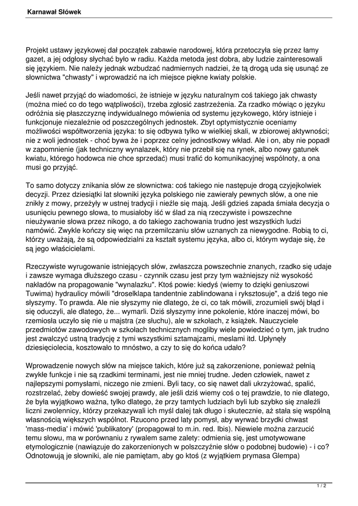 Karnawał Słówek Projekt ustawy językowej dał początek zabawie narodowej, która przetoczyła się przez łamy gazet, a jej odgłosy słychać było w radiu. Każda metoda jest dobra, aby ludzie zainteresowali się językiem. Nie należy jednak wzbudzać nadmiernych nadziei, że tą drogą uda się usunąć ze słownictwa "chwasty" i wprowadzić na ich miejsce piękne kwiaty polskie. Jeśli nawet przyjąć do wiadomości, że istnieje w języku naturalnym coś takiego jak chwasty (można mieć co do tego wątpliwości), trzeba zgłosić zastrzeżenia. Za rzadko mówiąc o języku odróżnia się płaszczyznę indywidualnego mówienia od systemu językowego, który istnieje i funkcjonuje niezależnie od poszczególnych jednostek. Zbyt optymistycznie oceniamy możliwości współtworzenia języka: to się odbywa tylko w wielkiej skali, w zbiorowej aktywności; nie z woli jednostek - choć bywa że i poprzez celny jednostkowy wkład. Ale i on, aby nie popadł w zapomnienie (jak techniczny wynalazek, który nie przebił się na rynek, albo nowy gatunek kwiatu, którego hodowca nie chce sprzedać) musi trafić do komunikacyjnej wspólnoty, a ona musi go przyjąć. To samo dotyczy znikania słów ze słownictwa: coś takiego nie następuje drogą czyjejkolwiek decyzji. Przez dziesiątki lat słowniki języka polskiego nie zawierały pewnych słów, a one nie znikły z mowy, przeżyły w ustnej tradycji i nieźle się mają. Jeśli gdzieś zapada śmiała decyzja o usunięciu pewnego słowa, to musiałoby iść w ślad za nią rzeczywiste i powszechne nieużywanie słowa przez nikogo, a do takiego zachowania trudno jest wszystkich ludzi namówić. Zwykle kończy się więc na przemilczaniu słów uznanych za niewygodne. Robią to ci, którzy uważają, że są odpowiedzialni za kształt systemu języka, albo ci, którym wydaje się, że są jego właścicielami. Rzeczywiste wyrugowanie istniejących słów, zwłaszcza powszechnie znanych, rzadko się udaje i zawsze wymaga dłuższego czasu - czynnik czasu jest przy tym ważniejszy niż wysokość nakładów na propagowanie "wynalazku". Ktoś powie: kiedyś (wiemy to dzięki geniuszowi Tuwima) hydraulicy mówili "droselklapa tandentnie zablindowana i ryksztosuje", a dziś tego nie słyszymy. To prawda. Ale nie słyszymy nie dlatego, że ci, co tak mówili, zrozumieli swój błąd i się oduczyli, ale dlatego, że... wymarli. Dziś słyszymy inne pokolenie, które inaczej mówi, bo rzemiosła uczyło się nie u majstra (ze słuchu), ale w szkołach, z książek. Nauczyciele przedmiotów zawodowych w szkołach technicznych mogliby wiele powiedzieć o tym, jak trudno jest zwalczyć ustną tradycję z tymi wszystkimi sztamajzami, meslami itd. Upłynęły dziesięciolecia, kosztowało to mnóstwo, a czy to się do końca udało? Wprowadzenie nowych słów na miejsce takich, które już są zakorzenione, ponieważ pełnią zwykłe funkcje i nie są rzadkimi terminami, jest nie mniej trudne. Jeden człowiek, nawet z najlepszymi pomysłami, niczego nie zmieni. Byli tacy, co się nawet dali ukrzyżować, spalić, rozstrzelać, żeby dowieść swojej prawdy, ale jeśli dziś wiemy coś o tej prawdzie, to nie dlatego, że była wyjątkowo ważna, tylko dlatego, że przy tamtych ludziach byli lub szybko się znaleźli liczni zwolennicy, którzy przekazywali ich myśl dalej tak długo i skutecznie, aż stała się wspólną własnością większych wspólnot. Rzucono przed laty pomysł, aby wyrwać brzydki chwast 'mass-media' i mówić 'publikatory' (propagował to m.in. red. Ibis). Niewiele można zarzucić temu słowu, ma w porównaniu z rywalem same zalety: odmienia się, jest umotywowane etymologicznie (nawiązuje do zakorzenionych w polszczyźnie słów o podobnej budowie) - i co? Odnotowują je słowniki, ale nie pamiętam, aby go ktoś (z wyjątkiem prymasa Glempa) 1/2 Karnawał Słówek naprawdę go używał. Dlaczego ludzie używają obcych słów w obcym brzmieniu? - Bo one już funkcjonują! A stało się tak, gdyż do czegoś to było potrzebne; słowa "zagraniczne" towarzyszą importowanym towarom, z różnych (słusznych czy niesłusznych) powodów wydają się "lepsze", znane słowa się starzeją, a w pewnych dziedzinach życia (nie tylko na rynku towarowym) nowość ma wartość wymierną w różnych walutach (nie tylko pieniądzu, także jakiejś atrakcyjności). Nowość, a więc i nowa nazwa, która zwykle zresztą jest potrzebna,bo i stare rzeczy pojawiają się w nowych odmianach, co wymaga odróżnienia. Tak więc i tu potwierdza się zasada, że ludzie zawsze mówią, aby coś zmienić wokół siebie, żeby załatwiać swoje sprawy. Nowe słowa mają szansę zadomowienia się, kiedy wchodzą z nowymi rzeczami; to tam powinna się skupić energia "prawodawców" języka. Potrzebne są językoznawcze wskazówki, aby uniknąć zabawnych nieporozumień jak osławiony "zwis męski" czy "podgardle dziecięce" (zresztą do ich wyeliminowania nie trzeba aż wielkiej kompetencji językoznawczej, starczyłaby odrobina trzeźwości). Dlatego nie twierdzę, że opinia językoznawcza musi mieć od razu kształt normatywny (aż się boję to napisać, żeby ktoś nie zechciał tego zrealizować: PN - polska norma na nazwę, tak jak na inne cechy produktu); przy czym nie chodzi tu o zastrzeżenie znaku towarowego, ale o spełnienie pewnych warunków o charakterze językowym? Normy językowe nie powinny stawać się normami prawnymi, odpowiedniejszy jest ich obecny status - norm pragmatycznych: jeśli się do nich nie stosujesz, nie porozumiesz się właściwie z resztą danej wspólnoty. Wolno ci to robić, ale na własny koszt. Andrzej Dąbrówka (c) Podkowiański Magazyn Kulturalny http://free.art.pl/podkowa.magazyn/ 2/2