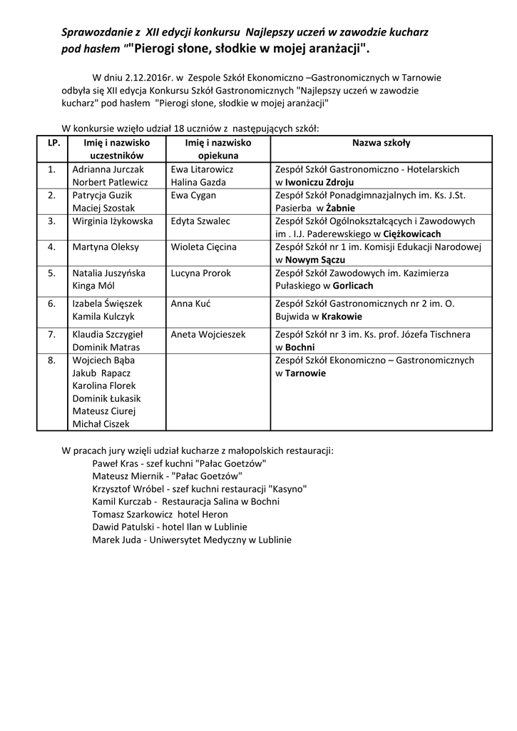 Sprawozdanie z XII edycji konkursu Najlepszy uczeń w zawodzie kucharz pod hasłem ""Pierogi słone, słodkie w mojej aranżacji". W dniu 2.12.2016r. w Zespole Szkół Ekonomiczno –Gastronomicznych w Tarnowie odbyła się XII edycja Konkursu Szkół Gastronomicznych "Najlepszy uczeń w zawodzie kucharz" pod hasłem "Pierogi słone, słodkie w mojej aranżacji" W konkursie wzięło udział 18 uczniów z następujących szkół: LP. Imię i nazwisko Imię i nazwisko Nazwa szkoły uczestników opiekuna 1. Adrianna Jurczak Ewa Litarowicz Zespół Szkół Gastronomiczno - Hotelarskich Norbert Patlewicz Halina Gazda w Iwoniczu Zdroju 2. Patrycja Guzik Ewa Cygan Zespół Szkół Ponadgimnazjalnych im. Ks. J.St. Maciej Szostak Pasierba w Żabnie 3. Wirginia Iżykowska Edyta Szwalec Zespół Szkół Ogólnokształcących i Zawodowych im . I.J. Paderewskiego w Ciężkowicach 4. Martyna Oleksy Wioleta Cięcina Zespół Szkół nr 1 im. Komisji Edukacji Narodowej w Nowym Sączu 5. Natalia Juszyńska Lucyna Prorok Zespół Szkół Zawodowych im. Kazimierza Kinga Mól Pułaskiego w Gorlicach 6. Izabela Święszek Kamila Kulczyk Anna Kuć Zespół Szkół Gastronomicznych nr 2 im. O. Bujwida w Krakowie 7. Klaudia Szczygieł Dominik Matras Wojciech Bąba Jakub Rapacz Karolina Florek Dominik Łukasik Mateusz Ciurej Michał Ciszek Aneta Wojcieszek Zespół Szkół nr 3 im. Ks. prof. Józefa Tischnera w Bochni Zespół Szkół Ekonomiczno – Gastronomicznych w Tarnowie 8. W pracach jury wzięli udział kucharze z małopolskich restauracji: Paweł Kras - szef kuchni "Pałac Goetzów" Mateusz Miernik - "Pałac Goetzów" Krzysztof Wróbel - szef kuchni restauracji "Kasyno" Kamil Kurczab - Restauracja Salina w Bochni Tomasz Szarkowicz hotel Heron Dawid Patulski - hotel Ilan w Lublinie Marek Juda - Uniwersytet Medyczny w Lublinie Konkurs Najlepszy uczeń w zawodzie kucharz pod hasłem ""Pierogi słone, słodkie w mojej aranżacji"2016 – Zestawienie punktowe Lp. Imię i nazwisko uczestnika Szkoła Liczba punktów Zespół Szkół Ogólnokształcących i Zawodowych im . I.J. Paderewskiego w Ciężkowicach Zespół Szkół Gastronomiczno - Hotelarskich w Iwoniczu Zdroju Zespół Szkół Ekonomiczno – Gastronomicznych w Tarnowie Zespół Szkół nr 1 im. Komisji Edukacji Narodowej w Nowym Sączu 220 I 200 II 184 III 154 IV Zespół Szkół Zawodowych im. Kazimierza Pułaskiego w Gorlicach Zespół Szkół Ekonomiczno – Gastronomicznych w Tarnowie 153 V 148 VI 7. Izabela Święszek Zespół Szkół Gastronomicznych nr 2 im. O. Bujwida w Krakowie 143 8. Karolina Florek Zespół Szkół Ekonomiczno – Gastronomicznych w Tarnowie 142 9. Norbert Patlewicz Zespół Szkół Gastronomiczno - Hotelarskich w Iwoniczu Zdroju Zespół Szkół Ponadgimnazjalnych im. Ks. J.St. Pasierba w Żabnie Zespół Szkół nr 3 im. Ks. prof. Józefa Tischnera w Bochni Zespół Szkół nr 3 im. Ks. prof. Józefa Tischnera w Bochni Zespół Szkół Zawodowych im. Kazimierza Pułaskiego w Gorlicach Zespół Szkół Ekonomiczno – Gastronomicznych w Tarnowie Zespół Szkół Ponadgimnazjalnych im. Ks. J.St. Pasierba w Żabnie Zespół Szkół Gastronomicznych nr 2 im. O. Bujwida w Krakowie Zespół Szkół Ekonomiczno – Gastronomicznych w Tarnowie Zespół Szkół Ekonomiczno – Gastronomicznych w Tarnowie 140 IX 138 X 135 XI 135 XII 134 XIII 134 XIV 133 XV 128 XVI 122 XVII 72 XVIII 1. Wirginia Iżykowska 2. Adrianna Jurczak 3. Dominik Łukasik 4. Martyna Oleksy 5. Natalia Juszyńska 6. Michał Ciszek 10. Patrycja Guzik 11. Klaudia Szczygieł 12. Dominik Matras 13. Kinga Mól 14. Mateusz Ciurej 15. Maciej Szostak 16. Kamila Kulczyk 17. Wojciech Bąba 18. Jakub Rapacz miejsce wyróżnienie wyróżnienie VII wyróżnienie VIII wyróżnienie Podsumowaniem konkursu było spotkanie jurorów i uczestników w trakcie którego Pan Paweł Kras uczestnikom kilka cennych uwag. Każdy konkurs jest kolejnym etapem nauki w drodze do osiągnięcia sukcesu zawodowego, każdy uczestnik to wygrany, gdyż ma możliwość zdobywania kolejnych arkan w zawodzie kucharz. Rady udzielane młodym adeptom sztuki kulinarnej są bardzo cenne a umiejętność ich wykorzystania w dalszej nauce przyniesie pozytywne efekty. Sprawozdanie sporządziła: Elżbieta Teper i Agnieszka Jarzwiec