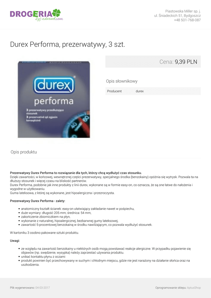 Piastowska Miller sp. j. ul. Śniadeckich 51, Bydgoszcz +48 501-768-087 Durex Performa, prezerwatywy, 3 szt. Cena: 9,39 PLN Opis słownikowy Producent durex Opis produktu Prezerwatywy Durex Performa to rozwiązanie dla tych, którzy chcą wydłużyć czas stosunku. Dzięki zawartości, w końcowej, wewnętrznej części prezerwatywy, specjalnego środka (benzokainy) opóźnia się wytrysk. Pozwala ta na dłuższy stosunek i więcej czasu na bliskość partnerów. Durex Performa, podobnie jak inne produkty z linii durex, wykonane są w formie easy-on, co oznacza, że są one łatwe do nałożenia i wygodne w użytkowaniu. Guma lateksowa, z której są wykonane, jest hipoalergiczna i przezroczysta. Prezerwatywy Durex Performa - zalety: anatomiczny kształt ścianek: easy-on ułatwiający zakładanie nawet w pośpiechu, duże wymiary: długość 205 mm; średnica: 54 mm, zakończenie zbiorniczkiem na płyn, wykonanie z naturalnej, hipoalergicznej, bezbarwnej gumy lateksowej, zawartość 5-procentowej benzokainą w środku nawilżającym, co pozwala wydłużyć stosunek. W kartoniku 3 osobno pakowane sztuki produktu. Uwagi: ze względu na zawartość benzokainy u niektórych osób mogą powstawać reakcje alergiczne. W przypadku pojawienie się objawów (np. swędzenie, wysypka) należy zaprzestać używania produktu. unikać kontaktu płynu z oczami produkt powinien być przechowywany w suchym i chłodnym miejscu, gdzie nie jest narażony na działanie słońca oraz na uszkodzenia. Plik wygenerowano: 04-03-2017 Oprogramowanie sklepu: AptusShop Piastowska Miller sp. j. ul. Śniadeckich 51, Bydgoszcz +48 501-768-087 Plik wygenerowano: 04-03-2017 Powered by TCPDF (www.tcpdf.org) Oprogramowanie sklepu: AptusShop