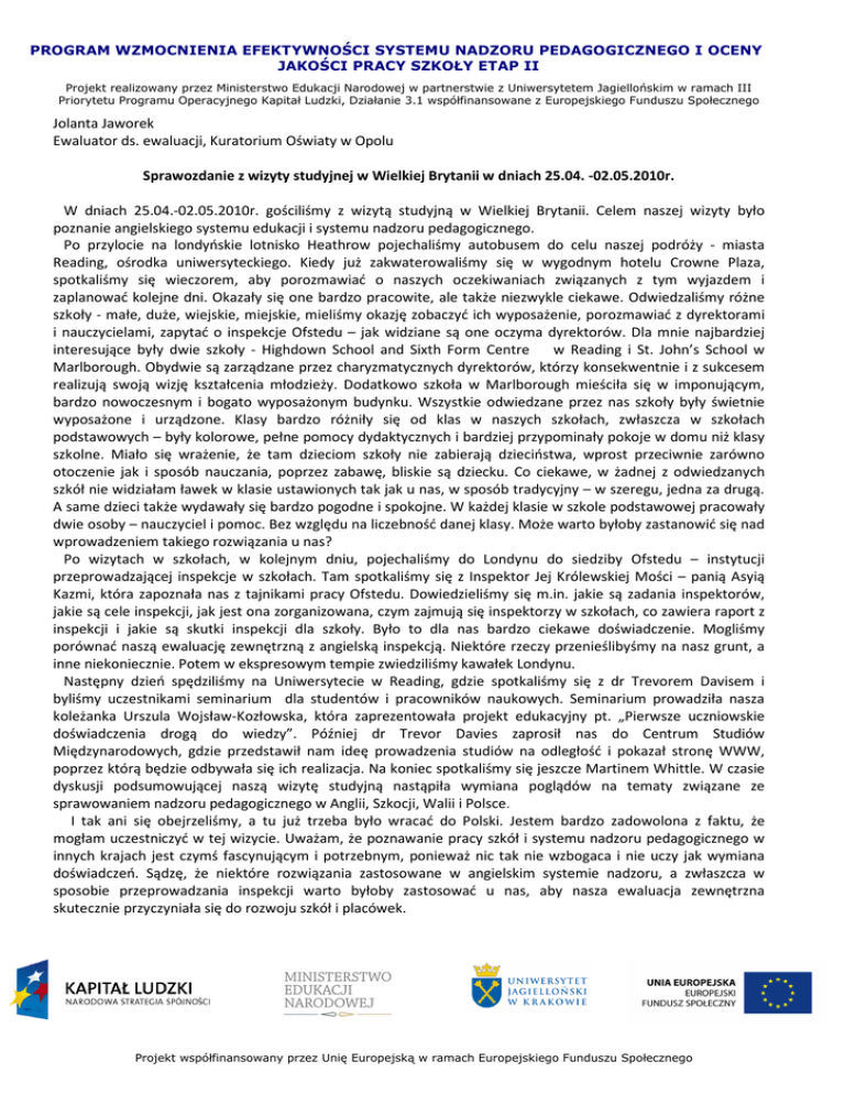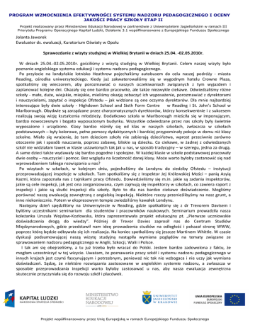 PROGRAM WZMOCNIENIA EFEKTYWNOŚCI SYSTEMU NADZORU PEDAGOGICZNEGO I OCENY JAKOŚCI PRACY SZKOŁY ETAP II Projekt realizowany przez Ministerstwo Edukacji Narodowej w partnerstwie z Uniwersytetem Jagiellońskim w ramach III Priorytetu Programu Operacyjnego Kapitał Ludzki, Działanie 3.1 współfinansowane z Europejskiego Funduszu Społecznego Jolanta Jaworek Ewaluator ds. ewaluacji, Kuratorium Oświaty w Opolu Sprawozdanie z wizyty studyjnej w Wielkiej Brytanii w dniach 25.04. -02.05.2010r. W dniach 25.04.-02.05.2010r. gościliśmy z wizytą studyjną w Wielkiej Brytanii. Celem naszej wizyty było poznanie angielskiego systemu edukacji i systemu nadzoru pedagogicznego. Po przylocie na londyńskie lotnisko Heathrow pojechaliśmy autobusem do celu naszej podróży - miasta Reading, ośrodka uniwersyteckiego. Kiedy już zakwaterowaliśmy się w wygodnym hotelu Crowne Plaza, spotkaliśmy się wieczorem, aby porozmawiać o naszych oczekiwaniach związanych z tym wyjazdem i zaplanować kolejne dni. Okazały się one bardzo pracowite, ale także niezwykle ciekawe. Odwiedzaliśmy różne szkoły - małe, duże, wiejskie, miejskie, mieliśmy okazję zobaczyć ich wyposażenie, porozmawiać z dyrektorami i nauczycielami, zapytać o inspekcje Ofstedu – jak widziane są one oczyma dyrektorów. Dla mnie najbardziej interesujące były dwie szkoły - Highdown School and Sixth Form Centre w Reading i St. John’s School w Marlborough. Obydwie są zarządzane przez charyzmatycznych dyrektorów, którzy konsekwentnie i z sukcesem realizują swoją wizję kształcenia młodzieży. Dodatkowo szkoła w Marlborough mieściła się w imponującym, bardzo nowoczesnym i bogato wyposażonym budynku. Wszystkie odwiedzane przez nas szkoły były świetnie wyposażone i urządzone. Klasy bardzo różniły się od klas w naszych szkołach, zwłaszcza w szkołach podstawowych – były kolorowe, pełne pomocy dydaktycznych i bardziej przypominały pokoje w domu niż klasy szkolne. Miało się wrażenie, że tam dzieciom szkoły nie zabierają dzieciństwa, wprost przeciwnie zarówno otoczenie jak i sposób nauczania, poprzez zabawę, bliskie są dziecku. Co ciekawe, w żadnej z odwiedzanych szkół nie widziałam ławek w klasie ustawionych tak jak u nas, w sposób tradycyjny – w szeregu, jedna za drugą. A same dzieci także wydawały się bardzo pogodne i spokojne. W każdej klasie w szkole podstawowej pracowały dwie osoby – nauczyciel i pomoc. Bez względu na liczebność danej klasy. Może warto byłoby zastanowić się nad wprowadzeniem takiego rozwiązania u nas? Po wizytach w szkołach, w kolejnym dniu, pojechaliśmy do Londynu do siedziby Ofstedu – instytucji przeprowadzającej inspekcje w szkołach. Tam spotkaliśmy się z Inspektor Jej Królewskiej Mości – panią Asyią Kazmi, która zapoznała nas z tajnikami pracy Ofstedu. Dowiedzieliśmy się m.in. jakie są zadania inspektorów, jakie są cele inspekcji, jak jest ona zorganizowana, czym zajmują się inspektorzy w szkołach, co zawiera raport z inspekcji i jakie są skutki inspekcji dla szkoły. Było to dla nas bardzo ciekawe doświadczenie. Mogliśmy porównać naszą ewaluację zewnętrzną z angielską inspekcją. Niektóre rzeczy przenieślibyśmy na nasz grunt, a inne niekoniecznie. Potem w ekspresowym tempie zwiedziliśmy kawałek Londynu. Następny dzień spędziliśmy na Uniwersytecie w Reading, gdzie spotkaliśmy się z dr Trevorem Davisem i byliśmy uczestnikami seminarium dla studentów i pracowników naukowych. Seminarium prowadziła nasza koleżanka Urszula Wojsław-Kozłowska, która zaprezentowała projekt edukacyjny pt. „Pierwsze uczniowskie doświadczenia drogą do wiedzy”. Później dr Trevor Davies zaprosił nas do Centrum Studiów Międzynarodowych, gdzie przedstawił nam ideę prowadzenia studiów na odległość i pokazał stronę WWW, poprzez którą będzie odbywała się ich realizacja. Na koniec spotkaliśmy się jeszcze Martinem Whittle. W czasie dyskusji podsumowującej naszą wizytę studyjną nastąpiła wymiana poglądów na tematy związane ze sprawowaniem nadzoru pedagogicznego w Anglii, Szkocji, Walii i Polsce. I tak ani się obejrzeliśmy, a tu już trzeba było wracać do Polski. Jestem bardzo zadowolona z faktu, że mogłam uczestniczyć w tej wizycie. Uważam, że poznawanie pracy szkół i systemu nadzoru pedagogicznego w innych krajach jest czymś fascynującym i potrzebnym, ponieważ nic tak nie wzbogaca i nie uczy jak wymiana doświadczeń. Sądzę, że niektóre rozwiązania zastosowane w angielskim systemie nadzoru, a zwłaszcza w sposobie przeprowadzania inspekcji warto byłoby zastosować u nas, aby nasza ewaluacja zewnętrzna skutecznie przyczyniała się do rozwoju szkół i placówek. Projekt współfinansowany przez Unię Europejską w ramach Europejskiego Funduszu Społecznego