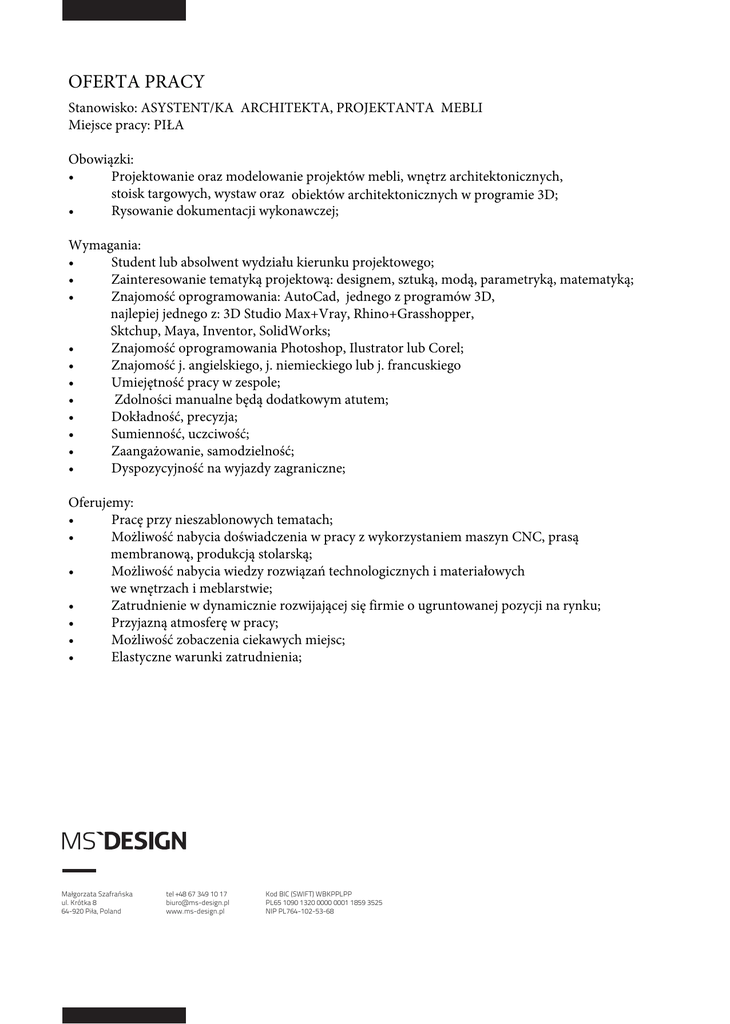 OFERTA PRACY Stanowisko: ASYSTENT/KA ARCHITEKTA, PROJEKTANTA MEBLI Miejsce pracy: PIŁA Obowiązki: • Projektowanie oraz modelowanie projektów mebli, wnętrz architektonicznych, stoisk targowych, wystaw oraz obiektów architektonicznych w programie 3D; • Rysowanie dokumentacji wykonawczej; Wymagania: • Student lub absolwent wydziału kierunku projektowego; • Zainteresowanie tematyką projektową: designem, sztuką, modą, parametryką, matematyką; • Znajomość oprogramowania: AutoCad, jednego z programów 3D, najlepiej jednego z: 3D Studio Max+Vray, Rhino+Grasshopper, Sktchup, Maya, Inventor, SolidWorks; • Znajomość oprogramowania Photoshop, Ilustrator lub Corel; • Znajomość j. angielskiego, j. niemieckiego lub j. francuskiego • Umiejętność pracy w zespole; • Zdolności manualne będą dodatkowym atutem; • Dokładność, precyzja; • Sumienność, uczciwość; • Zaangażowanie, samodzielność; • Dyspozycyjność na wyjazdy zagraniczne; Oferujemy: • Pracę przy nieszablonowych tematach; • Możliwość nabycia doświadczenia w pracy z wykorzystaniem maszyn CNC, prasą membranową, produkcją stolarską; • Możliwość nabycia wiedzy rozwiązań technologicznych i materiałowych we wnętrzach i meblarstwie; • Zatrudnienie w dynamicznie rozwijającej się firmie o ugruntowanej pozycji na rynku; • Przyjazną atmosferę w pracy; • Możliwość zobaczenia ciekawych miejsc; • Elastyczne warunki zatrudnienia; Małgorzata Szafrańska ul. Krótka 8 64-920 Piła, Poland tel +48 67 349 10 17 [email protected] www.ms-design.pl Kod BIC (SWIFT) WBKPPLPP PL65 1090 1320 0000 0001 1859 3525 NIP PL764-102-53-68