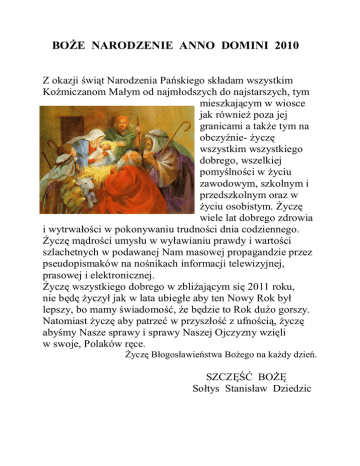 BOŻE NARODZENIE ANNO DOMINI 2010 Z okazji świąt Narodzenia Pańskiego składam wszystkim Koźmiczanom Małym od najmłodszych do najstarszych, tym mieszkającym w wiosce jak również poza jej granicami a także tym na obczyźnie- życzę wszystkim wszystkiego dobrego, wszelkiej pomyślności w życiu zawodowym, szkolnym i przedszkolnym oraz w życiu osobistym. Życzę wiele lat dobrego zdrowia i wytrwałości w pokonywaniu trudności dnia codziennego. Życzę mądrości umysłu w wyławianiu prawdy i wartości szlachetnych w podawanej Nam masowej propagandzie przez pseudopismaków na nośnikach informacji telewizyjnej, prasowej i elektronicznej. Życzę wszystkiego dobrego w zbliżającym się 2011 roku, nie będę życzył jak w lata ubiegłe aby ten Nowy Rok był lepszy, bo mamy świadomość, że będzie to Rok dużo gorszy. Natomiast życzę aby patrzeć w przyszłość z ufnością, życzę abyśmy Nasze sprawy i sprawy Naszej Ojczyzny wzięli w swoje, Polaków ręce. Życzę Błogosławieństwa Bożego na każdy dzień. SZCZĘŚĆ BOŻĘ Sołtys Stanisław Dziedzic