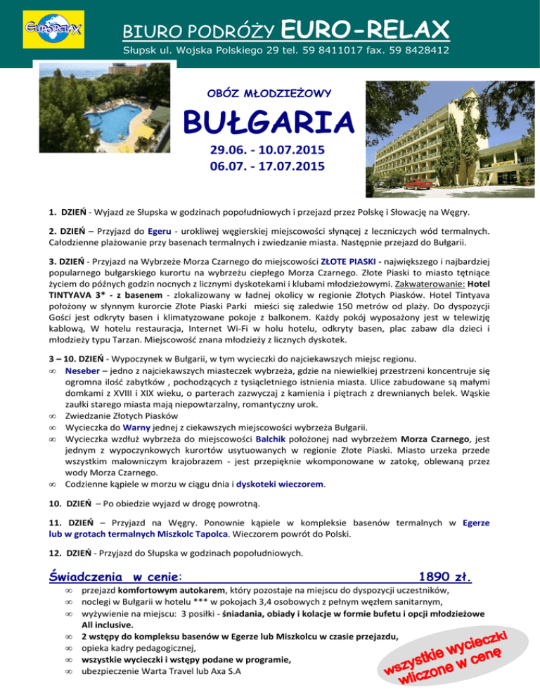 BIURO PODRÓŻY EURO-RELAX Słupsk ul. Wojska Polskiego 29 tel. 59 8411017 fax. 59 8428412 OBÓZ MŁODZIEŻOWY BUŁGARIA 29.06. - 10.07.2015 06.07. - 17.07.2015 1. DZIEŃ - Wyjazd ze Słupska w godzinach popołudniowych i przejazd przez Polskę i Słowację na Węgry. 2. DZIEŃ – Przyjazd do Egeru - urokliwej węgierskiej miejscowości słynącej z leczniczych wód termalnych. Całodzienne plażowanie przy basenach termalnych i zwiedzanie miasta. Następnie przejazd do Bułgarii. 3. DZIEŃ - Przyjazd na Wybrzeże Morza Czarnego do miejscowości ZŁOTE PIASKI - największego i najbardziej popularnego bułgarskiego kurortu na wybrzeżu ciepłego Morza Czarnego. Złote Piaski to miasto tętniące życiem do późnych godzin nocnych z licznymi dyskotekami i klubami młodzieżowymi. Zakwaterowanie: Hotel TINTYAVA 3* - z basenem - zlokalizowany w ładnej okolicy w regionie Złotych Piasków. Hotel Tintyava położony w słynnym kurorcie Złote Piaski Parki mieści się zaledwie 150 metrów od plaży. Do dyspozycji Gości jest odkryty basen i klimatyzowane pokoje z balkonem. Każdy pokój wyposażony jest w telewizję kablową, W hotelu restauracja, Internet Wi-Fi w holu hotelu, odkryty basen, plac zabaw dla dzieci i młodzieży typu Tarzan. Miejscowość znana młodzieży z licznych dyskotek. 3 – 10. DZIEŃ - Wypoczynek w Bułgarii, w tym wycieczki do najciekawszych miejsc regionu. • Neseber – jedno z najciekawszych miasteczek wybrzeża, gdzie na niewielkiej przestrzeni koncentruje się ogromna ilość zabytków , pochodzących z tysiącletniego istnienia miasta. Ulice zabudowane są małymi domkami z XVIII i XIX wieku, o parterach zazwyczaj z kamienia i piętrach z drewnianych belek. Wąskie zaułki starego miasta mają niepowtarzalny, romantyczny urok. • Zwiedzanie Złotych Piasków • Wycieczka do Warny jednej z ciekawszych miejscowości wybrzeża Bułgarii. • Wycieczka wzdłuż wybrzeża do miejscowości Balchik położonej nad wybrzeżem Morza Czarnego, jest jednym z wypoczynkowych kurortów usytuowanych w regionie Złote Piaski. Miasto urzeka przede wszystkim malowniczym krajobrazem - jest przepięknie wkomponowane w zatokę, oblewaną przez wody Morza Czarnego. • Codzienne kąpiele w morzu w ciągu dnia i dyskoteki wieczorem. 10. DZIEŃ – Po obiedzie wyjazd w drogę powrotną. 11. DZIEŃ – Przyjazd na Węgry. Ponownie kąpiele w kompleksie basenów termalnych w Egerze lub w grotach termalnych Miszkolc Tapolca. Wieczorem powrót do Polski. 12. DZIEŃ - Przyjazd do Słupska w godzinach popołudniowych. Świadczenia w cenie: • • • • • • • 1890 zł. przejazd komfortowym autokarem, który pozostaje na miejscu do dyspozycji uczestników, noclegi w Bułgarii w hotelu *** w pokojach 3,4 osobowych z pełnym węzłem sanitarnym, wyżywienie na miejscu: 3 posiłki - śniadania, obiady i kolacje w formie bufetu i opcji młodzieżowe All inclusive. 2 wstępy do kompleksu basenów w Egerze lub Miszkolcu w czasie przejazdu, opieka kadry pedagogicznej, wszystkie wycieczki i wstępy podane w programie, ubezpieczenie Warta Travel lub Axa S.A • podatek Vat, Serdecznie zapraszamy Uwaga cena nie obejmuje dwóch ewentualnych dodatkowych obiadów tranzytowych w Egerze w kwocie po 5 euro/os Trasa przejazdu: Słupsk Plac Zwycięstwa godz. - 15.00 Koszalin Dw. PKP - 16.00 Szczecin parking przy ul Sambora - 18.45 Gorzów Wlkp. stacja PKN Orlen ul. Mysliborska - 20.15 Zielona Góra parking przy Palmiarni 21.45, Legnica Dw. PKP - 23.30 Wrocław /Bielany Wrocławskie/parking przy PKN Orlen przy zjeździe z Autostrady, naprzeciwko Macro - 00.30, Opole stacja i restauracja Lotos przy autostradzie zjazd 241 - 1.45, Katowice Dw. PKP - 03.15 Zgodnie z Ustawą o Usługach turystycznych BPiT Euro-Relax posiada zezwolenie na działalność w zakresie organizacji imprez turystycznych - wpis do rejestru nr 024 oraz gwarancję ubezpieczeniową na rzecz klientów www.eurorelax.pl email:[email protected]