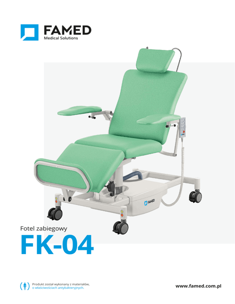 Fotel zabiegowy FK-04 Produkt został wykonany z materiałów, o właściwościach antybakteryjnych. www.famed.com.pl Fotel zabiegowy FK-04 podgłówek segment oparcia pleców Przeznaczenie Fotel służy do podtrzymywania pacjenta podczas dializy lub podawania cytostatyków. Może być także wykorzystany w stacjach krwiodawstwa. podpórka ręki segment podudzia pilot oparcie stóp Budowa standardowa • Fotel posiada regulację wysokości siedziska, nachylenia oparcia pleców i segmentu podudzia oraz funkcję szybkiego Trendelenburga, które są realizowane przez siłowniki elektromechaniczne sterowane z łatwo dostępnego pilota przewodowego mocowanego na jednym z podrączków. • Regulacja podrączków, podgłówka i oparcia stóp dokonywana jest ręcznie. • Fotel wyposażony jest w koła z indywidualną blokadą. koła z indywidualną blokadą Standardowe funkcje i rozwiązania Oparcie stóp regulowane ręcznie Podrączki odchylane ręcznie w bok Podrączki składane wraz z segmentem oparcia pleców Podgłówek regulowany ręcznie Pilot przewodowy Dane techniczne Całkowita szerokość fotela 890 mm Całkowita długość fotela 2170 mm Przesuw oparcia stóp 160 mm Regulacja wysokości 550 do 750 mm Kąt uniesienia oparcia pleców 0° do +75° Kąt opuszczenia segmentu podudziowego 0° do -45° Pozycja Trendelenburga 12° Maksymalne dopuszczalne obciążenie 200 kg Zasilanie 230/127/110/100 V ~, 50/60 Hz Klasa ochrony przed porażeniem elektrycznym II Typ części aplikacyjnej B Stopień ochrony przed wpływem środowiska IP-X4 Famed Żywiec Sp. z o.o. ul. Fabryczna 1 34-300 Żywiec, Polska Centrala: tel.: +48 33 866 62 00 fax: +48 33 475 58 90 Dział Handlowy: tel.: +48 33 866 63 08 tel.: +48 33 866 63 10 tel.: +48 33 866 63 12 tel.: +48 33 866 63 17 fax: +48 33 861 30 79 [email protected] www.famed.com.pl Funkcje fotela uzyskiwane za pomocą pilota 550 do 750 mm 0° do -45° 0° do +75° 12° Funkcje fotela uzyskiwane manualnie 160 mm UNEP IE CLE A RODUCTIO RP N NE EWORK AM FR Produkt spełnia wymogi Europejskiej Dyrektywy MDD 93/42/EEC dotyczącej wyrobów medycznych oraz Ustawy o wyrobach medycznych Zastrzega się możliwość modyfikacji w wyniku postępu technicznego A C ZY J ST SZA P ODUKC R