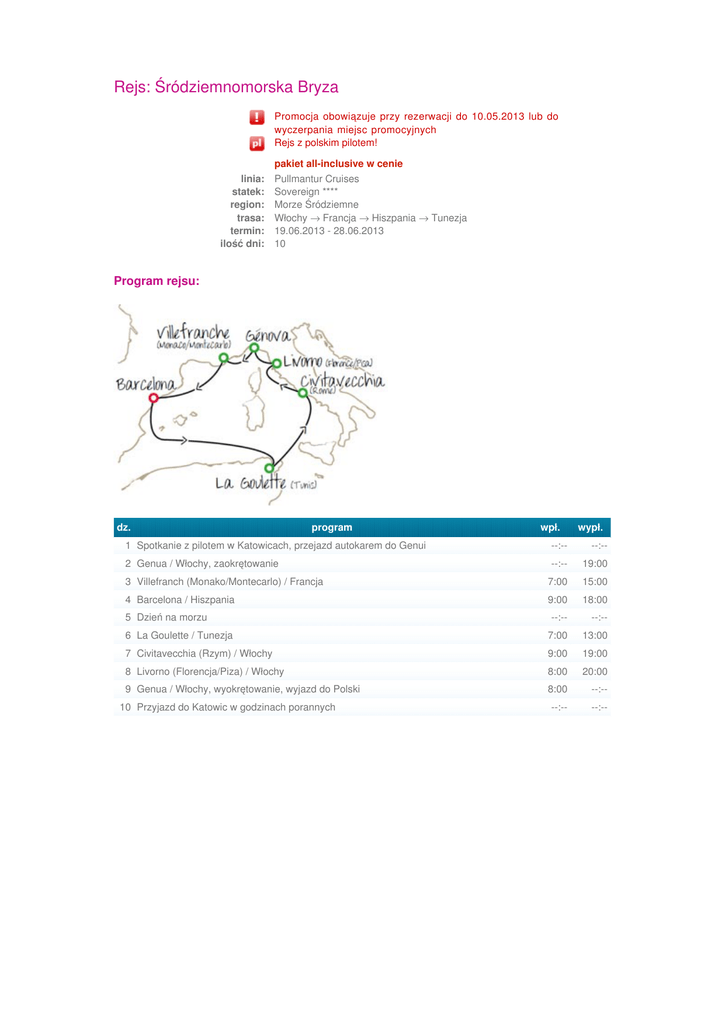 Rejs: Śródziemnomorska Bryza Promocja obowiązuje przy rezerwacji do 10.05.2013 lub do wyczerpania miejsc promocyjnych Rejs z polskim pilotem! linia: statek: region: trasa: termin: ilość dni: pakiet all-inclusive w cenie Pullmantur Cruises Sovereign **** Morze Śródziemne Włochy → Francja → Hiszpania → Tunezja 19.06.2013 - 28.06.2013 10 Program rejsu: dz. program wpł. wypł. 1 Spotkanie z pilotem w Katowicach, przejazd autokarem do Genui --:-- --:-- 2 Genua / Włochy, zaokrętowanie --:-- 19:00 3 Villefranch (Monako/Montecarlo) / Francja 7:00 15:00 4 Barcelona / Hiszpania 9:00 18:00 --:-- --:-- 6 La Goulette / Tunezja 7:00 13:00 7 Civitavecchia (Rzym) / Włochy 9:00 19:00 8 Livorno (Florencja/Piza) / Włochy 8:00 20:00 9 Genua / Włochy, wyokrętowanie, wyjazd do Polski 8:00 --:-- --:-- --:-- 5 Dzień na morzu 10 Przyjazd do Katowic w godzinach porannych 19 czerwca 2013 (środa) - 28 czerwca 2013 (piątek) kategoria* cena katalogowa cena promocyjna kabina wewnętrzna brak kabina zewnętrzna z oknem 699 opłaty portowe 199 przejazd autokarem (opcjonalnie) Informacje dodatkowe: W CENIE * Ceny za osobę w EUR w kabinie dwuosobowej cena obejmuje: rejs statkiem SOVEREIGN **** (Pullmantur Cruises) - zakwaterowanie w kabinie wybranej kategorii (7 noclegów); serwis bagażowy i kabinowy; wyżywienie - 3 główne posiłki, przekąski między posiłkami, all inclusive - napoje alkoholowe i bezalkoholowe; korzystanie z basenu i innych urządzeń sportowo rekreacyjnych; udział we wszystkich imprezach organizowanych na statku, ubezpieczenie KL i NW, opiekę polskiego pilota, przejazd autokarem na trasie Katowice-Genua-Katowice. cena nie obejmuje: opłat portowych (199€/os.); wycieczek fakultatywnych w trakcie rejsu; korzystania z punktów usługowych na statku (pralnia, fotograf, salon piękności i odnowy biologicznej, internet); napiwków obowiązkowych dla obsługi statku (ok. 72€/os./rejs). Uwaga: dostępne kabiny tylko 2 os.