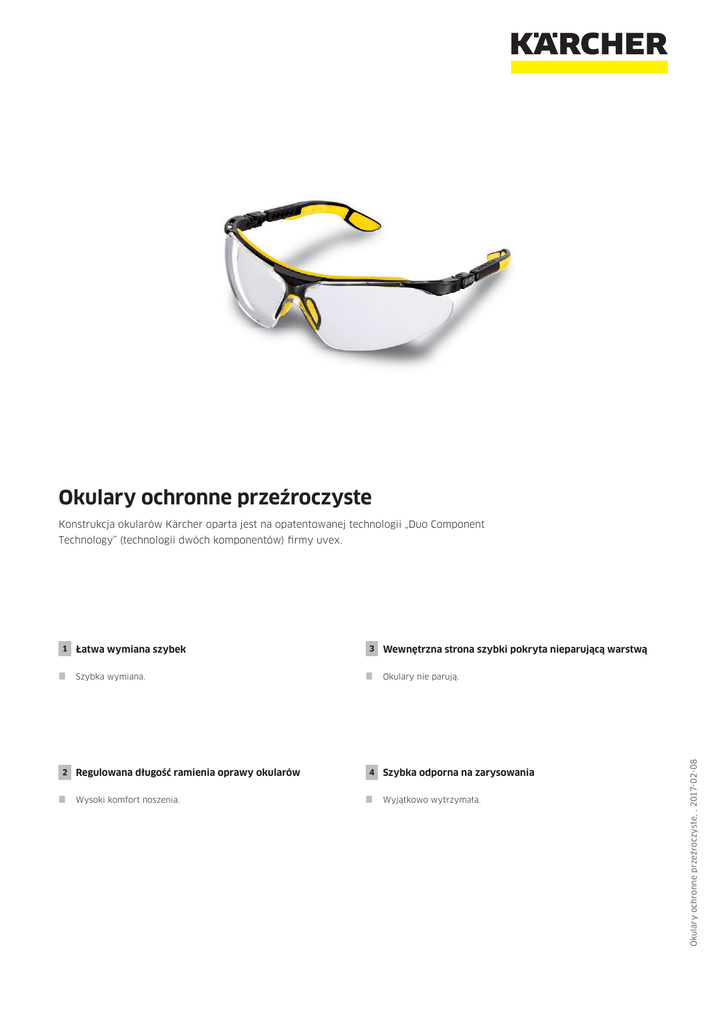 Okulary ochronne przeźroczyste Konstrukcja okularów Kärcher oparta jest na opatentowanej technologii „Duo Component 1 Łatwa wymiana szybek 3 Wewnętrzna strona szybki pokryta nieparującą warstwą Szybka wymiana. Okulary nie parują. 2 Regulowana długość ramienia oprawy okularów 4 Szybka odporna na zarysowania Wysoki komfort noszenia. Wyjątkowo wytrzymała. Okulary ochronne przeźroczyste, , 2017-02-08 Technology” (technologii dwóch komponentów) firmy uvex. Okulary ochronne przeźroczyste, , 2017-02-08 Okulary ochronne przeźroczyste