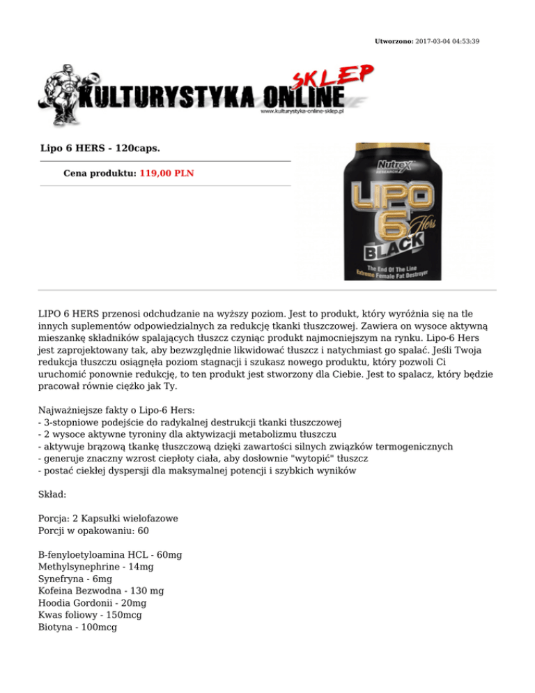 Utworzono: 2017-03-04 04:53:39 Lipo 6 HERS - 120caps. Cena produktu: 119,00 PLN LIPO 6 HERS przenosi odchudzanie na wyższy poziom. Jest to produkt, który wyróżnia się na tle innych suplementów odpowiedzialnych za redukcję tkanki tłuszczowej. Zawiera on wysoce aktywną mieszankę składników spalających tłuszcz czyniąc produkt najmocniejszym na rynku. Lipo-6 Hers jest zaprojektowany tak, aby bezwzględnie likwidować tłuszcz i natychmiast go spalać. Jeśli Twoja redukcja tłuszczu osiągnęła poziom stagnacji i szukasz nowego produktu, który pozwoli Ci uruchomić ponownie redukcję, to ten produkt jest stworzony dla Ciebie. Jest to spalacz, który będzie pracował równie ciężko jak Ty. Najważniejsze fakty o Lipo-6 Hers: - 3-stopniowe podejście do radykalnej destrukcji tkanki tłuszczowej - 2 wysoce aktywne tyroniny dla aktywizacji metabolizmu tłuszczu - aktywuje brązową tkankę tłuszczową dzięki zawartości silnych związków termogenicznych - generuje znaczny wzrost ciepłoty ciała, aby dosłownie "wytopić" tłuszcz - postać ciekłej dyspersji dla maksymalnej potencji i szybkich wyników Skład: Porcja: 2 Kapsułki wielofazowe Porcji w opakowaniu: 60 B-fenyloetyloamina HCL - 60mg Methylsynephrine - 14mg Synefryna - 6mg Kofeina Bezwodna - 130 mg Hoodia Gordonii - 20mg Kwas foliowy - 150mcg Biotyna - 100mcg Sposób dawkowania: 2 kapsułki rano i 2 po południu. Przyjmować najpóźniej na 6 godzin przed snem. Najlepiej spożywać minimum 30 minut przed posiłkiem. Używać w cyklach 8 tygodni stosowania i 4 tygodnie przerwy. Maksymalna dawka dzienna to 4 kapsułek. Nie przekraczać maksymalnej dawki dziennej. Adres: http://www.ko.sklep.pl/ Telefon: kom. 782 010 880 Email: [email protected]