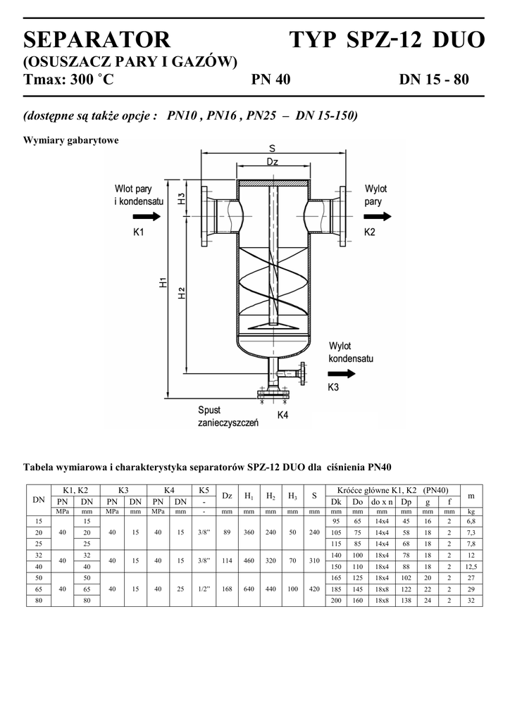 TYP SPZ-12 DUO SEPARATOR (OSUSZACZ PARY I GAZÓW) Tmax: 300 ˚C PN 40 DN 15 - 80 (dostępne są takŜe opcje : PN10 , PN16 , PN25 – DN 15-150) Wymiary gabarytowe Tabela wymiarowa i charakterystyka separatorów SPZ-12 DUO dla ciśnienia PN40 DN K1, K2 PN DN PN DN PN DN K5 - Dz H1 H2 H3 S MPa mm 15 MPa mm MPa mm - mm mm mm mm 40 20 40 15 40 15 3/8” 89 360 240 50 15 20 K3 K4 Króćce główne K1, K2 (PN40) g f Dk Do do x n Dp m mm mm 95 mm 65 mm 14x4 mm 45 mm 16 mm 2 kg 6,8 240 105 75 14x4 58 18 2 7,3 25 25 115 85 14x4 68 18 2 7,8 32 32 140 100 18x4 78 18 2 12 150 110 18x4 88 18 2 12,5 165 125 18x4 102 20 2 27 185 145 18x8 122 22 2 29 200 160 18x8 138 24 2 32 40 40 50 65 80 40 40 15 40 15 3/8” 114 460 320 70 310 50 40 65 80 40 15 40 25 1/2” 168 640 440 100 420 Charakterystyka i opis urządzenia: 1. Zakres stosowania Max nadciśnienie dopuszczalne: Nadciśnienie próbne : Max temperatura dopuszczalna: Naddatek na korozję: 2. Materiał Płaszcz / dna: Króćce / kołnierze: Zawirowywacz: 3. PS = 40 bar PT. = 90 bar TS = 300 0C c2 = 1,5 mm Stal kotłowa: P235GH / P265GH Stal węglowa: P235GH / C22.8 Stal węglowa: P235GH Wykonanie Przyłącza: standardowo kołnierzowe (patrz tabela) wg PN-EN 1092-1, przylga typu B1 ( przyłącza wg DIN lub ANSI jako opcja). Przyłącza spawane lub gwintowane - na Ŝyczenie. Zabezpieczenie przed korozją (opcja): zewnętrzne powierzchnie separatora mogą być ocynkowane galwanicznie lub zabezpieczone wg wytycznych odbiorcy. 4. Zastosowanie Separatory pary stosuje na wejściach do odbiorników ciepła, które wymagają zasilania parą dobrej jakości: suchą, pozbawioną zanieczyszczeń, lub zaraz za głównym zaworem kotłowym na wyjściu z kotła w celu wyłapania chwilowych przerzutów wody. Separatory powietrza (gazów) stosuje na wejściach do odbiorników powietrza ( aparatura pomiarowa, napędy pneumatyczne itp.), które wymagają zasilania powietrzem dobrej jakości: suchym, pozbawionym zanieczyszczeń. 5. Działanie Separator pary jest naczyniem ciśnieniowym, w którym zachodzi separacja kondensatu z przepływającej pary wodnej (powietrza). Wilgotna para (powietrze) wraz z zanieczyszczeniami dopływa do separatora (osuszacza) króćcem „K1” i dzięki zabudowanemu wewnątrz (na stałe) dwuspiralnemu zawirowywaczowi strugi zmienia kierunek przepływu. Siła odśrodkowa powoduje oddzielenie się cząstek o większej gęstości, a więc kondensatu i zanieczyszczeń stałych, które po ściankach spływają do dolnej części separatora. W dolnej części następuje równieŜ gwałtowna zmiana kierunku przepływającej pary (powietrza), przechodzącej z jednej spirali w drugą. Poprawia to radykalnie sprawność separatora (osuszacza). Para (powietrze) wypływa króćcem „K2”, zaś odseparowany kondensat i zanieczyszczenia spływają do dołu separatora i są odprowadzane na zewnątrz króćcami: - „K3”, na którym naleŜy zabudować najbardziej odporny na zanieczyszczenia odwadniacz. Króciec „K3” moŜe być skierowany w bok lub w dół, w zaleŜności od zastosowanego odwadniacza dzwonowego. - „K4”, który słuŜy do odprowadzania zanieczyszczeń, zakończony jest kołnierzem zaślepiającym, lecz moŜe być w dowolny sposób zmodyfikowany o dodatkową przestrzeń do gromadzenia się zanieczyszczeń lub zawór do opróŜniania nagromadzonego osadu. Króciec „K5” słuŜy do odpowietrzania separatora. (Wykonywany opcjonalnie). 6. Warunki bezpiecznej eksploatacji Ze względu na bezpieczeństwo obsługi, kołnierz spustowy naleŜy odkręcać po obniŜeniu ciśnienia do atmosferycznego w separatorze. Ze względu na wysokie temperatury pracy, separator powinien być zaizolowany. 7. Części zamienne Nie występują. 8. Zasady montaŜu Separator naleŜy montować na rurociągu jedynie w połoŜeniu pionowym (króćcem K4 w dół). Kierunek przepływu czynnika dla króćców K1 i K2 dowolny. 2