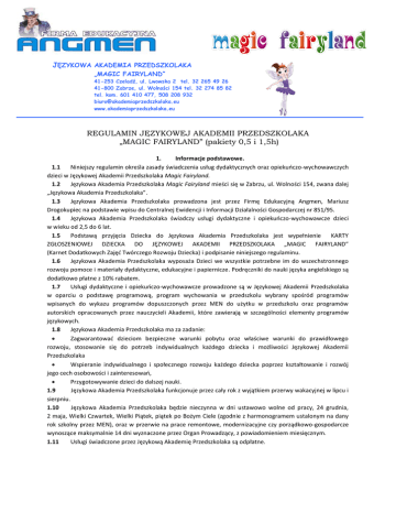 JĘZYKOWA AKADEMIA PRZEDSZKOLAKA „MAGIC FAIRYLAND” 41-253 Czeladź, ul. Lwowska 2 tel. 32 265 49 26 41-800 Zabrze, ul. Wolności 154 tel. 32 274 85 82 tel. kom. 601 410 477, 508 208 932 [email protected] www.akademiaprzedszkolaka.eu REGULAMIN JĘZYKOWEJ AKADEMII PRZEDSZKOLAKA „MAGIC FAIRYLAND” (pakiety 0,5 i 1,5h) 1. Informacje podstawowe. 1.1 Niniejszy regulamin określa zasady świadczenia usług dydaktycznych oraz opiekuńczo-wychowawczych dzieci w Językowej Akademii Przedszkolaka Magic Fairyland. 1.2 Językowa Akademia Przedszkolaka Magic Fairyland mieści się w Zabrzu, ul. Wolności 154, zwana dalej „Językowa Akademia Przedszkolaka”. 1.3 Językowa Akademia Przedszkolaka prowadzona jest przez Firmę Edukacyjną Angmen, Mariusz Drogokupiec na podstawie wpisu do Centralnej Ewidencji i Informacji Działalności Gospodarczej nr 851/95. 1.4 Językowa Akademia Przedszkolaka świadczy usługi dydaktyczne i opiekuńczo-wychowawcze dzieci w wieku od 2,5 do 6 lat. 1.5 Podstawą przyjęcia Dziecka do Językowa Akademia Przedszkolaka jest wypełnienie KARTY ZGŁOSZENIOWEJ DZIECKA DO JĘZYKOWEJ AKADEMII PRZEDSZKOLAKA „MAGIC FAIRYLAND” (Karnet Dodatkowych Zajęć Twórczego Rozwoju Dziecka) i podpisanie niniejszego regulaminu. 1.6 Językowa Akademia Przedszkolaka wyposaża Dzieci we wszystkie potrzebne im do wszechstronnego rozwoju pomoce i materiały dydaktyczne, edukacyjne i papiernicze. Podręczniki do nauki języka angielskiego są dodatkowo płatne z 10% rabatem. 1.7 Usługi dydaktyczne i opiekuńczo-wychowawcze prowadzone są w Językowej Akademii Przedszkolaka w oparciu o podstawę programową, program wychowania w przedszkolu wybrany spośród programów wpisanych do wykazu programów dopuszczonych przez MEN do użytku w przedszkolu oraz programów autorskich opracowanych przez nauczycieli Akademii, które zawierają w szczególności elementy programów językowych. 1.8 Językowa Akademia Przedszkolaka ma za zadanie: Zagwarantować dzieciom bezpieczne warunki pobytu oraz właściwe warunki do prawidłowego rozwoju, stosowanie się do potrzeb indywidualnych każdego dziecka i możliwości Językowej Akademii Przedszkolaka Wspieranie indywidualnego i społecznego rozwoju każdego dziecka poprzez kształtowanie i rozwój jego cech osobowości i zainteresowań, Przygotowywanie dzieci do dalszej nauki. 1.9 Językowa Akademia Przedszkolaka funkcjonuje przez cały rok z wyjątkiem przerwy wakacyjnej w lipcu i sierpniu. 1.10 Językowa Akademia Przedszkolaka będzie nieczynna w dni ustawowo wolne od pracy, 24 grudnia, 2 maja, Wielki Czwartek, Wielki Piątek, piątek po Bożym Ciele (zgodnie z harmonogramem ustalonym na dany rok szkolny przez MEN), oraz w przerwie na prace remontowe, modernizacyjne czy porządkowo-gospodarcze wynoszące maksymalnie 14 dni wyznaczone przez Organ Prowadzący, z powiadomieniem miesięcznym. 1.11 Usługi świadczone przez Językową Akademię Przedszkolaka są odpłatne. 2. Bezpieczeństwo Dzieci. 2.1 Do odebrania Dziecka upoważnieni są Rodzice lub Osoby będące prawnymi opiekunami Dziecka (nazywani dalej Rodzicami) oraz osoby, które zostały przez Rodziców wpisane do KARTY ZGŁOSZENIOWEJ DZIECKA, bądź po uprzednim osobistym powiadomieniu Językowej Akademii Przedszkolaka przez Rodziców o zmianie osoby odbierającej dziecko. 2.2 Nie ma możliwości telefonicznego wskazania osoby odbierającej Dziecko. 2.3 Osobom w stanie nietrzeźwym Dzieci nie będą wydawane. 2.4 Warunkiem przyjęcia dziecka do Językowej Akademii Przedszkolaka w danym dniu jest jego dobry stan zdrowia. Jeżeli u dziecka stwierdzony zostanie stan podgorączkowy lub jego samopoczucie będzie wskazywało na stan chorobowy rodzice zobowiązani są do zabrania dziecka z Językowej Akademii Przedszkolaka. 2.5 W przypadku nieobecności na zajęciach z powodu choroby Językowa Akademia Przedszkolaka zapewnia odpracowanie zajęć w innym terminie. Kiedy nieobecność ciągła spowodowana chorobą lub hospitalizacją trwa powyżej 2,5 tygodnia opłata podstawowa może ulec pomniejszeniu. Kwota ta ustalana jest indywidualnie w zależności od wybranego pakietu. 2.6 Językowa Akademia Przedszkolaka nie prowadzi opieki medycznej. Odpowiedzialność za wykonanie w odpowiednim terminie wszelkich zabiegów i procesów medycznych związanych ze zdrowiem dzieci między innymi szczepień ochronnych spoczywa na Rodzicach. W Językowej Akademii Przedszkolaka nie są podawane Dzieciom żadne lekarstwa, poza przypadkiem kiedy Dziecko cierpi na chorobę przewlekłą, a lekarz opiekujący się Dzieckiem oraz Rodzice Dziecka wyrażą na to pisemną zgodę zawierającą szczegółową informacją o dawkowaniu lekarstwa. 2.7 Ważne sprawy dotyczące Dzieci będą przekazywane bezpośrednio Rodzicom z poszanowaniem prawa do prywatności. 3. Organizacja. Nabór do Językowej Akademii Przedszkolaka trwa przez cały rok – w zależności od wolnych miejsc w 3.1 grupie. 3.2 Rodzice oddając Dziecko pod opiekę Językowej Akademii Przedszkolaka zobowiązani są dostarczyć buty zmienne. Ponadto do obowiązków Rodzica należy: Przyprowadzanie dziecka nie wcześniej niż na 15 minut przed planowanymi zajęciami i odbieranie dziecka zaraz po zakończonych zajęciach. Przyprowadzić dziecko czyste i estetycznie ubrane, Informowanie o wszelkich zmianach dotyczących dziecka podanych w Karcie Zgłoszeniowej Dziecka. 3.3 Pakiet 1,5 h oznacza udział dziecka w dodatkowych zajęciach (językowe, arte, umuzykalniające) raz lub 1 dwa razy w tygodniu (wtorki/czwartki lub poniedziałki/ środy) w godzinach 16:30 – 18:00* . 3.4 Pakiet 0,5 h oznacza udział w zajęciach języka angielskiego raz lub dwa razy w tygodniu 1 (wtorki/czwartki lub poniedziałki/środy) w godzinach 16:30 – 18:00* . 3.5 W pakietach 1,5h i 0,5h Językowa Akademia Przedszkolaka nie oferuje wyżywienia. 4. Opłaty podstawowe. 4.1 Opłatę za usługę (pakiety) Rodzice wpłacają do 10 dnia każdego miesiąca za dany miesiąc od października 