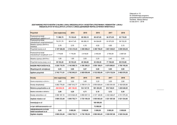Załącznik nr 10 do wieloletniego programu gospodarowania mieszkaniowym zasobem Miasta Złotoryi na lata 2014 – 2018 ZESTAWIENIE PRZYCHODÓW Z NAJMU LOKALI MIESZKALNYCH I KOSZTÓW UTRZYMANIA I REMONTÓW LOKALI MIESZKALNYCH W KOLEJNYCH LATACH Z UWZGLĘDNIENIEM WSPÓŁCZYNNIKA WINDYKACJI Przychód stan wyjściowy 2014 2015 2016 2017 2018 71 990,75 70 136,45 68 282,15 66 427,85 64 573,55 62 719,25 70 271,75 68 417,45 66 266,15 64 024,85 61 873,55 59 722,25 3,78 3,78 4,16 4,55 4,85 5,15 3 187 526,58 3 103 415,53 3 308 006,21 3 495 756,81 3 601 040,61 3 690 835,05 1 719,00 1 719,00 2 016,00 2 403,00 2 700,00 2 997,00 1,90 1,90 2,00 2,20 2,40 2,50 Przychód roczny (socj.) w zł 39 193,20 39 193,20 48 384,00 63 439,20 77 760,00 89 910,00 RAZEM PRZYCHÓD W ZŁ 3 226 719,78 3 142 608,73 3 356 390,21 3 559 196,01 3 678 800,61 3 780 745,05 Współczynnik windykacji 0,85 0,86 0,87 0,88 0,89 0,90 2 742 711,81 2 702 643,51 2 920 059,48 3 132 092,49 3 274 132,54 3 402 670,55 stan wyjściowy 2014 2015 2016 2017 2018 3,80 3,55 3,40 3,20 3,05 2,90 Koszty eksploatacji 3 282 778,20 2 987 812,77 2 785 911,72 2 550 829,44 2 363 391,93 2 182 629,90 Różnica przychodów w zł -540 066,39 -285 169,26 134 147,76 581 263,05 910 740,61 1 220 040,65 3,90 4,29 4,71 5,19 5,72 6,30 Koszty remontów w zł 3 369 167,10 3 610 624,45 3 859 307,12 4 137 126,50 4 432 328,47 4 741 575,30 dopłata miasta w zł 3 909 233,49 3 895 793,71 3 725 159,36 3 555 863,45 3 521 587,86 3 521 534,66 Powierzchnia lokali mieszkalnych ogółem w m² Powierzchnia lokali mieszkalnych oczynszowanych w m² czynszu zł/m²m-c Stawka (średnia) Przychód roczny w zł Powierzchnia lokali mieszkalnych socjalnych w m² Stawka czynszu zł/m²/m-c 0gółem przychód Koszty Stawka eksploatacji w zł/m/m-c Stawka remontów w zł/m/m-c Inwestycje w zł 180 000,00 w tym dofinansowanie w zł 72 000,00 odszkodowanie za brak lokali socjalnych w zł Ogółem dopłata 0,00 5 000,00 5 000,00 5 000,00 5 000,00 5 000,00 3 909 233,49 3 900 793,71 3 730 159,36 3 560 863,45 3 526 587,86 3 526 534,66 Powierzchnie 2014 - 2018 80 000,00 71 990,75 70 271,75 70 000,00 70 136,45 68 417,45 68 282,15 66 266,15 66 427,85 64 024,85 64 573,55 62 719,25 61 873,55 59 722,25 60 000,00 50 000,00 Powierzchnia lokali mieszkalnych ogółem w m² 40 000,00 Powierzchnia lokali mieszkalnych oczynszowanych w m² Powierzchnia lokali mieszkalnych socjalnych w m² 30 000,00 20 000,00 10 000,00 1 719,00 2 403,00 2 016,00 1 719,00 2 997,00 2 700,00 0,00 stan wyjściowy 2014 2015 2016 2017 2018 Przychody i koszty 2014 - 2018 5 000 000,00 4 500 000,00 4 000 000,00 Przychód roczny w zł 3 500 000,00 Przychód roczny (socj.) w zł 3 000 000,00 RAZEM PRZYCHÓD W ZŁ 2 500 000,00 Stawka eksploatacji w zł/m/m-c 2 000 000,00 Koszty remontów w zł 1 500 000,00 Koszty termomodernizacji w zł 1 000 000,00 dopłata miasta w zł 500 000,00 0,00 stan wyjściowy 2014 2015 2016 2017 2018