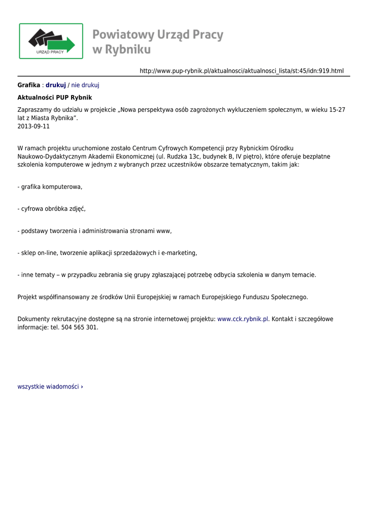 http://www.pup-rybnik.pl/aktualnosci/aktualnosci_lista/st:45/idn:919.html Grafika : drukuj / nie drukuj Aktualności PUP Rybnik Zapraszamy do udziału w projekcie „Nowa perspektywa osób zagrożonych wykluczeniem społecznym, w wieku 15-27 lat z Miasta Rybnika”. 2013-09-11 W ramach projektu uruchomione zostało Centrum Cyfrowych Kompetencji przy Rybnickim Ośrodku Naukowo-Dydaktycznym Akademii Ekonomicznej (ul. Rudzka 13c, budynek B, IV piętro), które oferuje bezpłatne szkolenia komputerowe w jednym z wybranych przez uczestników obszarze tematycznym, takim jak: - grafika komputerowa, - cyfrowa obróbka zdjęć, - podstawy tworzenia i administrowania stronami www, - sklep on-line, tworzenie aplikacji sprzedażowych i e-marketing, - inne tematy – w przypadku zebrania się grupy zgłaszającej potrzebę odbycia szkolenia w danym temacie. Projekt współfinansowany ze środków Unii Europejskiej w ramach Europejskiego Funduszu Społecznego. Dokumenty rekrutacyjne dostępne są na stronie internetowej projektu: www.cck.rybnik.pl. Kontakt i szczegółowe informacje: tel. 504 565 301. wszystkie wiadomości ›