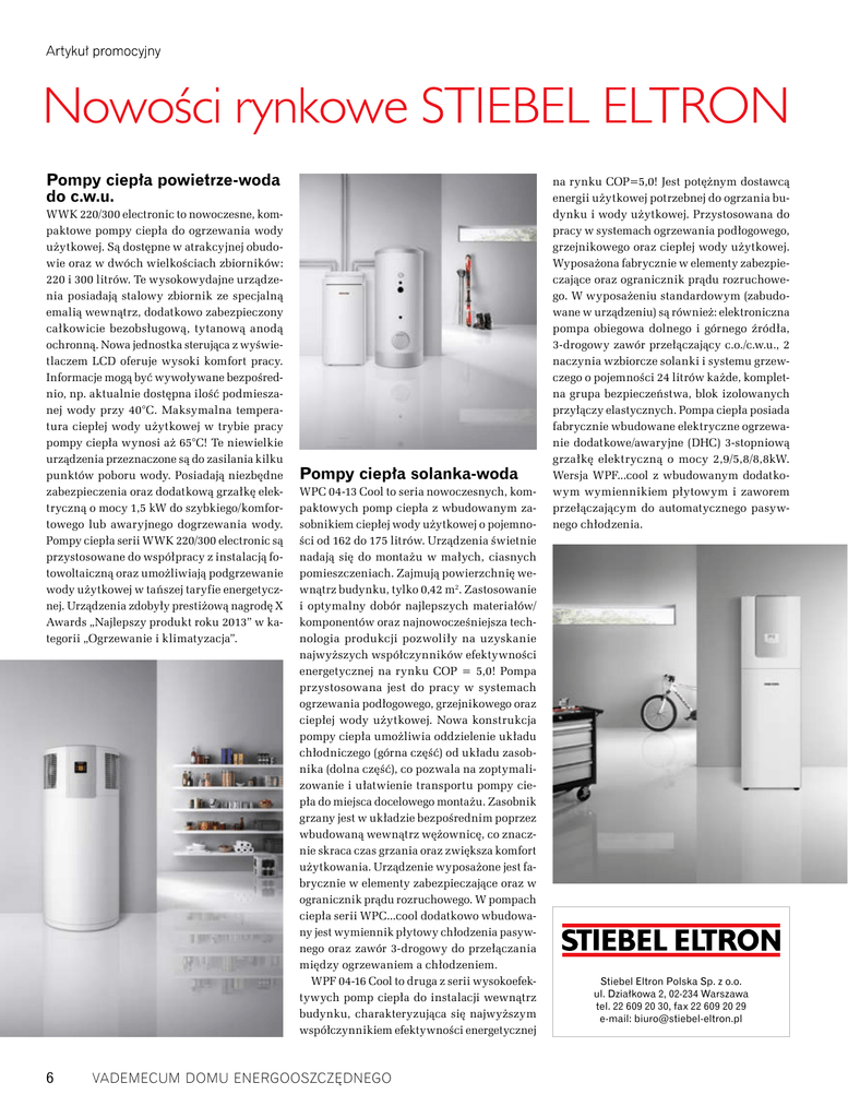 Artykuł promocyjny Nowości rynkowe STIEBEL ELTRON Pompy ciepła powietrze-woda do c.w.u. WWK 220/300 electronic to nowoczesne, kompaktowe pompy ciepła do ogrzewania wody użytkowej. Są dostępne w atrakcyjnej obudowie oraz w dwóch wielkościach zbiorników: 220 i 300 litrów. Te wysokowydajne urządzenia posiadają stalowy zbiornik ze specjalną emalią wewnątrz, dodatkowo zabezpieczony całkowicie bezobsługową, tytanową anodą ochronną. Nowa jednostka sterująca z wyświetlaczem LCD oferuje wysoki komfort pracy. Informacje mogą być wywoływane bezpośrednio, np. aktualnie dostępna ilość podmieszanej wody przy 40°C. Maksymalna temperatura ciepłej wody użytkowej w trybie pracy pompy ciepła wynosi aż 65°C! Te niewielkie urządzenia przeznaczone są do zasilania kilku punktów poboru wody. Posiadają niezbędne zabezpieczenia oraz dodatkową grzałkę elektryczną o mocy 1,5 kW do szybkiego/komfortowego lub awaryjnego dogrzewania wody. Pompy ciepła serii WWK 220/300 electronic są przystosowane do współpracy z instalacją fotowoltaiczną oraz umożliwiają podgrzewanie wody użytkowej w tańszej taryfie energetycznej. Urządzenia zdobyły prestiżową nagrodę X Awards „Najlepszy produkt roku 2013” w kategorii „Ogrzewanie i klimatyzacja”. 6 Pompy ciepła solanka-woda WPC 04-13 Cool to seria nowoczesnych, kompaktowych pomp ciepła z wbudowanym zasobnikiem ciepłej wody użytkowej o pojemności od 162 do 175 litrów. Urządzenia świetnie nadają się do montażu w małych, ciasnych pomieszczeniach. Zajmują powierzchnię wewnątrz budynku, tylko 0,42 m2. Zastosowanie i optymalny dobór najlepszych materiałów/ komponentów oraz najnowocześniejsza technologia produkcji pozwoliły na uzyskanie najwyższych współczynników efektywności energetycznej na rynku COP = 5,0! Pompa przystosowana jest do pracy w systemach ogrzewania podłogowego, grzejnikowego oraz ciepłej wody użytkowej. Nowa konstrukcja pompy ciepła umożliwia oddzielenie układu chłodniczego (górna część) od układu zasobnika (dolna część), co pozwala na zoptymalizowanie i ułatwienie transportu pompy ciepła do miejsca docelowego montażu. Zasobnik grzany jest w układzie bezpośrednim poprzez wbudowaną wewnątrz wężownicę, co znacznie skraca czas grzania oraz zwiększa komfort użytkowania. Urządzenie wyposażone jest fabrycznie w elementy zabezpieczające oraz w ogranicznik prądu rozruchowego. W pompach ciepła serii WPC...cool dodatkowo wbudowany jest wymiennik płytowy chłodzenia pasywnego oraz zawór 3-drogowy do przełączania między ogrzewaniem a chłodzeniem. WPF 04-16 Cool to druga z serii wysokoefektywych pomp ciepła do instalacji wewnątrz budynku, charakteryzująca się najwyższym współczynnikiem efektywności energetycznej Vademecum domu energooszczędnego na rynku COP=5,0! Jest potężnym dostawcą energii użytkowej potrzebnej do ogrzania budynku i wody użytkowej. Przystosowana do pracy w systemach ogrzewania podłogowego, grzejnikowego oraz ciepłej wody użytkowej. Wyposażona fabrycznie w elementy zabezpieczające oraz ogranicznik prądu rozruchowego. W wyposażeniu standardowym (zabudowane w urządzeniu) są również: elektroniczna pompa obiegowa dolnego i górnego źródła, 3-drogowy zawór przełączający c.o./c.w.u., 2 naczynia wzbiorcze solanki i systemu grzewczego o pojemności 24 litrów każde, kompletna grupa bezpieczeństwa, blok izolowanych przyłączy elastycznych. Pompa ciepła posiada fabrycznie wbudowane elektryczne ogrzewanie dodatkowe/awaryjne (DHC) 3-stopniową grzałkę elektryczną o mocy 2,9/5,8/8,8kW. Wersja WPF...cool z wbudowanym dodatkowym wymiennikiem płytowym i zaworem przełączającym do automatycznego pasywnego chłodzenia. Stiebel Eltron Polska Sp. z o.o. ul. Działkowa 2, 02-234 Warszawa tel. 22 609 20 30, fax 22 609 20 29 e-mail: [email protected]