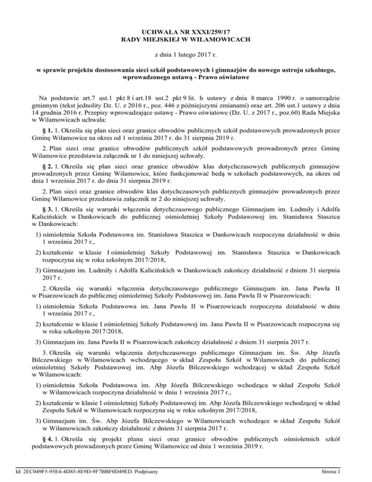 UCHWAŁA NR XXXI/259/17 RADY MIEJSKIEJ W WILAMOWICACH z dnia 1 lutego 2017 r. w sprawie projektu dostosowania sieci szkół podstawowych i gimnazjów do nowego ustroju szkolnego, wprowadzonego ustawą - Prawo oświatowe Na podstawie art.7 ust.1 pkt 8 i art.18 ust.2 pkt 9 lit. h ustawy z dnia 8 marca 1990 r. o samorządzie gminnym (tekst jednolity Dz. U. z 2016 r., poz. 446 z późniejszymi zmianami) oraz art. 206 ust.1 ustawy z dnia 14 grudnia 2016 r. Przepisy wprowadzające ustawę - Prawo oświatowe (Dz. U. z 2017 r., poz.60) Rada Miejska w Wilamowicach uchwala: § 1. 1. Określa się plan sieci oraz granice obwodów publicznych szkół podstawowych prowadzonych przez Gminę Wilamowice na okres od 1 września 2017 r. do 31 sierpnia 2019 r. 2. Plan sieci oraz granice obwodów publicznych szkół podstawowych prowadzonych przez Gminę Wilamowice przedstawia załącznik nr 1 do niniejszej uchwały. § 2. 1. Określa się plan sieci oraz granice obwodów klas dotychczasowych publicznych gimnazjów prowadzonych przez Gminę Wilamowice, które funkcjonować bedą w szkołach podstawowych, na okres od dnia 1 września 2017 r. do dnia 31 sierpnia 2019 r. 2. Plan sieci oraz granice obwodów klas dotychczasowych publicznych gimnazjów prowadzonych przez Gminę Wilamowice przedstawia załącznik nr 2 do niniejszej uchwały. § 3. 1. Określa się warunki włączenia dotychczasowego publicznego Gimnazjum im. Ludmiły i Adolfa Kalicińskich w Dankowicach do publicznej ośmioletniej Szkoły Podstawowej im. Stanisława Staszica w Dankowicach: 1) ośmioletnia Szkoła Podstawowa im. Stanisława Staszica w Dankowicach rozpoczyna działalność w dniu 1 września 2017 r., 2) kształcenie w klasie I ośmioletniej Szkoły Podstawowej im. Stanisława Staszica w Dankowicach rozpoczyna się w roku szkolnym 2017/2018, 3) Gimnazjum im. Ludmiły i Adolfa Kalicińskich w Dankowicach zakończy działalność z dniem 31 sierpnia 2017 r. 2. Określa się warunki włączenia dotychczasowego publicznego Gimnazjum im. Jana Pawła II w Pisarzowicach do publicznej ośmioletniej Szkoły Podstawowej im. Jana Pawła II w Pisarzowicach: 1) ośmioletnia Szkoła Podstawowa im. Jana Pawła II w Pisarzowicach rozpoczyna działalność w dniu 1 września 2017 r., 2) kształcenie w klasie I ośmioletniej Szkoły Podstawowej im. Jana Pawła II w Pisarzowicach rozpoczyna się w roku szkolnym 2017/2018, 3) Gimnazjum im. Jana Pawła II w Pisarzowicach zakończy działalność z dniem 31 sierpnia 2017 r. 3. Określa się warunki włączenia dotychczasowego publicznego Gimnazjum im. Św. Abp Józefa Bilczewskiego w Wilamowicach wchodzącego w skład Zespołu Szkół w Wilamowicach do publicznej ośmioletniej Szkoły Podstawowej im. Abp Józefa Bilczewskiego wchodzącej w skład Zespołu Szkół w Wilamowicach: 1) ośmioletnia Szkoła Podstawowa im. Abp Józefa Bilczewskiego wchodząca w skład Zespołu Szkół w Wilamowicach rozpoczyna działalność w dniu 1 września 2017 r., 2) kształcenie w klasie I ośmioletniej Szkoły Podstawowej im. Abp Józefa Bilczewskiego wchodzącej w skład Zespołu Szkół w Wilamowicach rozpoczyna się w roku szkolnym 2017/2018, 3) Gimnazjum im. Św. Abp Józefa Bilczewskiego w Wilamowicach wchodzące w skład Zespołu Szkół w Wilamowicach zakończy działalność z dniem 31 sierpnia 2017 r. § 4. 1. Określa się projekt planu sieci oraz granice obwodów publicznych ośmioletnich szkół podstawowych prowadzonych przez Gminę Wilamowice od dnia 1 września 2019 r. Id: 2EC049F5-95E4-4D85-8E9D-9F7BBF0D49ED. Podpisany Strona 1 2. Projekt planu sieci oraz granice obwodów publicznych ośmioletnich szkoł podstawowych prowadzonych przez Gminę Wilamowice przedstawia załącznik nr 3 do niniejszej uchwały. § 5. Wykonanie uchwały powierza się Burmistrzowi Wilamowic. § 6. Uchwałę podaje się do publicznej wiadomości poprzez umieszczenie na tablicy ogłoszeń w Urzędzie Gminy w Wilamowicach oraz w Biuletynie Informacji Publicznej. Przewodniczący Rady Miejskiej Stanisław Nycz Id: 2EC049F5-95E4-4D85-8E9D-9F7BBF0D49ED. Podpisany Strona 2 Załącznik Nr 1 do Uchwały Nr XXXI/259/17 Rady Miejskiej w Wilamowicach z dnia 1 lutego 2017 r. Plan sieci oraz granice obwodów publicznych szkół podstawowych prowadzonych przez Gminę Wilamowice na okres od dnia 1 września 2017 r. do dnia 31 sierpnia 2019 r. L.p. 1. 2. 3. 4. 5. Nazwa szkoły Szkoła Podstawowa im. Stanisława Staszica w Dankowicach Szkoła Podstawowa im. Henryka Sienkiewicza w Hecznarowicach wchodząca w skład Zespołu Szkolno-Przedszkolnego w Hecznarowicach Szkoła Podstawowa im. Jana Pawła II w Pisarzowicach Szkoła Podstawowa im. Ks. Kanonika Stefana Wojtyłki w Starej Wsi wchodząca w skład Zespołu SzkolnoPrzedszkolnego w Starej Wsi Szkoła Podstawowa im. Abp Józefa Bilczewskiego w Wilamowicach wchodząca w skład Zespołu Szkół w Wilamowicach Adres szkoły Dankowice, ul. Szkolna 4 zasięg terytorialny (granice obwodu) Sołectwo Dankowice Hecznarowice, ul. Krakowska 110 Sołectwo Hecznarowice Pisarzowice, ul. Św. Floriana 28 Stara Wieś, ul. Dolna 12 Sołectwo Pisarzowice Wilamowice, ul. Rynek 14 Miasto Wilamowice, Sołectwo Zasole Bielańskie Id: 2EC049F5-95E4-4D85-8E9D-9F7BBF0D49ED. Podpisany Sołectwo Stara Wieś Strona 1 Załącznik Nr 2 do Uchwały Nr XXXI/259/17 Rady Miejskiej w Wilamowicach z dnia 1 lutego 2017 r. Plan sieci oraz granice obwodów klas dotychczasowych publicznych gimnazjów prowadzonych przez Gminę Wilamowice, które funkcjonować bedą w szkołach podstawowych na okres od dnia 1 września 2017 r. do dnia 31 sierpnia 2019 r. L.p. 1. 2. 3. Nazwa szkoły Klasy gimnazjalne w Szkole Podstawowej im. Stanisława Staszica w Dankowicach Klasy gimnazjalne w Szkole Podstawowej im. Jana Pawła II w Pisarzowicach Klasy gimnazjalne w Szkole Podstawowej im. Abp Józefa Bilczewskiego w Wilamowicach wchodzącej w skład Zespołu Szkół w Wilamowicach Id: 2EC049F5-95E4-4D85-8E9D-9F7BBF0D49ED. Podpisany Adres szkoły Dankowice